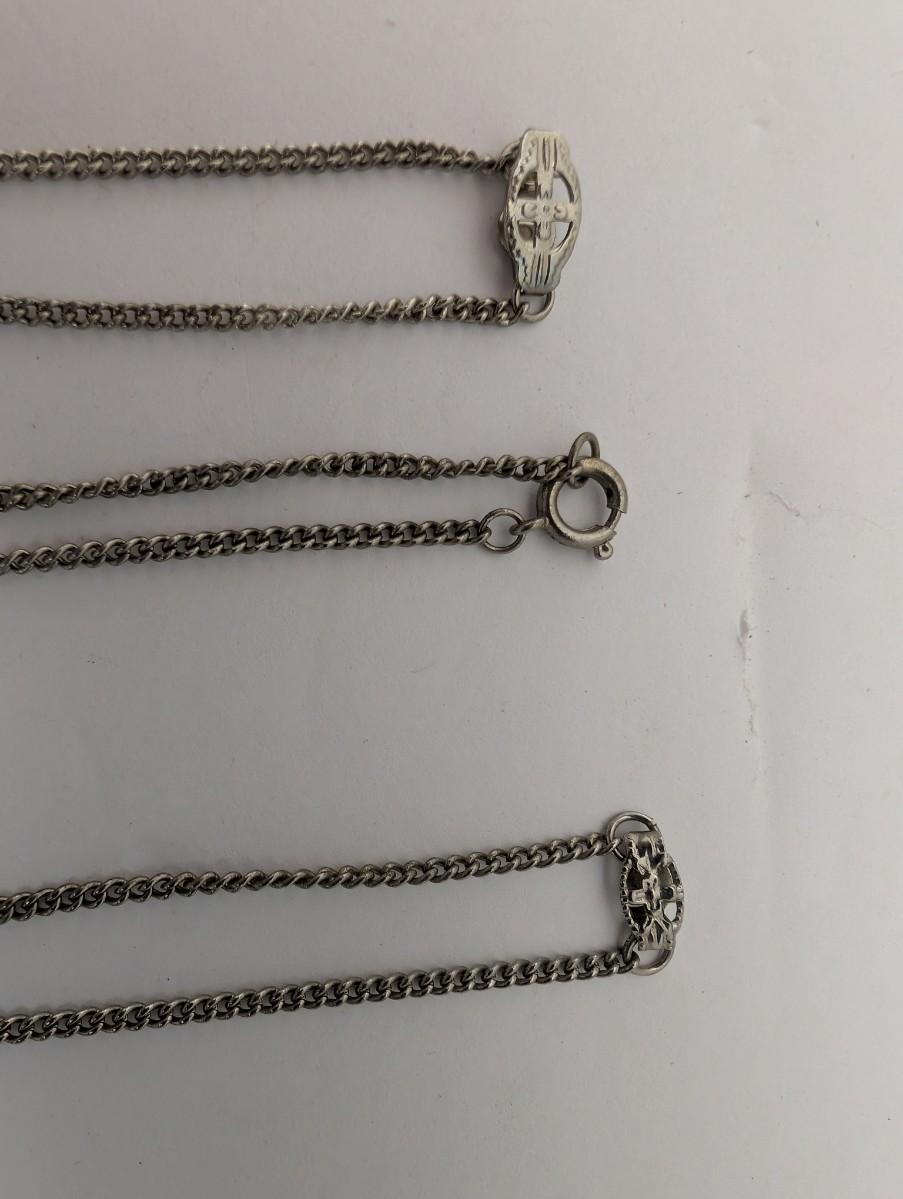 Lot of three vintage silver tone cross necklaces, each featuring unique rhinestone settings. Includes one with aurora borealis baguette stones and two with clear rhinestones in ornate filigree and floral designs. Each on matching chain with vintage-style clasps. Elegant religious jewelry for collection or wear.