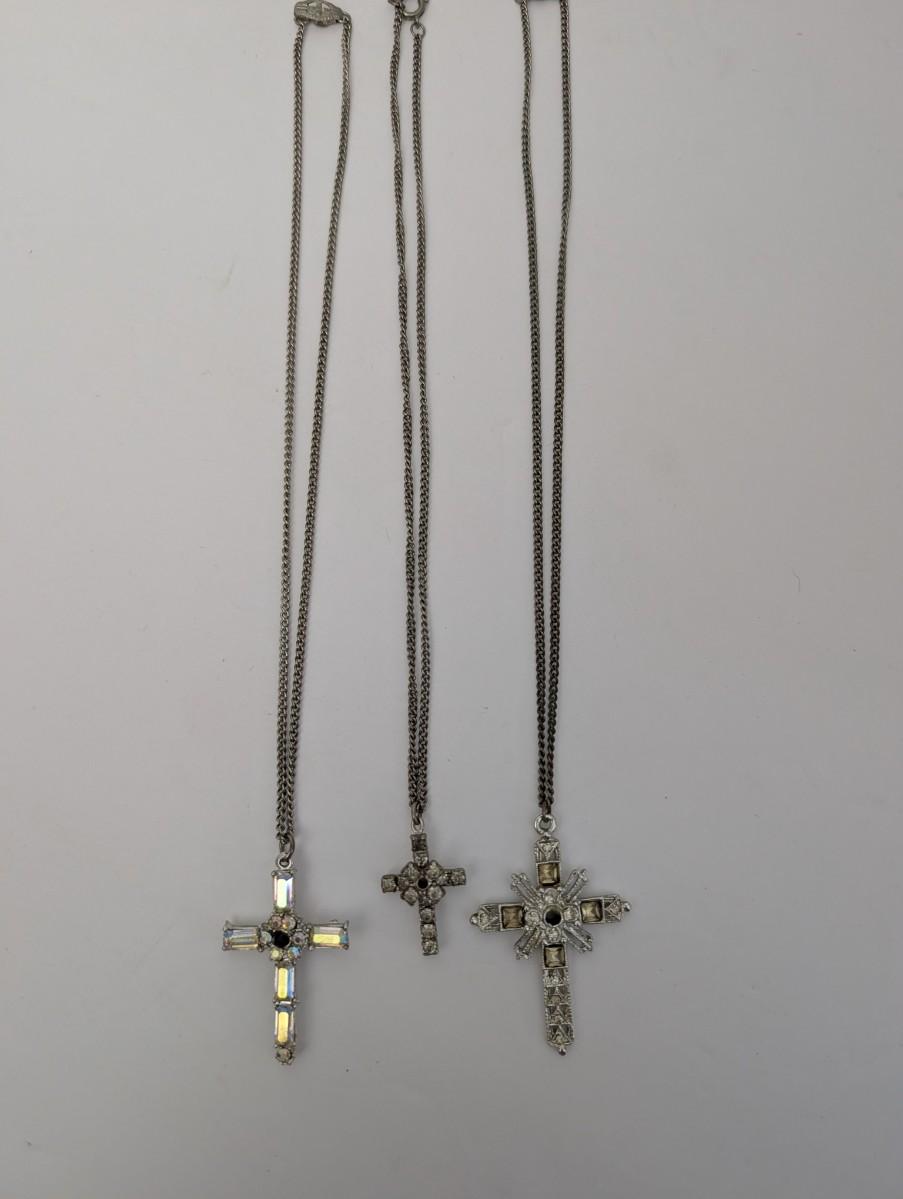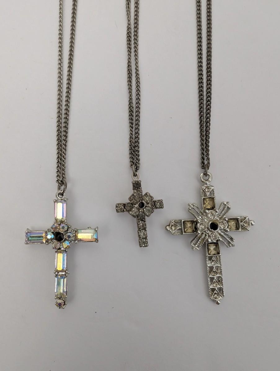 vintage jewelry, rhinestone cross, cross necklace lot, aurora borealis, silver tone, religious pendant, Christian jewelry, vintage necklace, rhinestone pendant, costume jewelry, collectible crosses