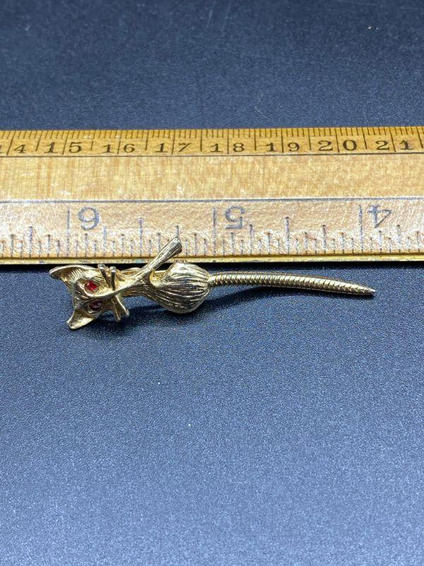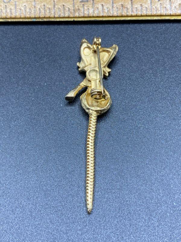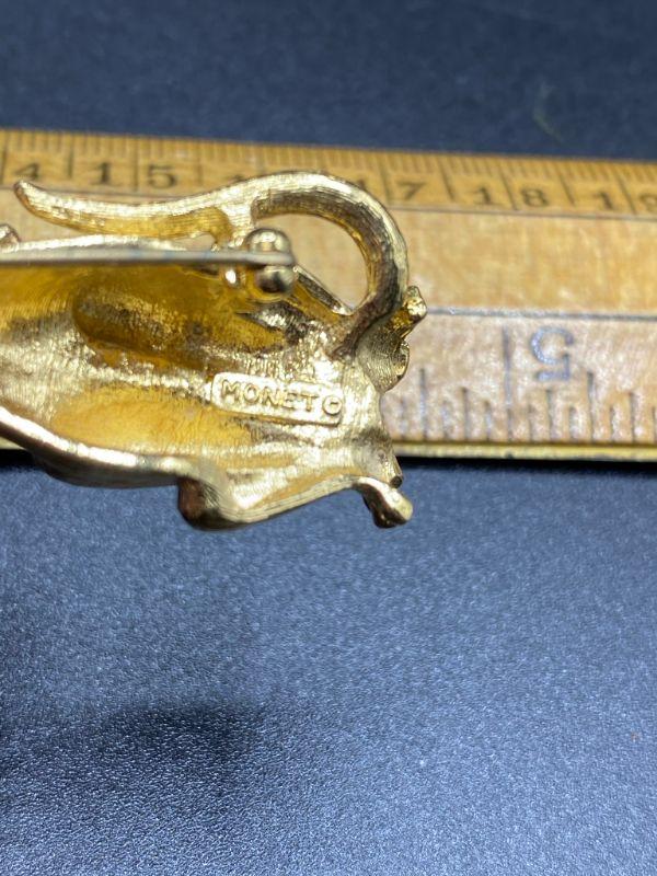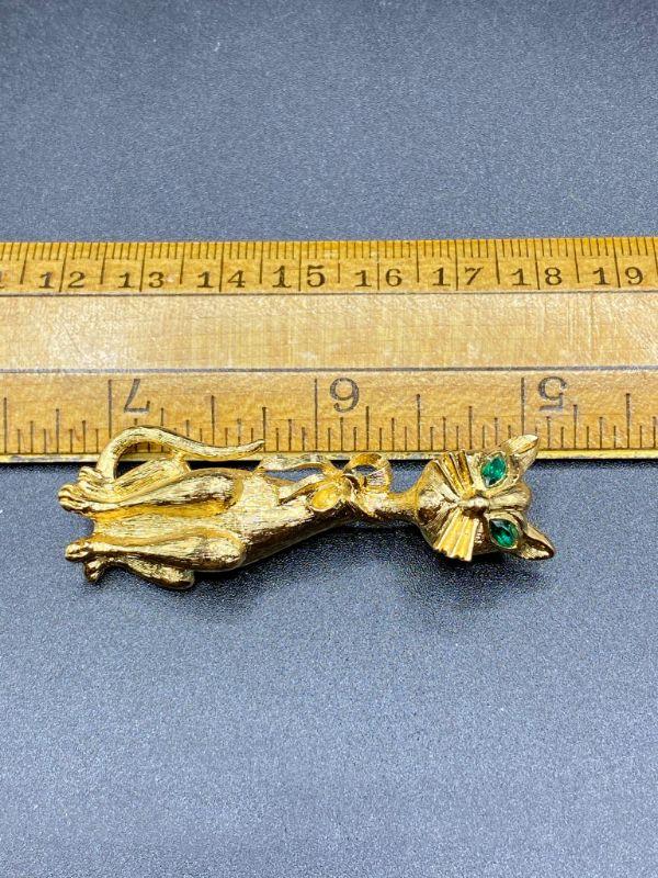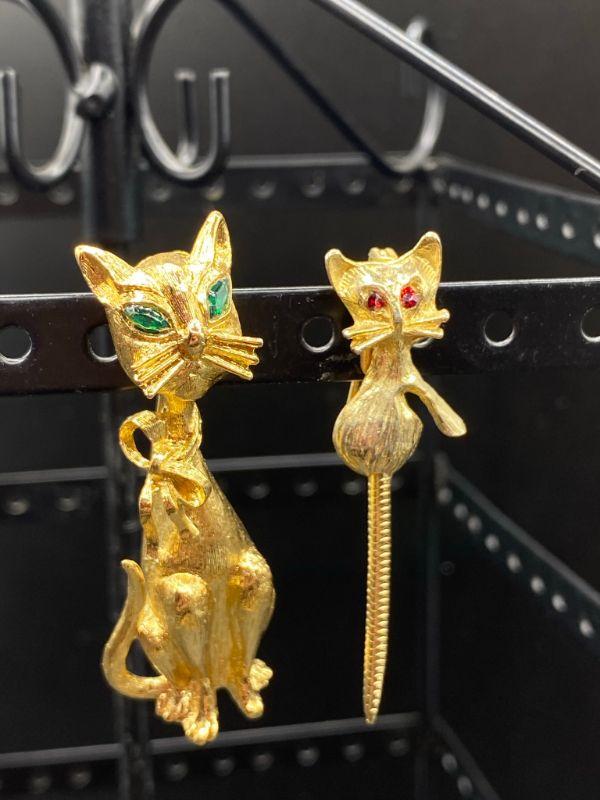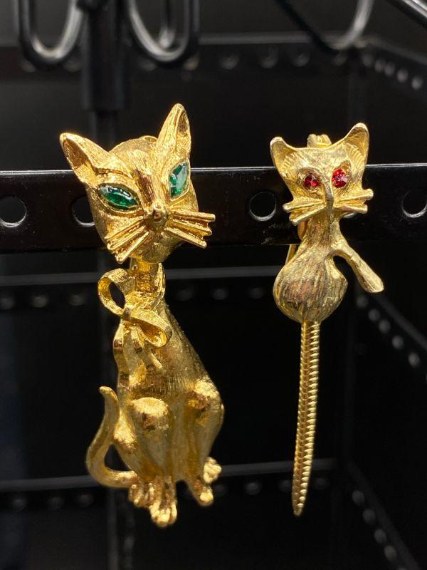 Pair of vintage cat pins. Gold tone textured metal, rhinestone eyes. The larger one is Monet, the smaller is unbranded. Good vintage condition.