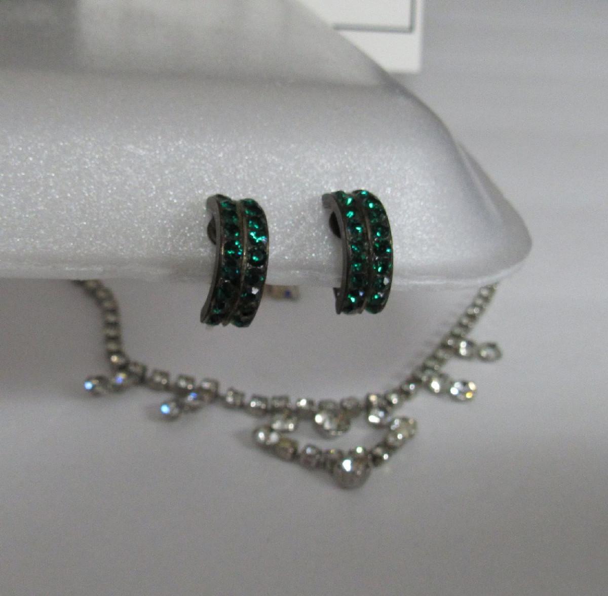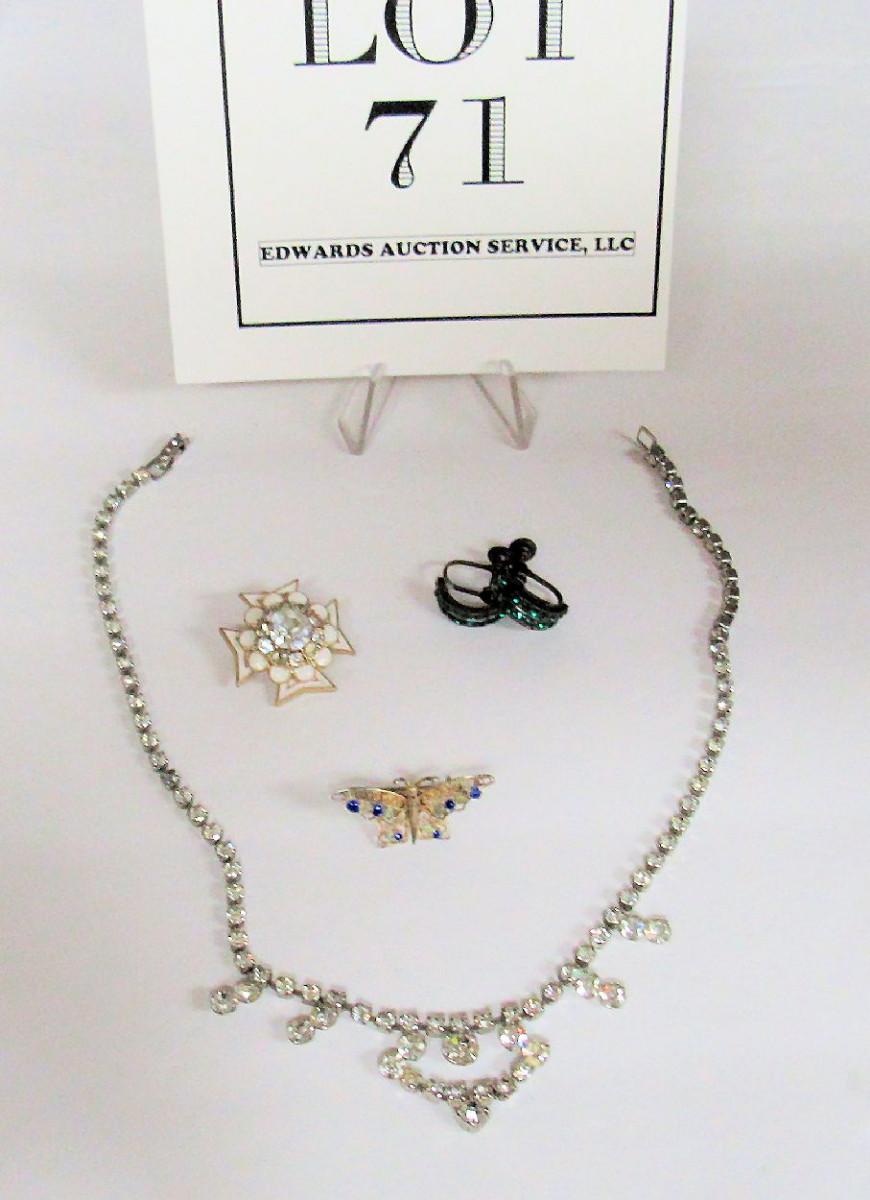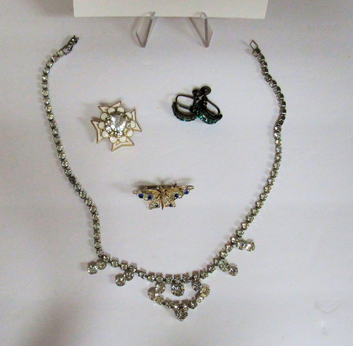 Vintage Rhinestone Lot, Necklace, Green Earrings, CORO Pin, Butterlfy Pin