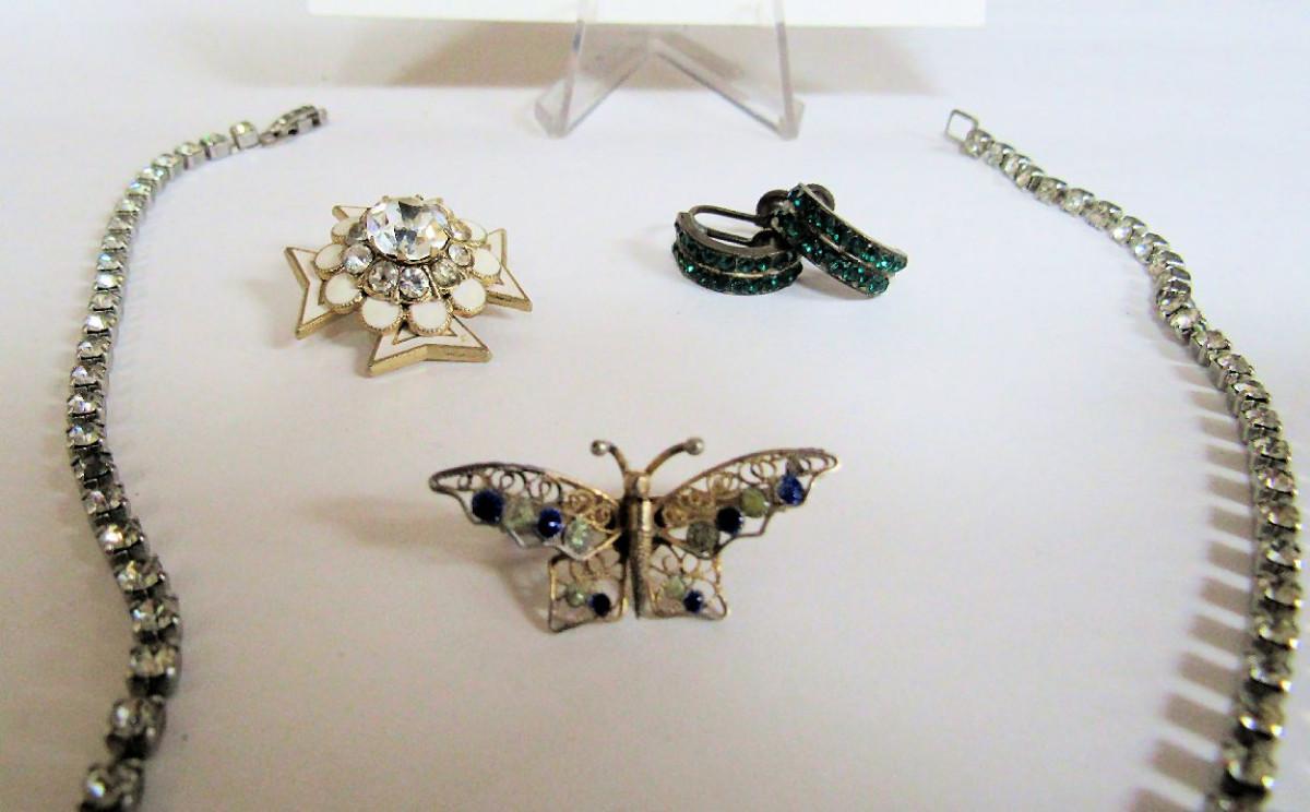 The top stone on the pin and some in the necklace are turning dark for some reason. The butterfly pin looks like it is marked but I can't make it out. Some jewelry needs a very good cleaning. We did not check stones for chips or looseness. Shipping is available at shipping cost plus $5.00 handling fee on one box, $10.00 handling fee on two boxes, $15.00 handling fee on 3 boxes. Helps cover shipping materials and labor cost. You will receive exact item as pictured, no refunds, returns not accepted. Do not bid if you do not intend to pay for your lots or the shipping/handling fees.