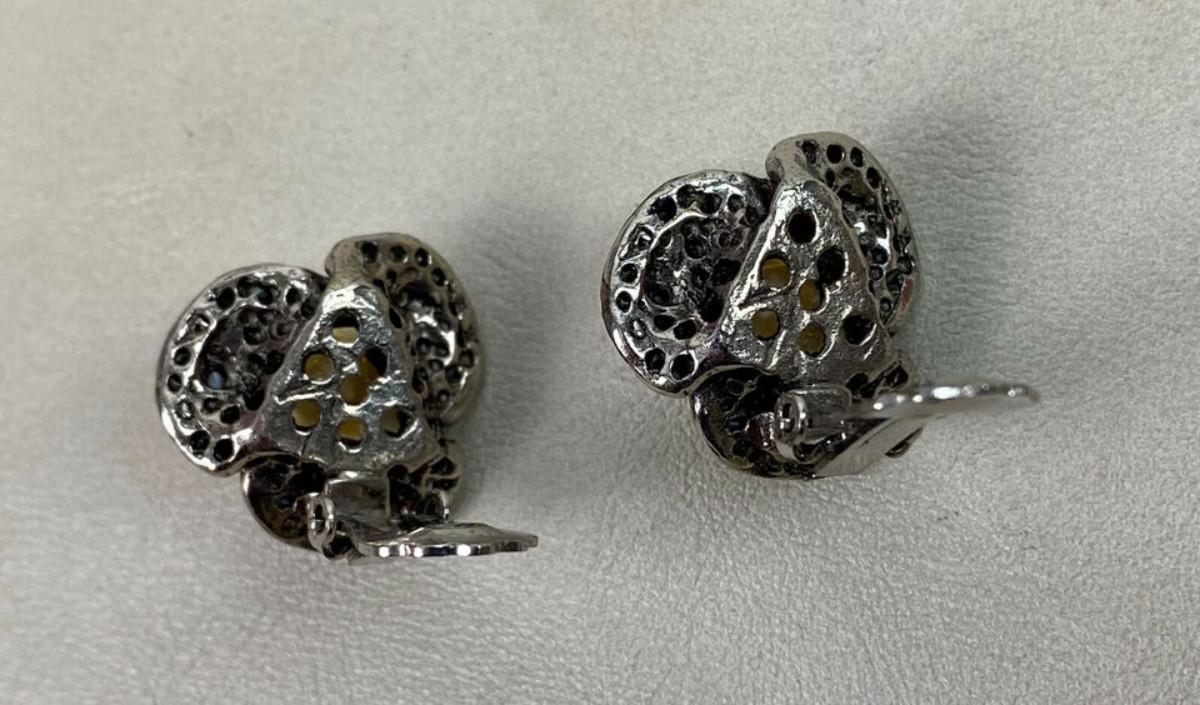 flashy vintage clipon earrings we came across at a recent estate sale...The overall condition is good but one of the earrings is missing one rhinestone...Large faux pearls in center...7/8"/22mm...Silver tone settings...Unknown maker.