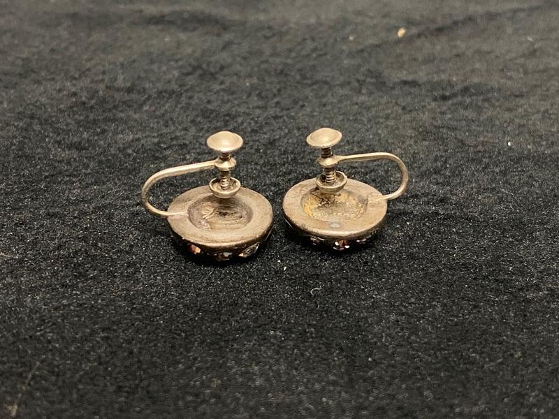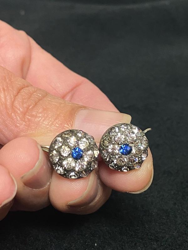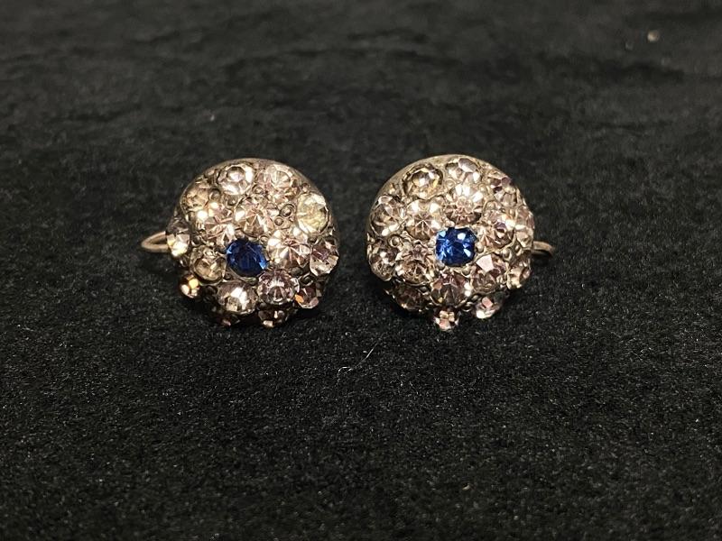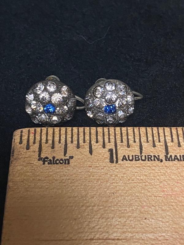 Vintage rhinestone screwback earrings. Little button earrings covered in clear stones with a blue stone in the center. Silvertone metal setting. Metal shows age, it has lost its shine.