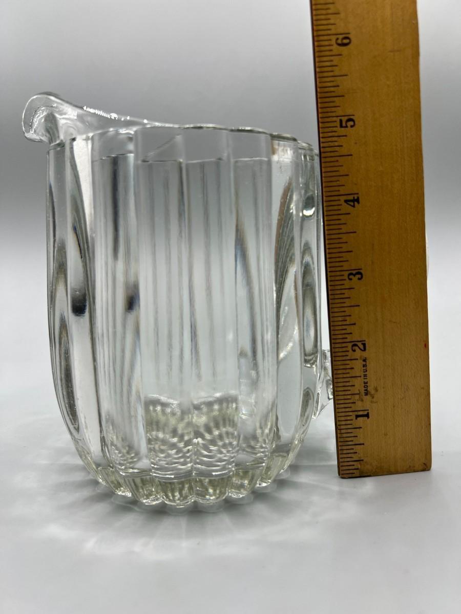 Vintage Ribbed Glass Hobnail Bottom Jeannette Glass Pitcher, there is no signifncant damage to the glass and is in good vintage condition. Check pictures for more details and for sizing.