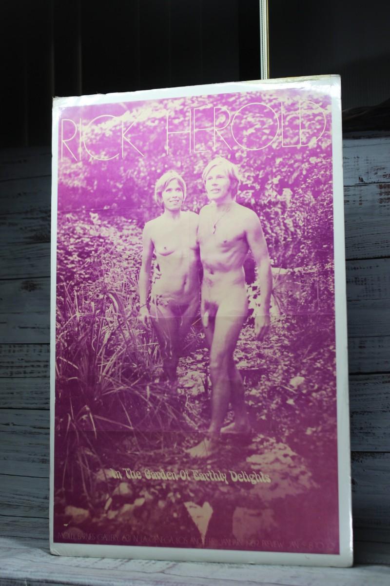 Vintage Rick Herold In the Garden of Earthly Delights Molly Barnes Gallery Los Angeles Promo Poster, there are some crease marks from where it's been folded before, other than some slight rips there is no other significant damage to the poster and is in good condition. Check pictures for more details and for sizing