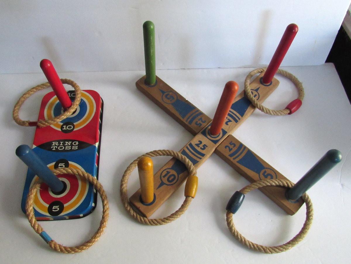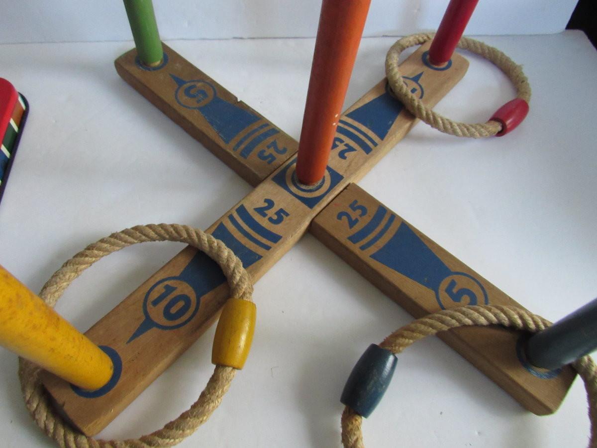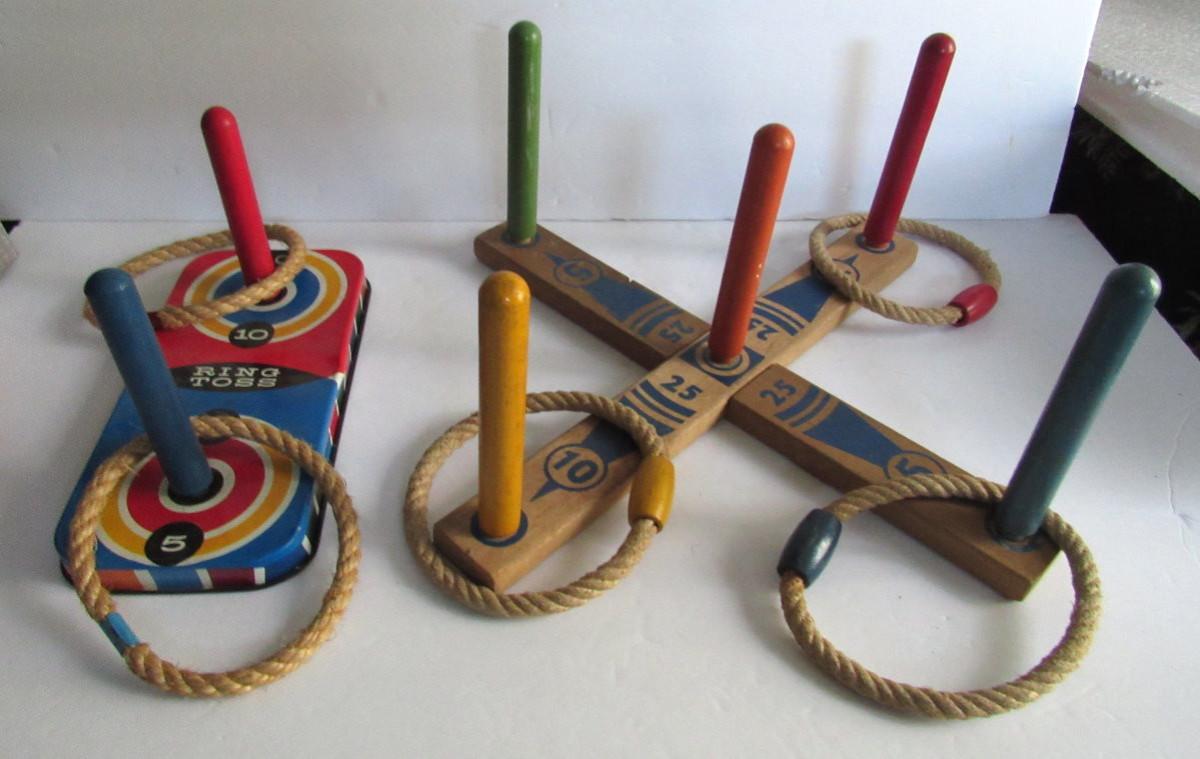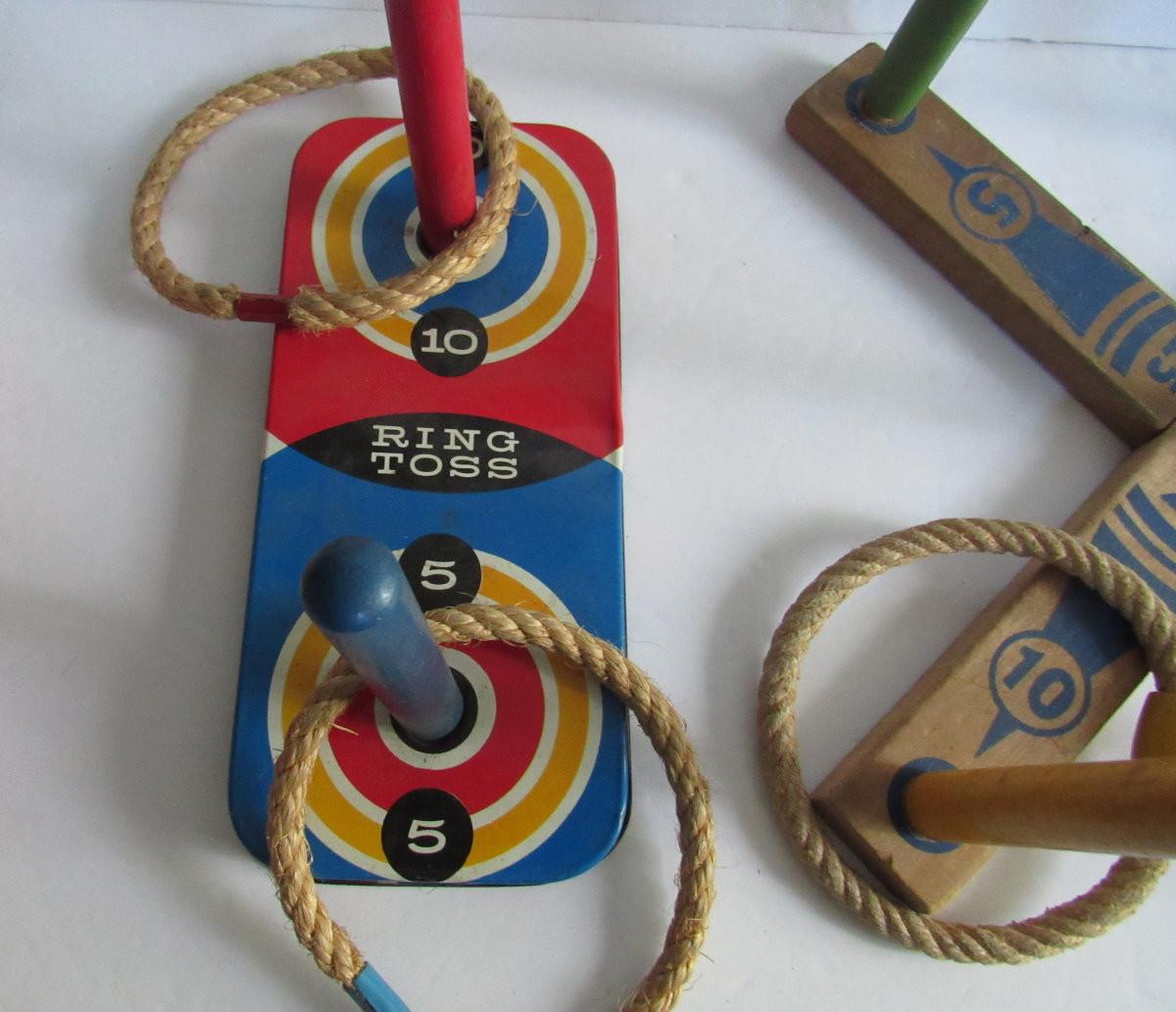 Sold previously but not paid for. Tin base with 2 posts and rings, good shape. Wood base with 5 posts and only 3 rings. Nice shape overall.