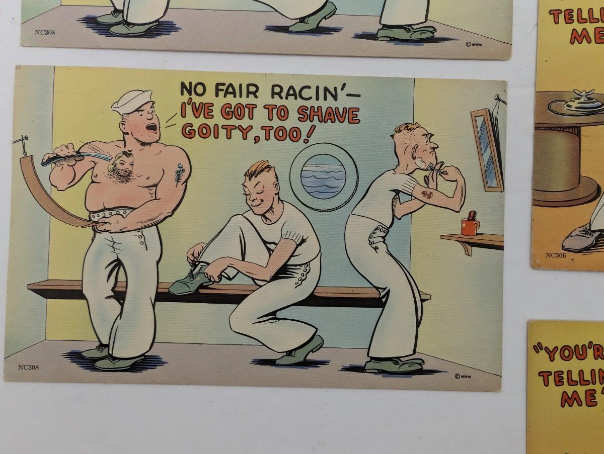 Set of 5 vintage comic postcards featuring cheeky sailor-themed illustrations with playful risqué humor. These midcentury-style cards include captions like “No Fair Racin’ I’ve Got to Shave Copy Too” and “You’re Telling Me! The Fleet’s in Honey,” capturing a nostalgic pin-up era vibe. Unused with divided backs, they are ideal for collectors of vintage postcards, military-themed ephemera, or humorous risqué art. Perfect for framing, gifting, or adding character to a postcard collection.