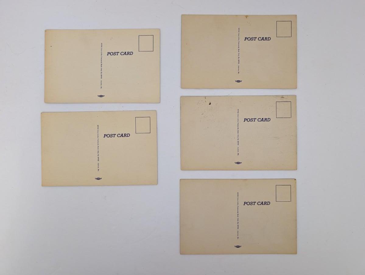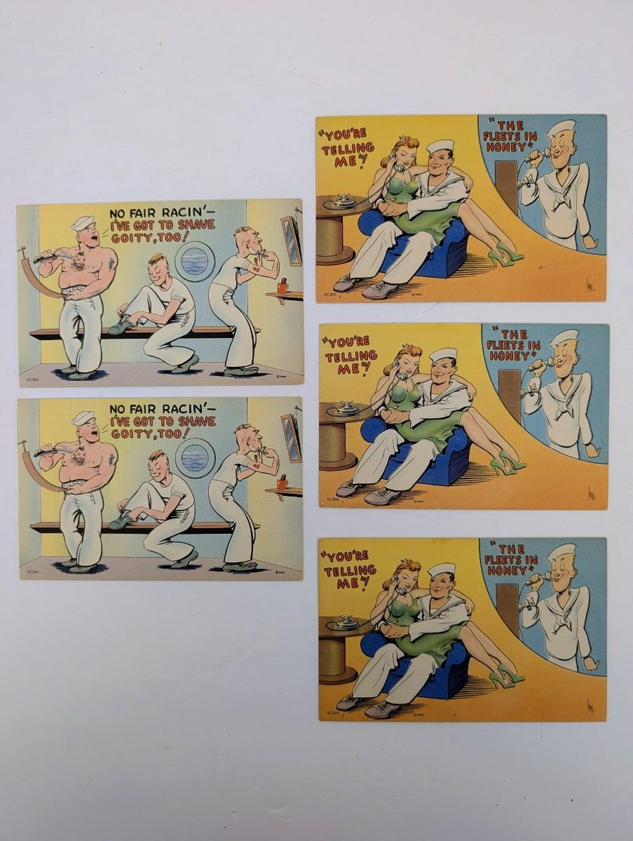 Set of 5 vintage comic postcards featuring cheeky sailor-themed illustrations with playful risqué humor. These midcentury-style cards include captions like “No Fair Racin’ I’ve Got to Shave Copy Too” and “You’re Telling Me! The Fleet’s in Honey,” capturing a nostalgic pin-up era vibe. Unused with divided backs, they are ideal for collectors of vintage postcards, military-themed ephemera, or humorous risqué art. Perfect for framing, gifting, or adding character to a postcard collection.