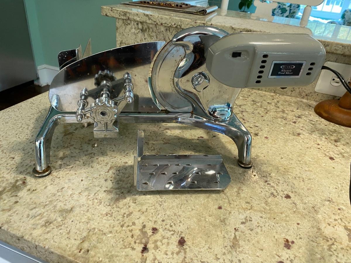 Vintage Rival 65301 old but still working heavy duty electric Meat Deli / Food Slicer. Wonderful way to prepare your own food at home. Slice deli thin meats, bacon, poultry, cheese and lots of other things with this wonderful machine. It is chrome plated and extremely heavy duty. It has been tested and operational. Excellent condition, very little wear. No rust. A quality food slicer that was seldom used.