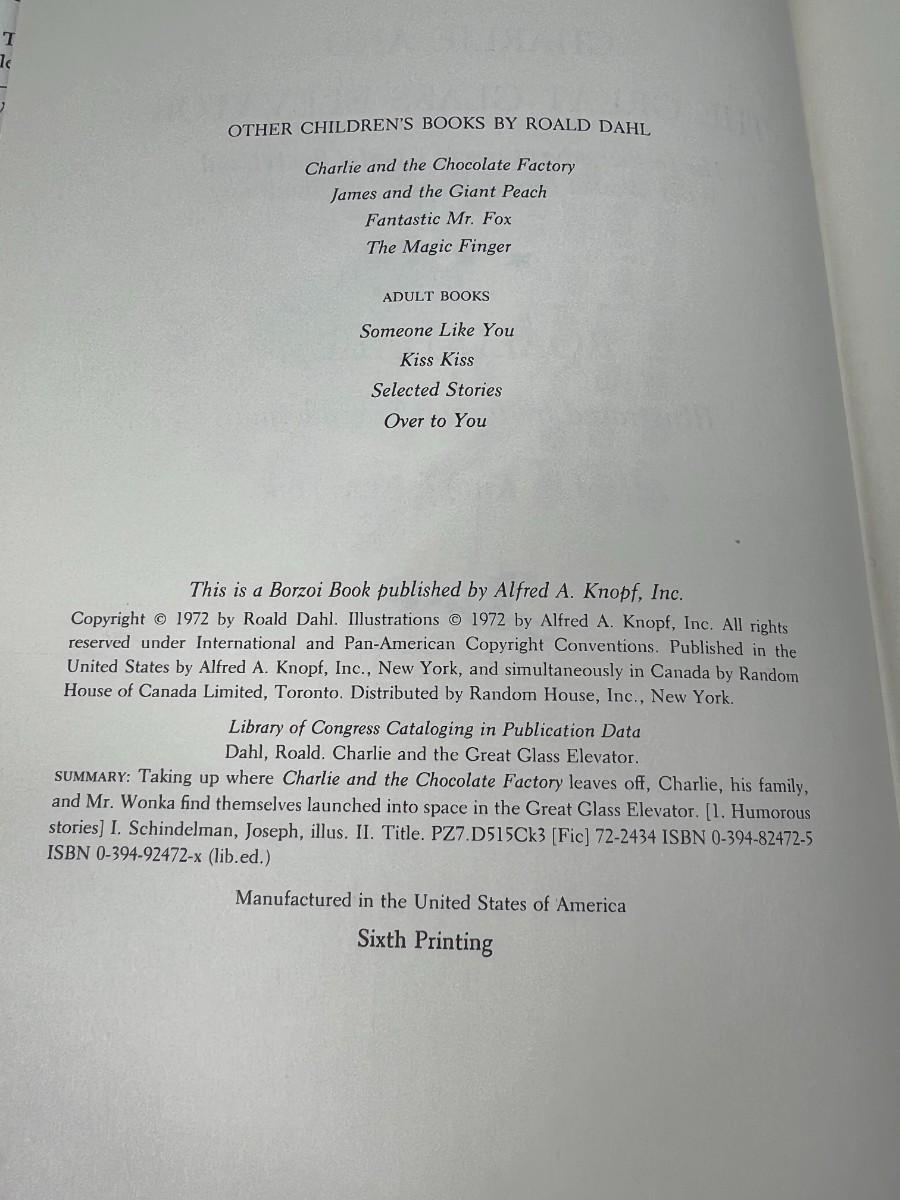 Vintage Roald Dahl Book Charlie and the Great Glass Elevator Sixth Printing Classic Book