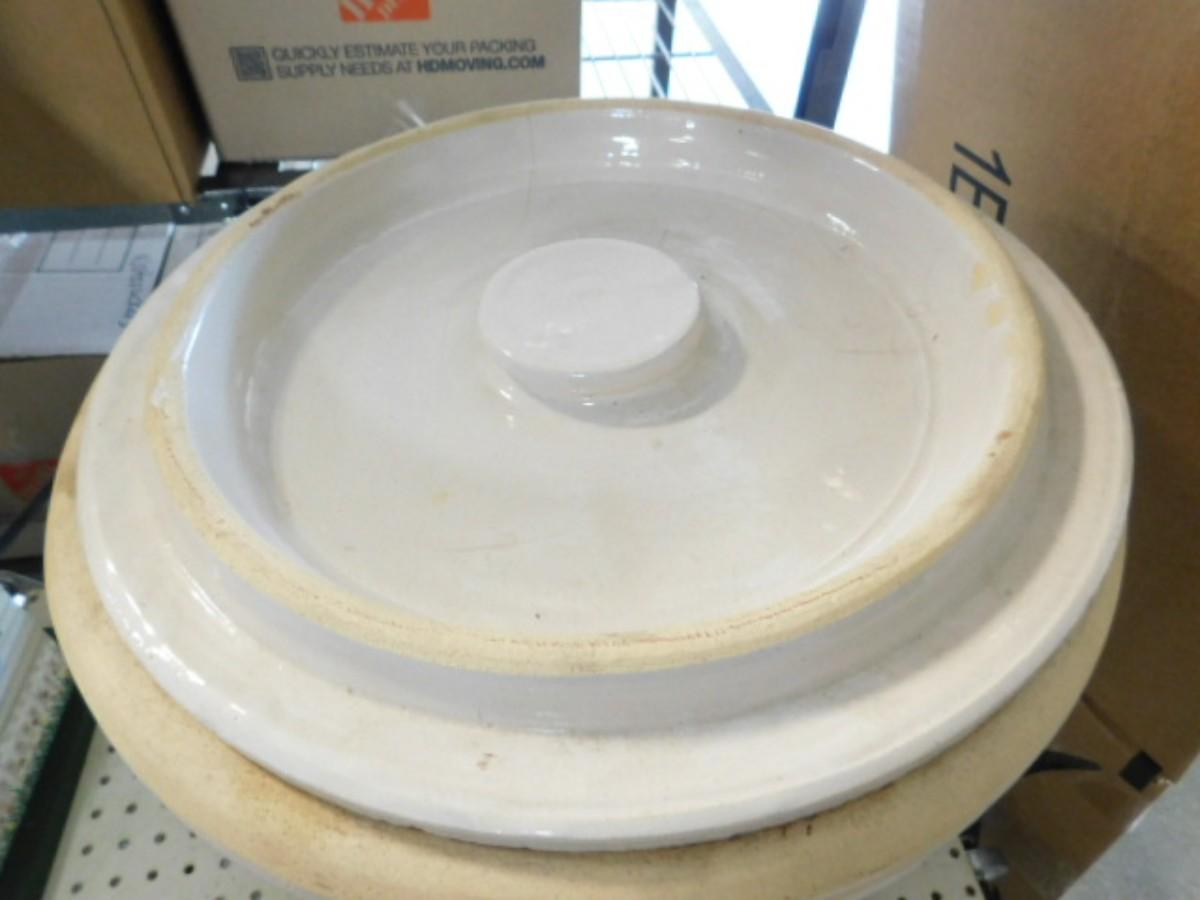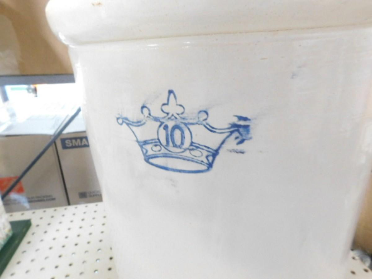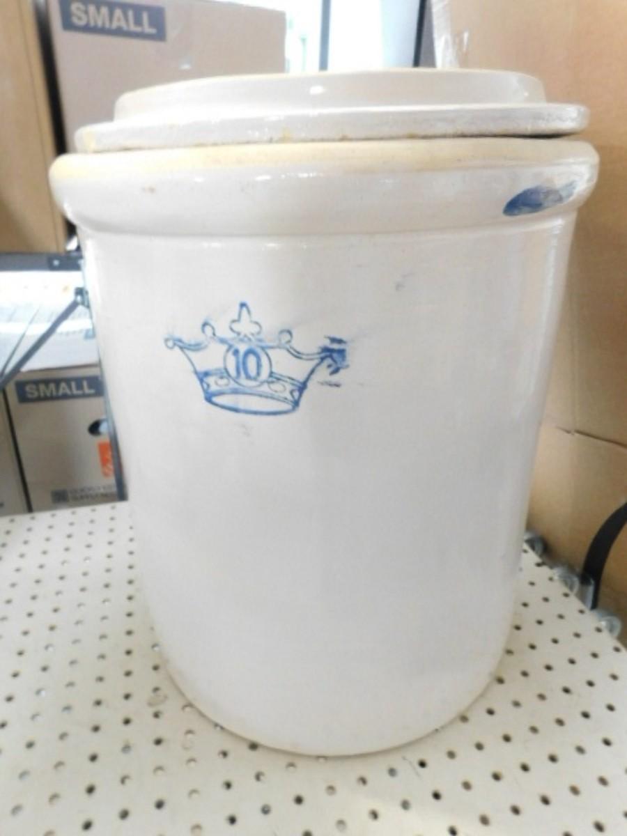 Vintage Robinson Ransbottom #10 Crock with Lid. The lid has cracks as shown with a minor imperfection on inside lip of crock as shown