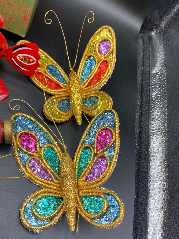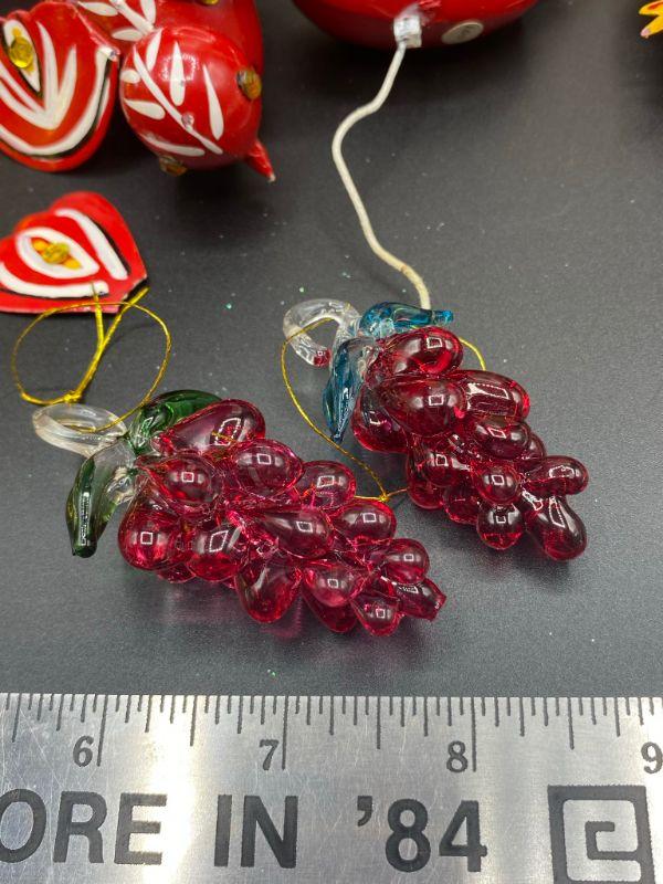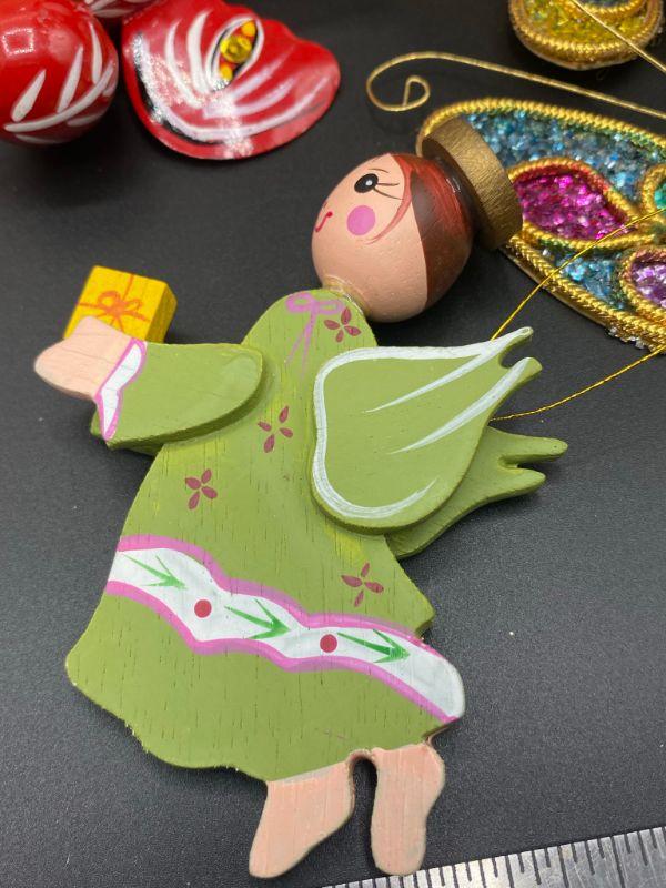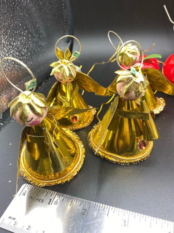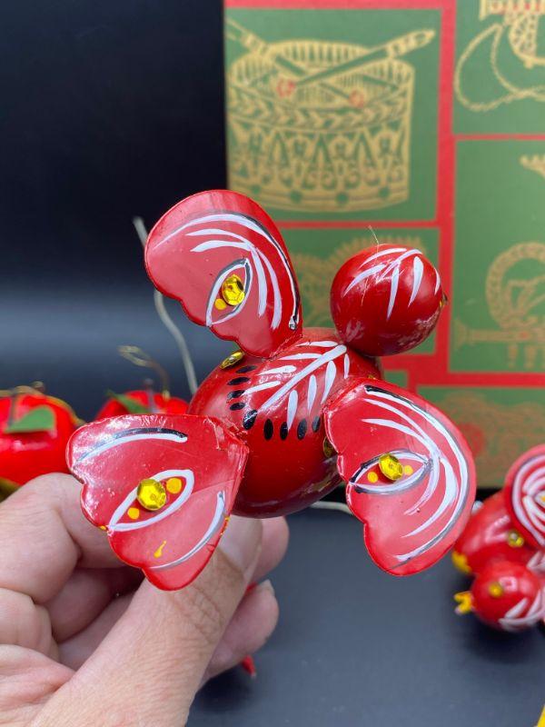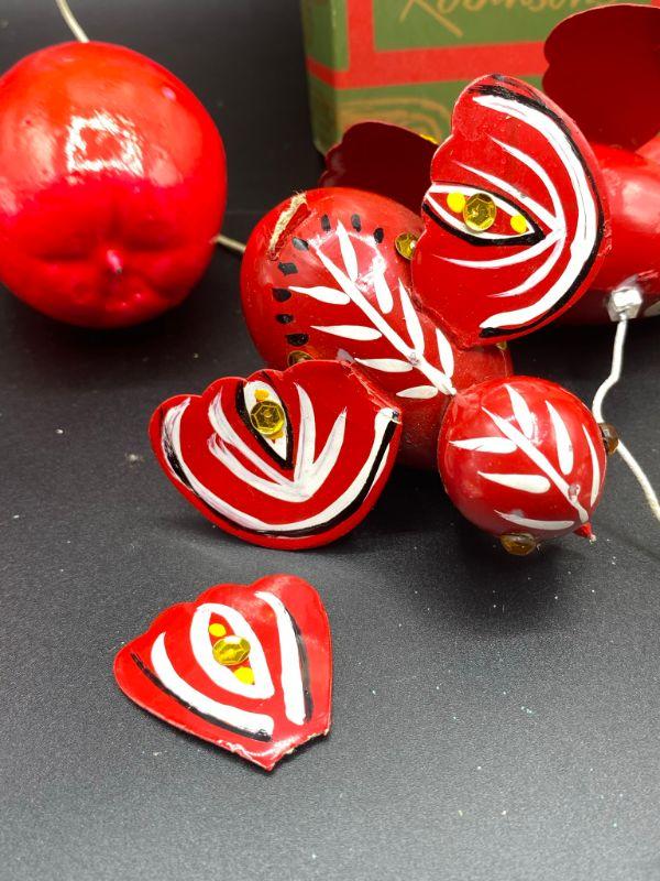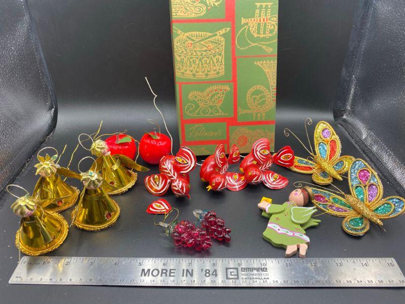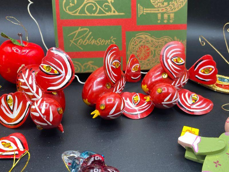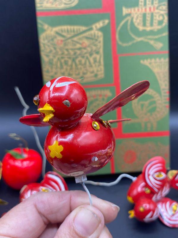 Vintage Robinson's shoe box of vintage holiday decorations. Everything seen is everything that was kept in the box. The box is even holiday themed. Fair vintage cnditions.