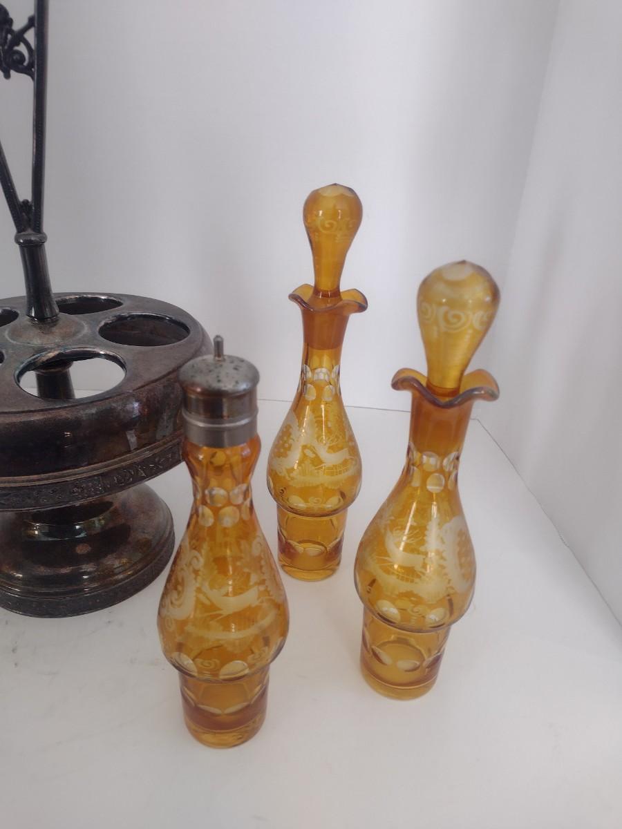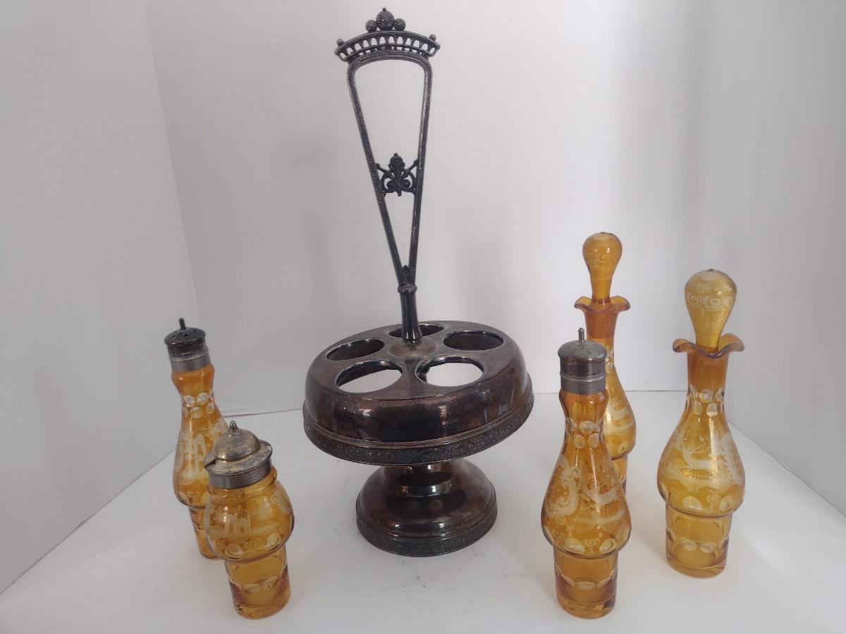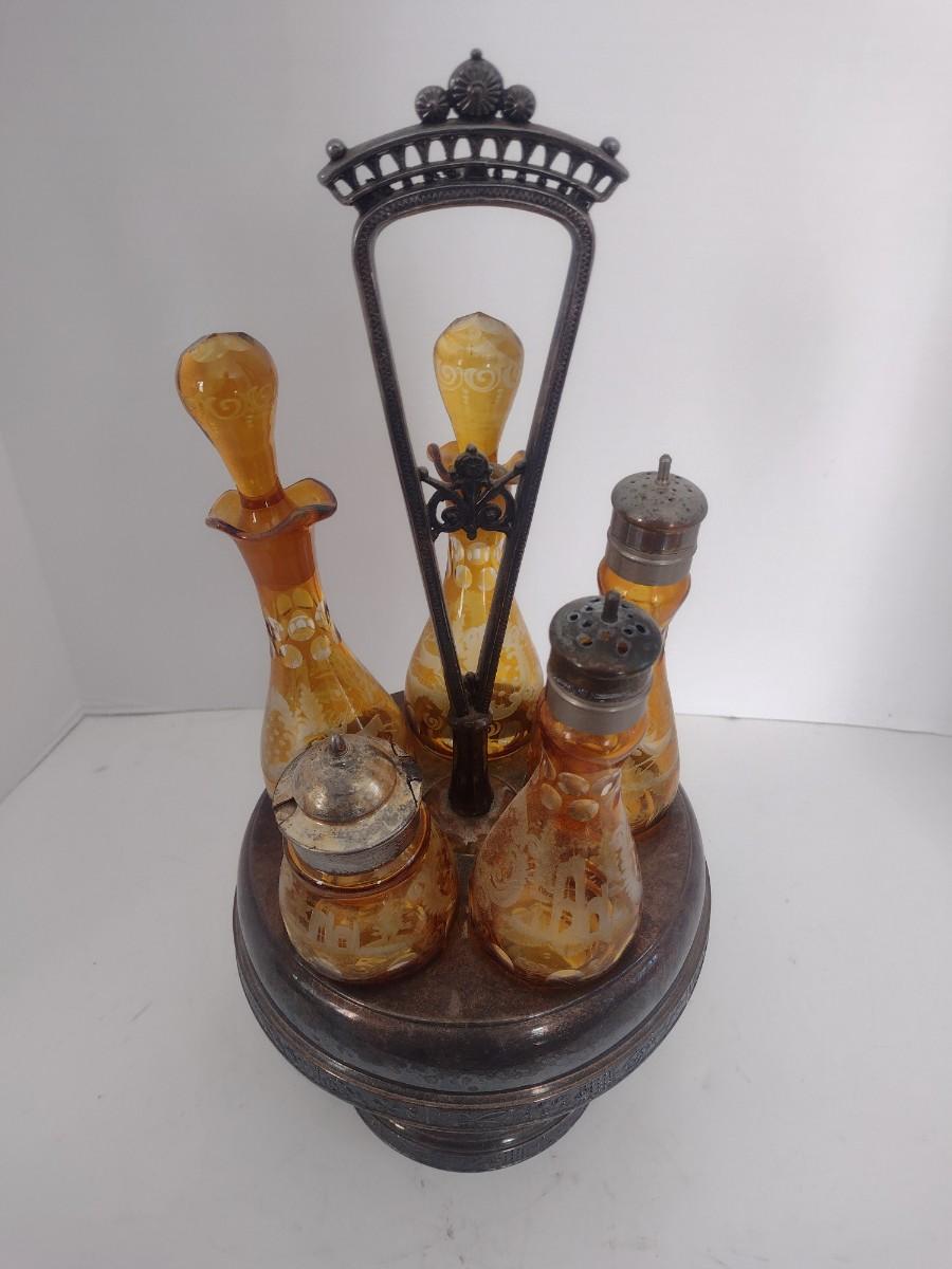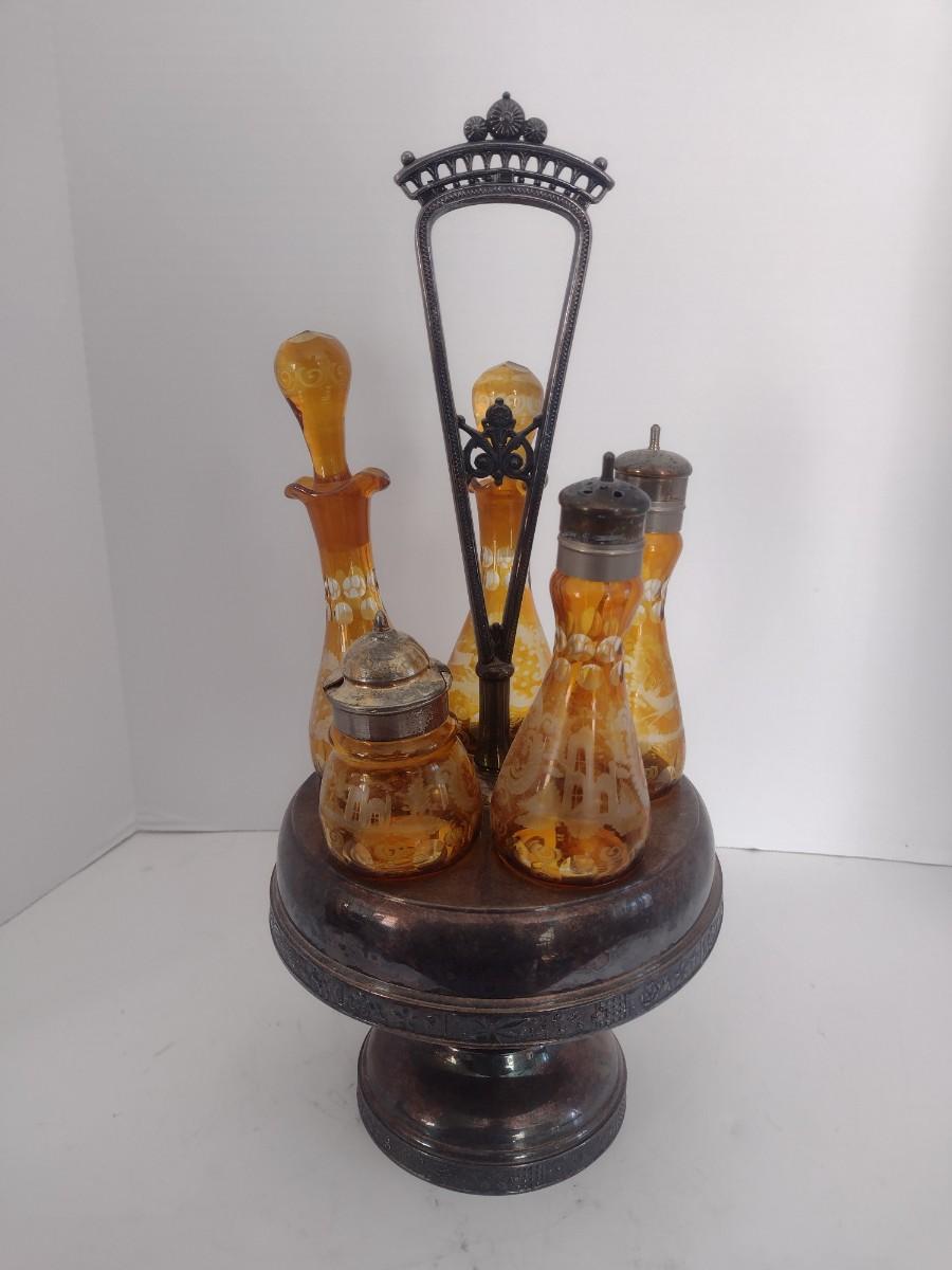 Vintage Rockford Silver Company Quadruple Plated Five Bottle Amber Glass Caster Cruet Set