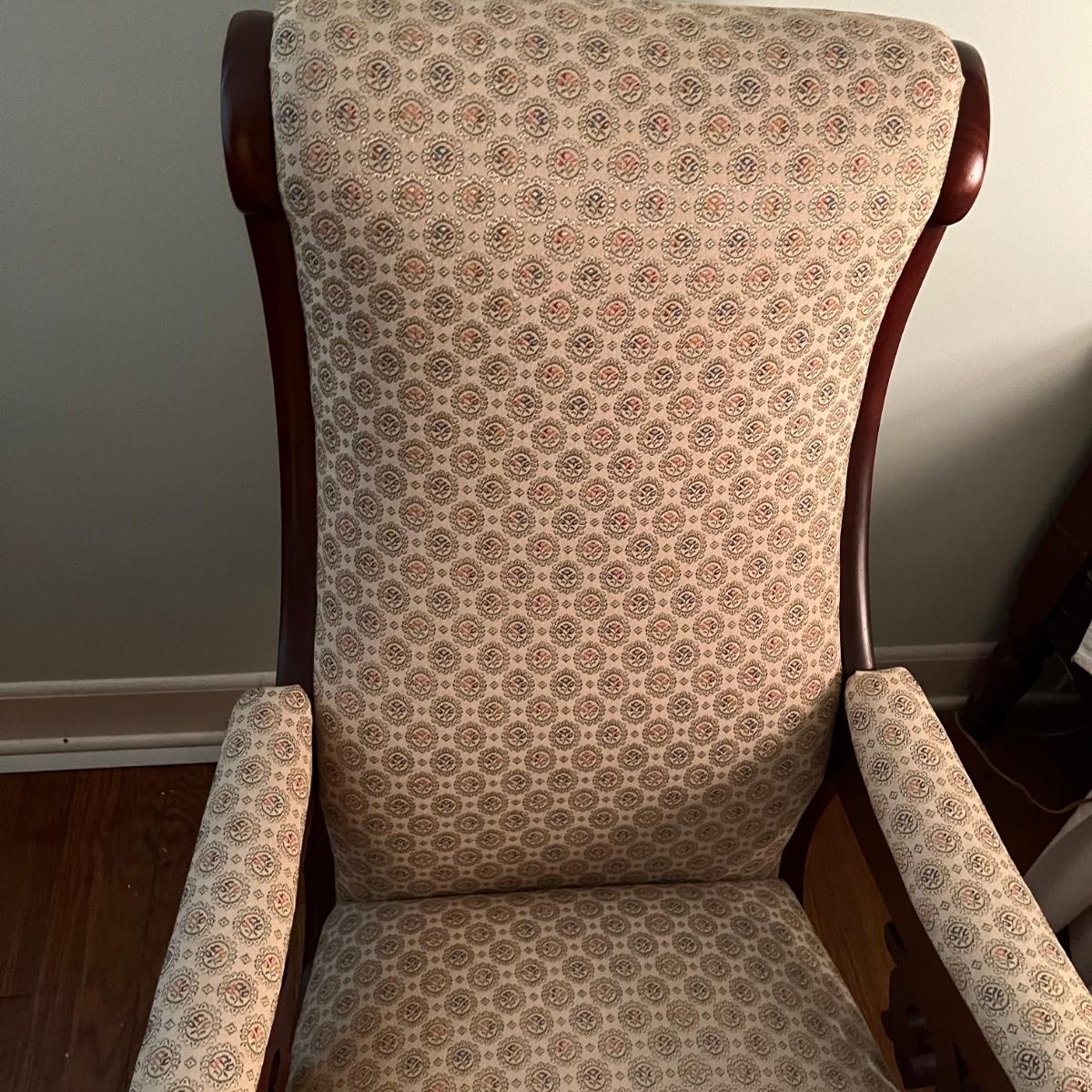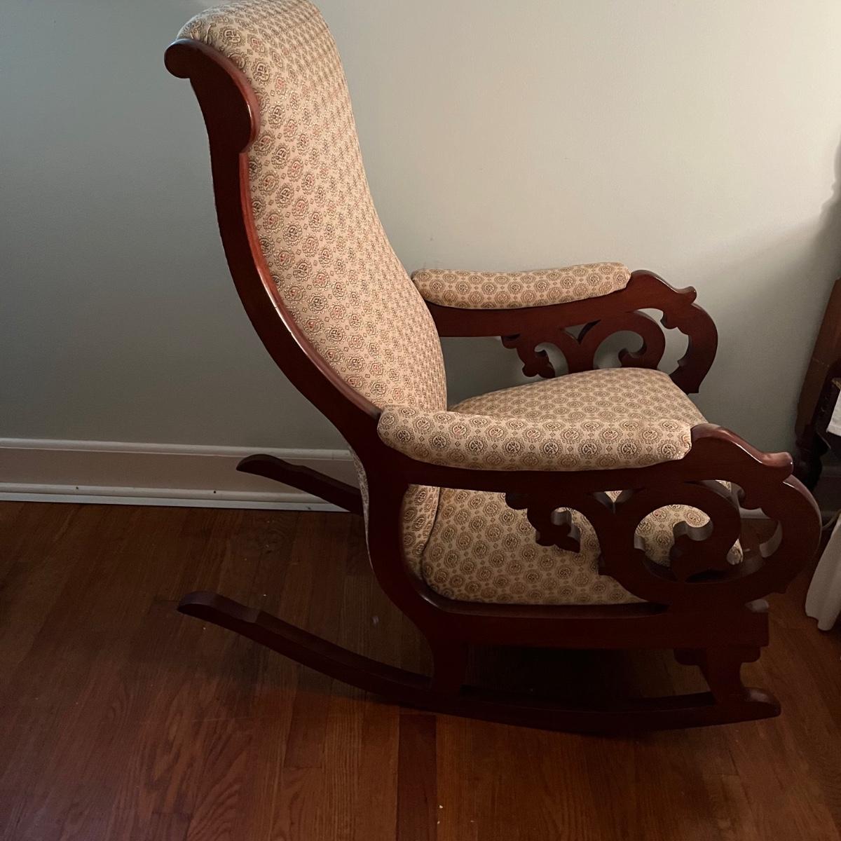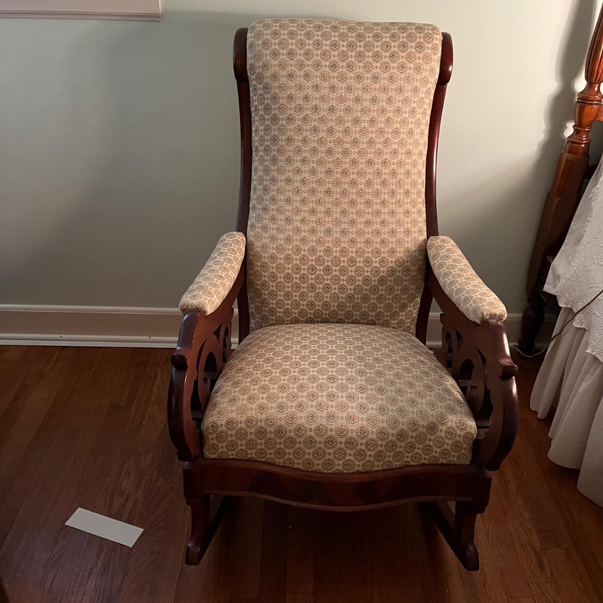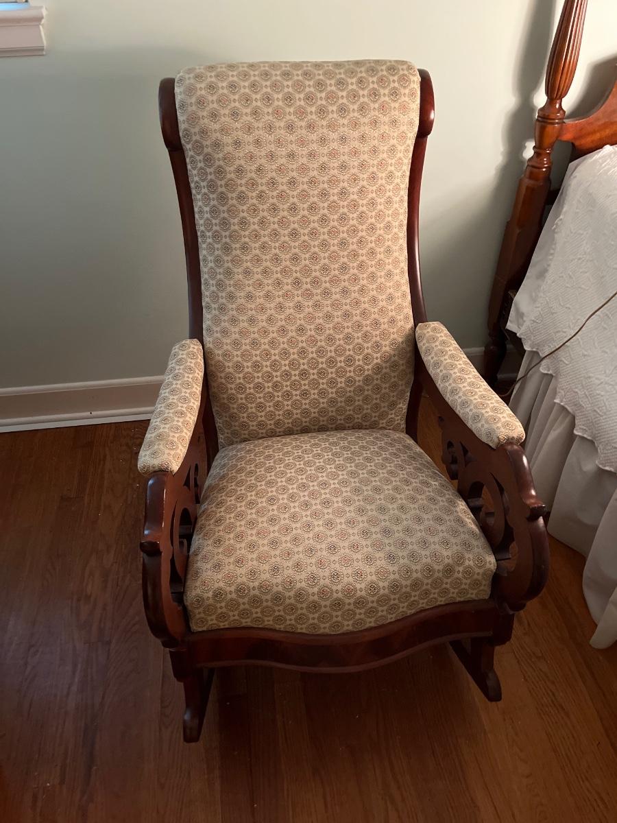 Lot includes a vintage wooden framed rocking chair with padded and upholstered seat, back and arms. Chair is in excellent condition. Chair measures 25” x 36” x 39” with a 17.5” seat height. The winning bidder will need to bring help to move as item is substantial and up one flight of stairs.