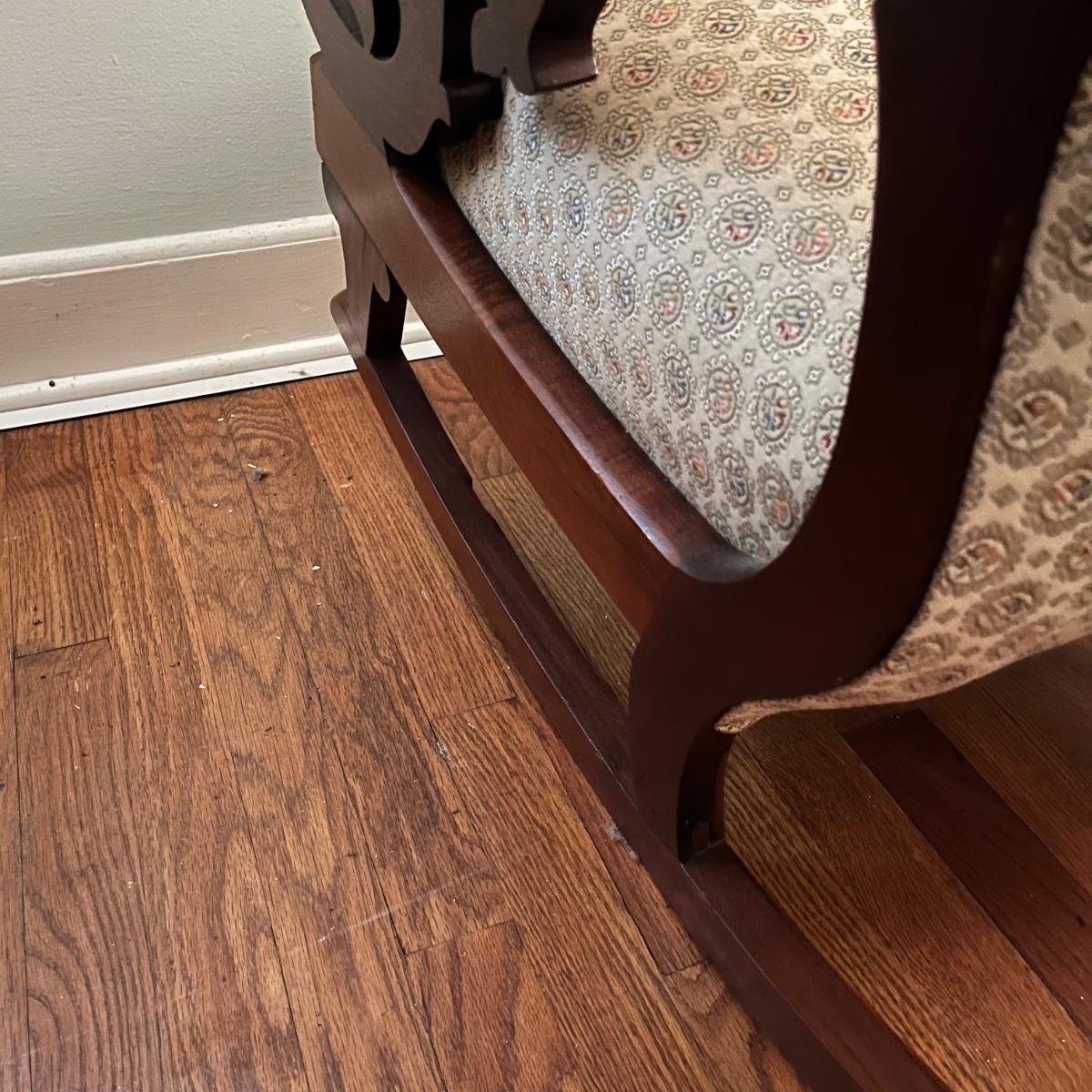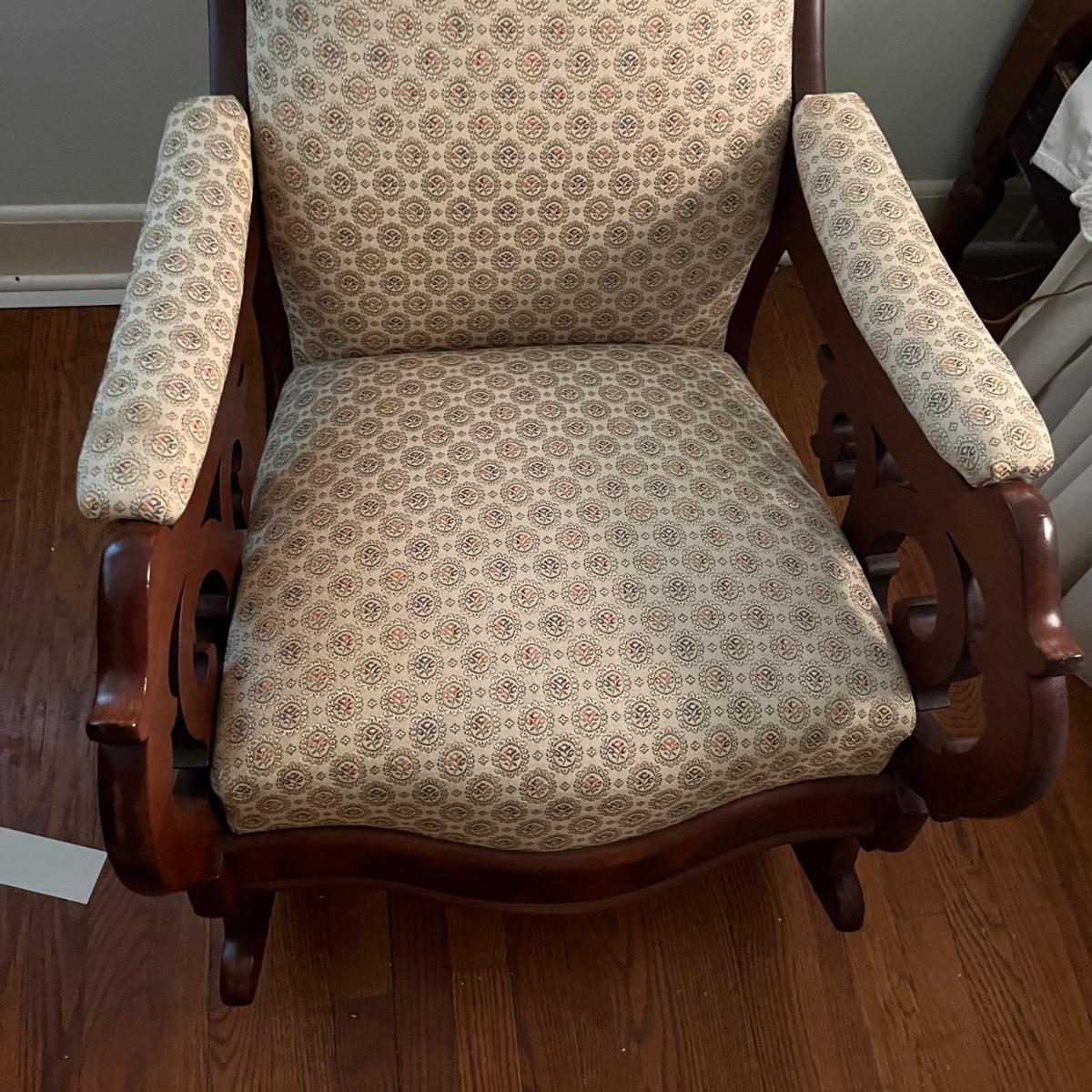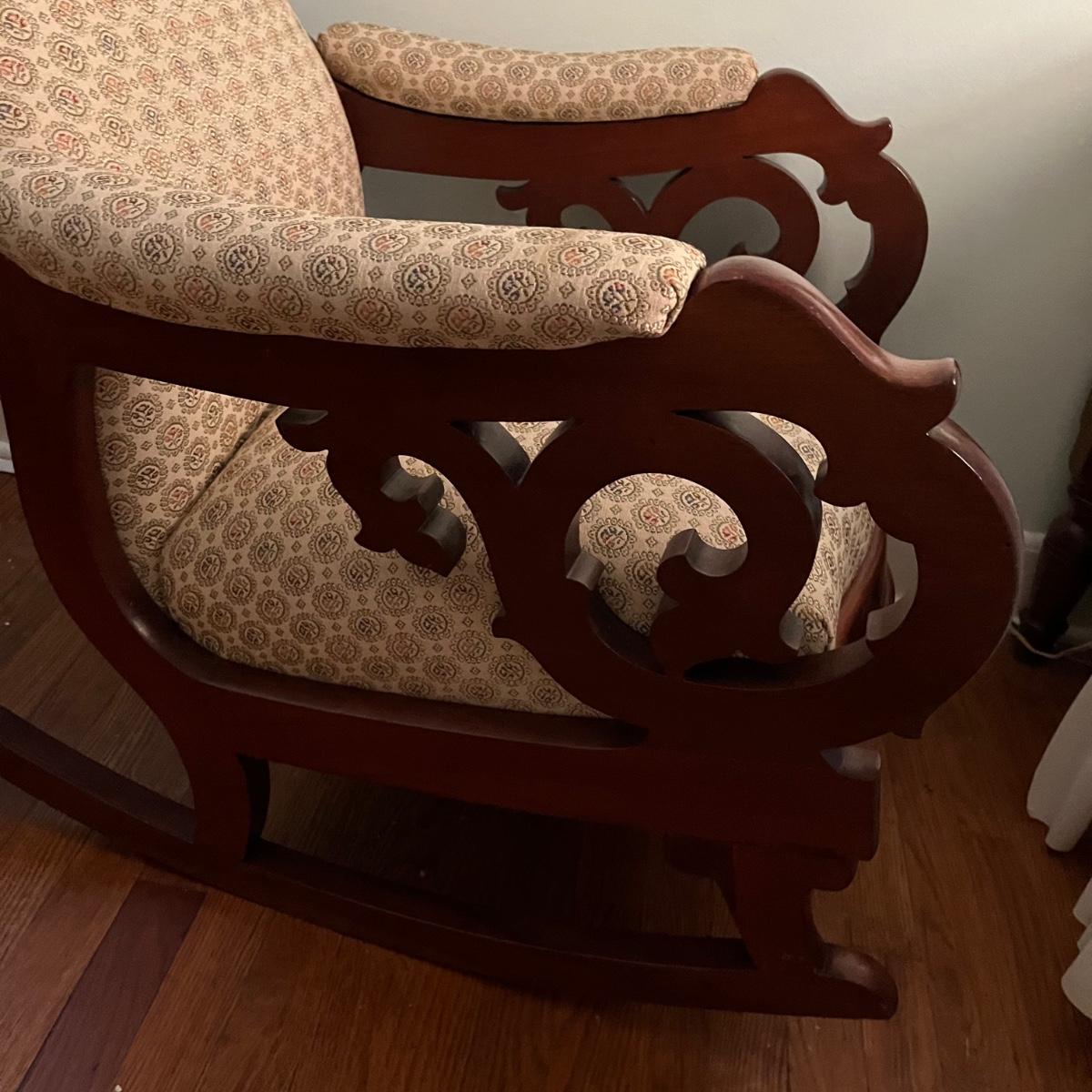 Lot includes a vintage wooden framed rocking chair with padded and upholstered seat, back and arms. Chair is in excellent condition. Chair measures 25” x 36” x 39” with a 17.5” seat height. The winning bidder will need to bring help to move as item is substantial and up one flight of stairs.