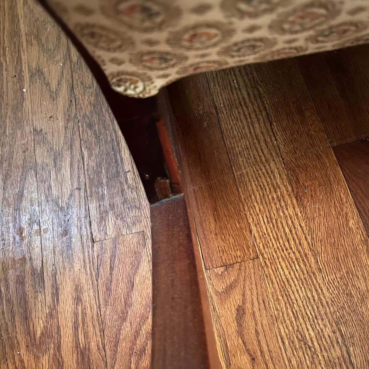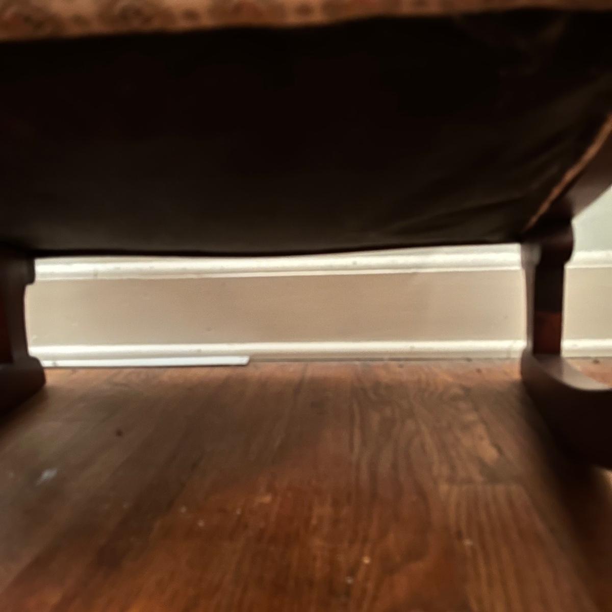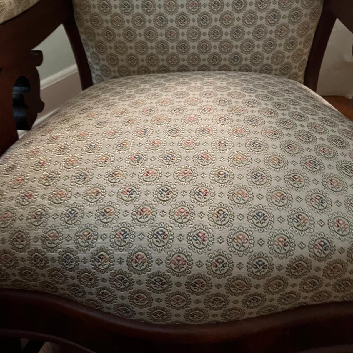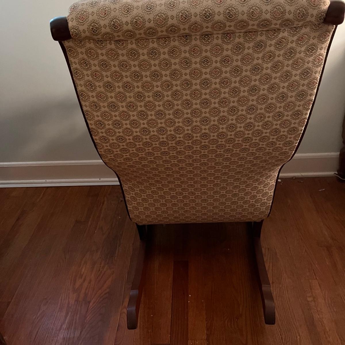 Lot includes a vintage wooden framed rocking chair with padded and upholstered seat, back and arms. Chair is in excellent condition. Chair measures 25” x 36” x 39” with a 17.5” seat height. The winning bidder will need to bring help to move as item is substantial and up one flight of stairs.