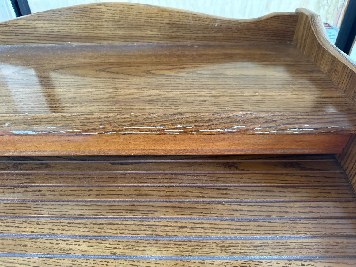 In great shape, however, there is some wear and tear visible. Dimensions are 47 inches tall by 27 inches wide by 20 inches deep.
