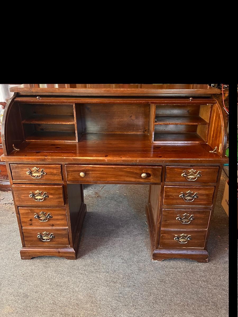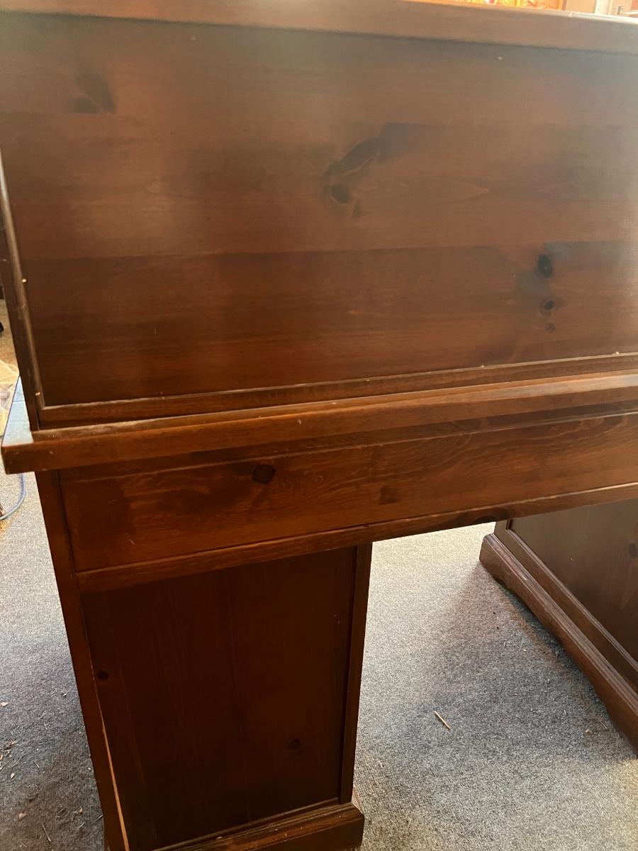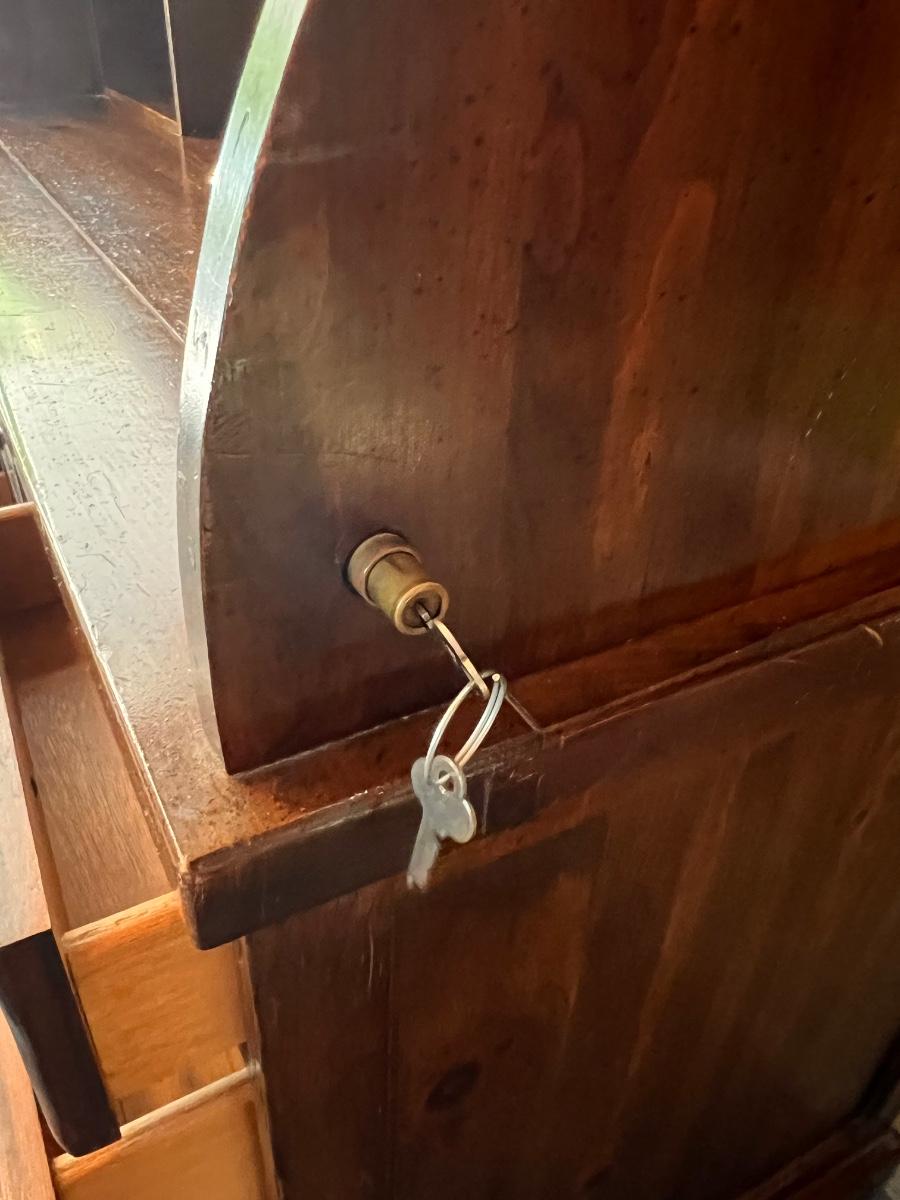 Solid wood. Shows a lot of wear as shown in pics but has a lot of potential. Rolled wood in good condition. Comes with lock and working key.