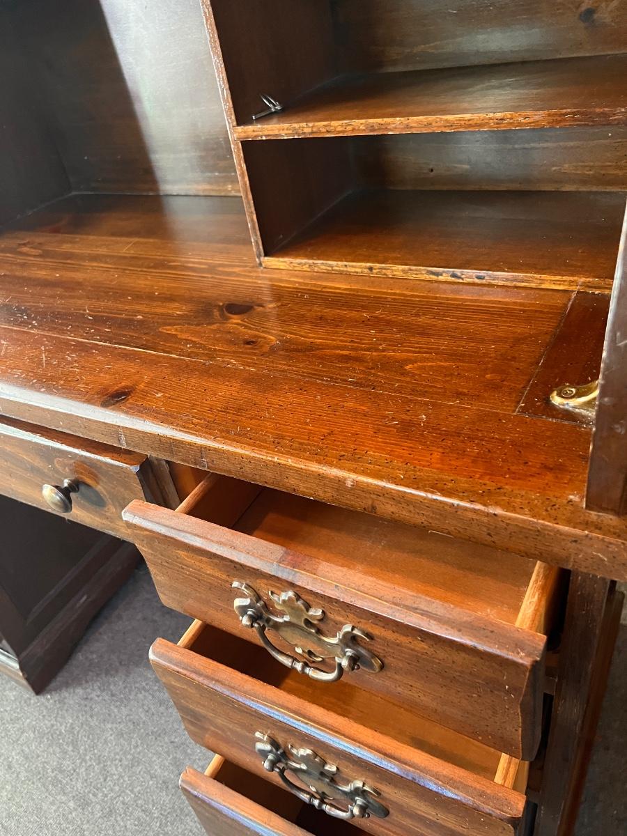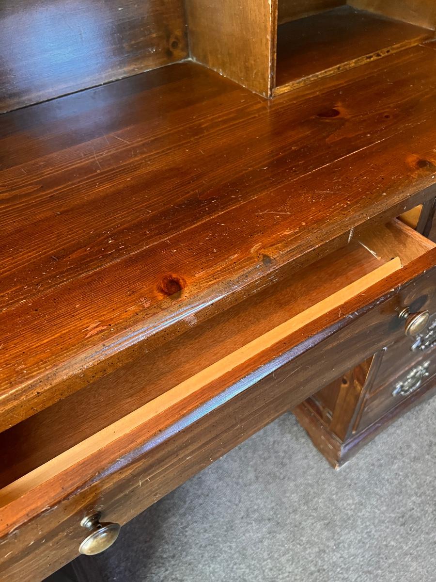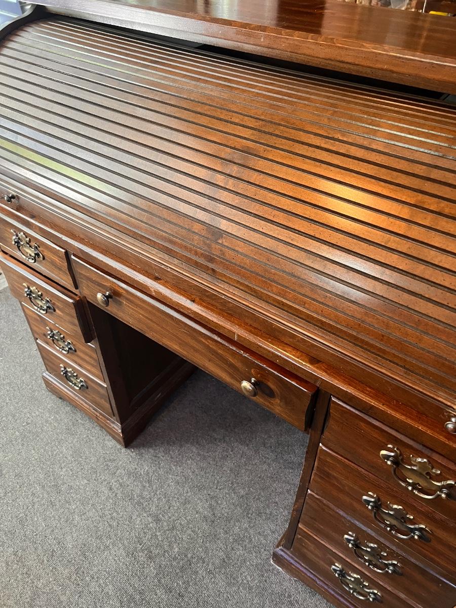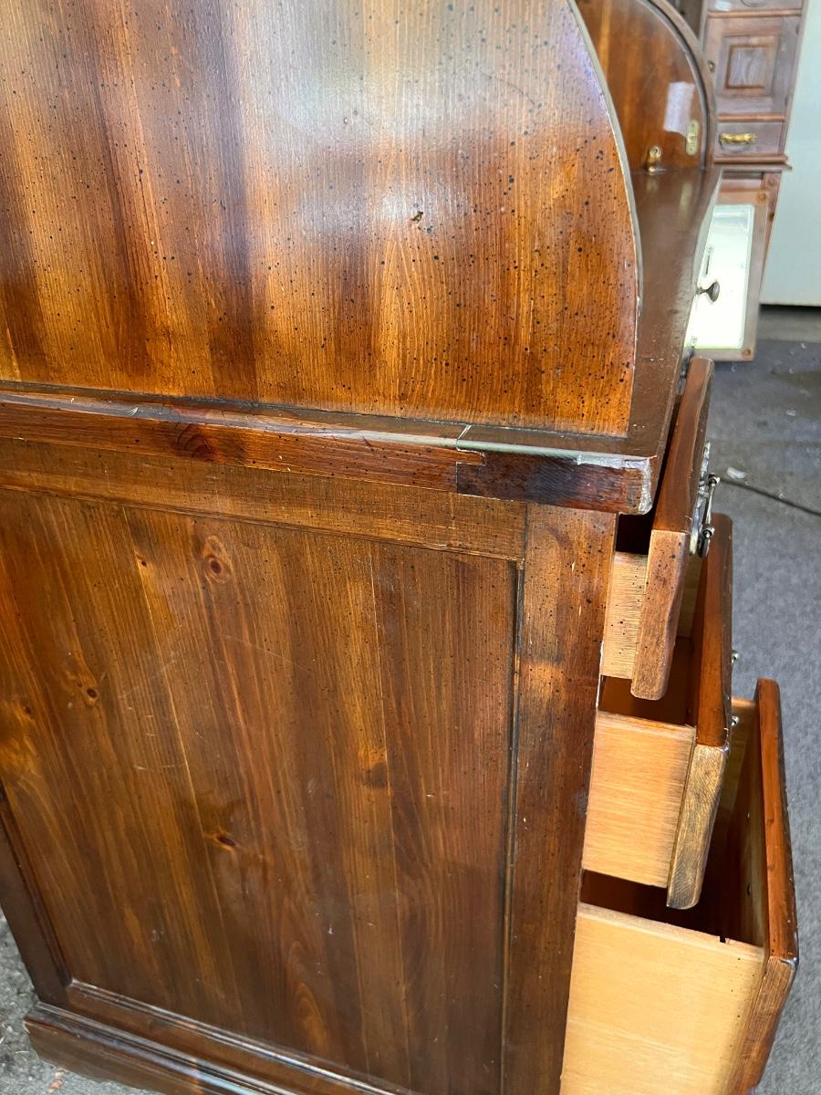 Solid wood. Shows a lot of wear as shown in pics but has a lot of potential. Rolled wood in good condition. Comes with lock and working key.