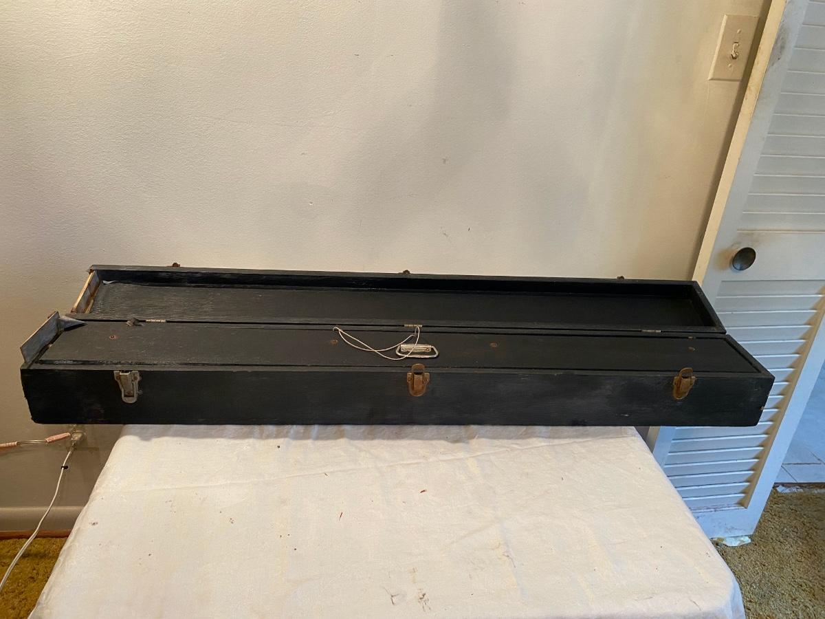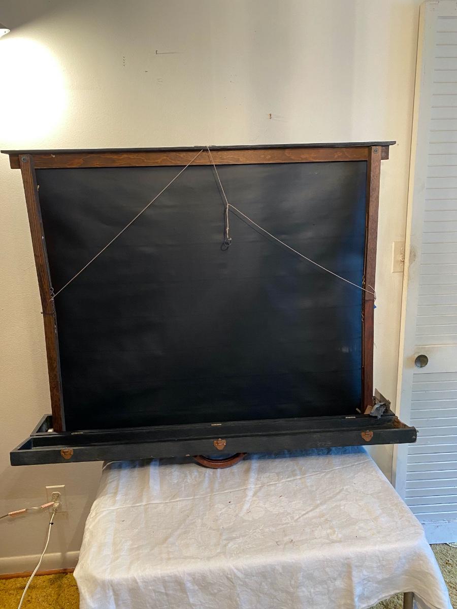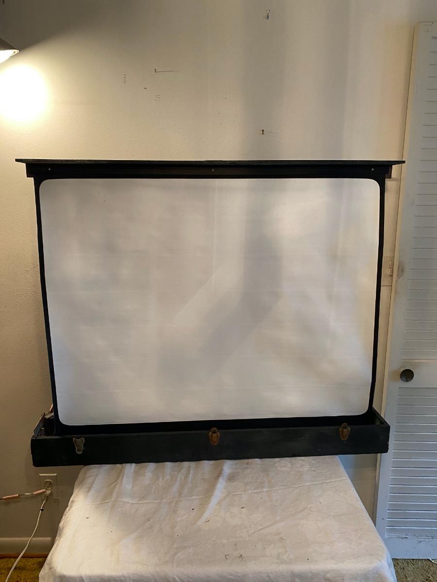 This is a vintage, possibly by Raven,roll up projector/projection screen in wood case with handle, most likely for a table top. Height 36", Width 44" and case depth 5 3/4"