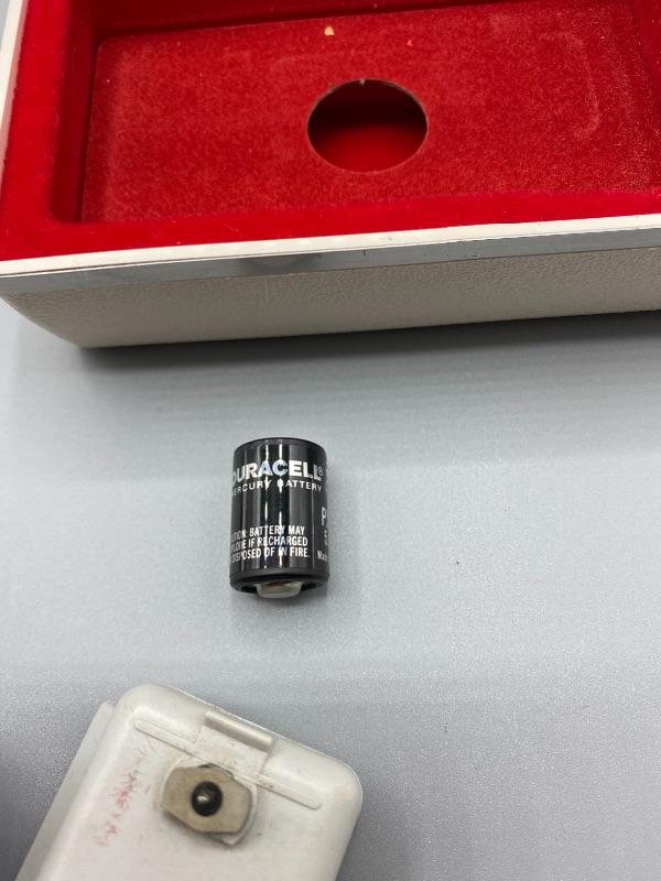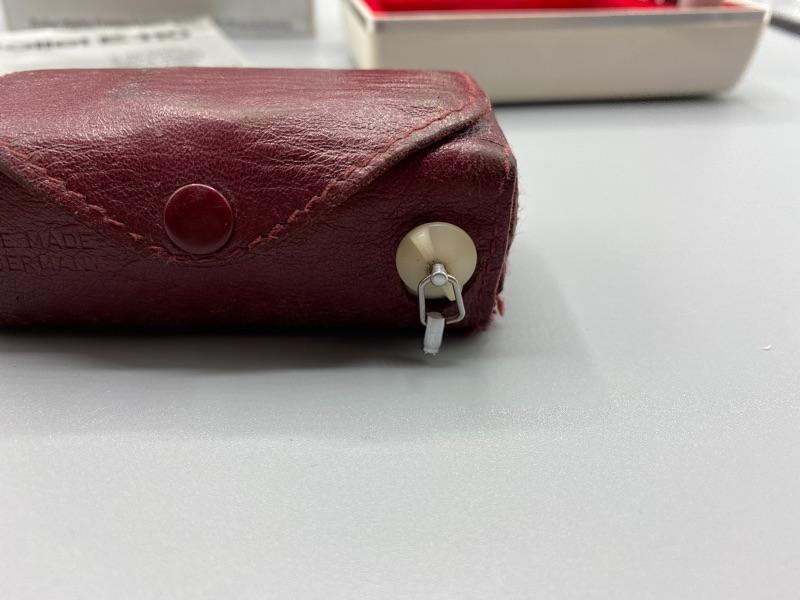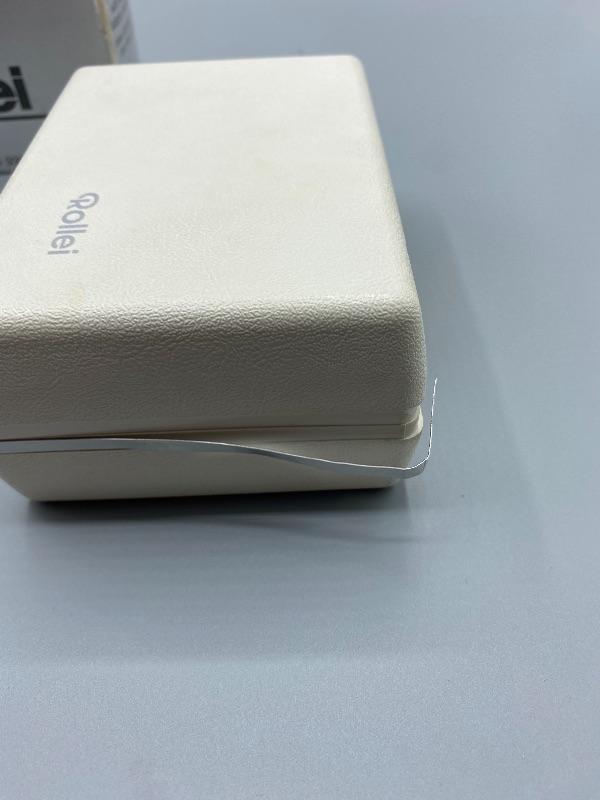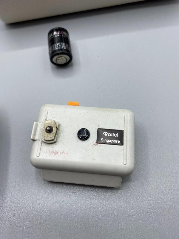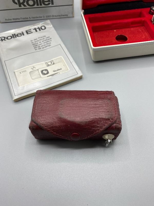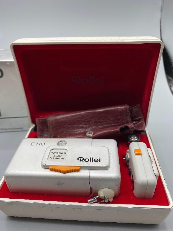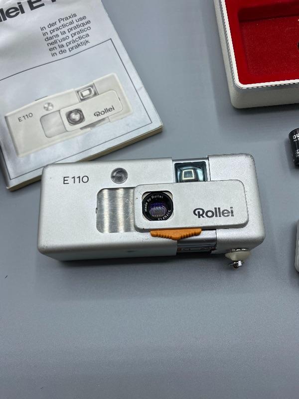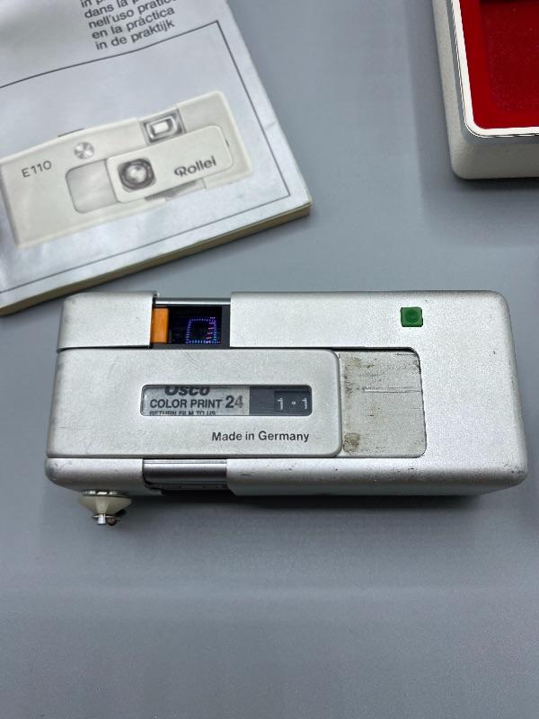 Vintage Rollei E110 pocket camera. Made in Germany. Slide to open to take pictures. Comes in original plastic storage box with owner's manual and original package box.. Has all the parts, even has a roll of film in it. Unsure of working condition or quality of used film. Looks to be well kept. The keychain loop is broken but can be easily fixed to attach a lanyard.