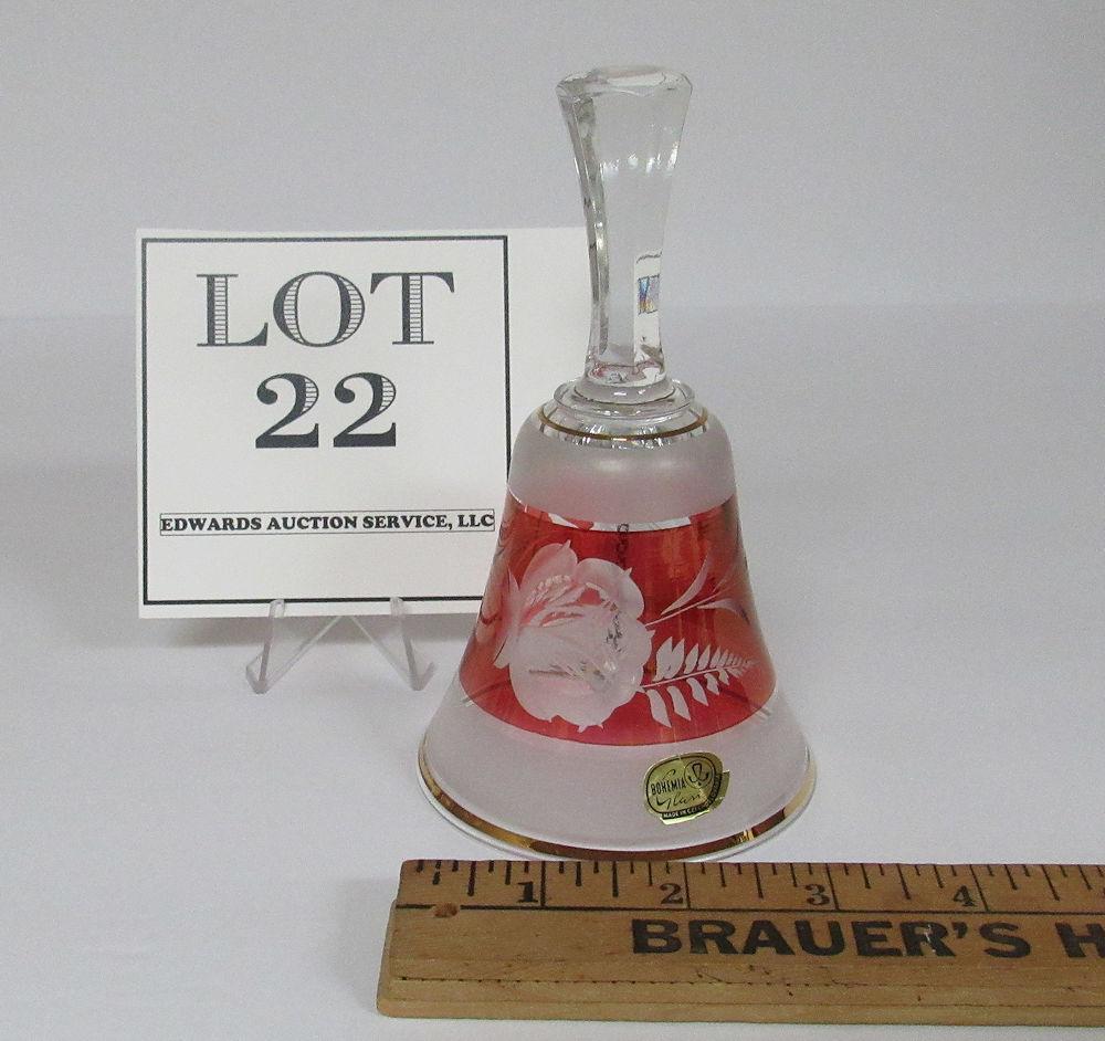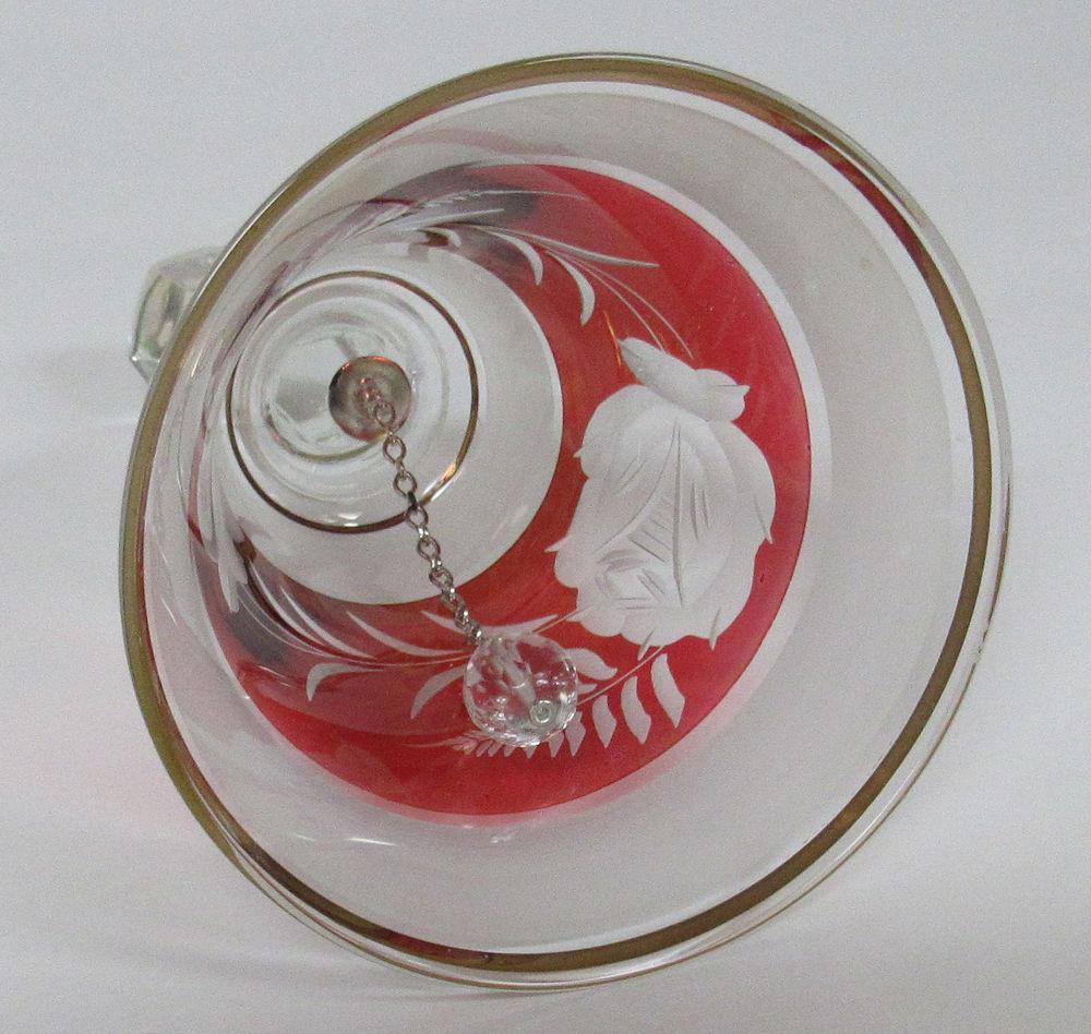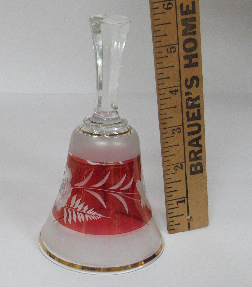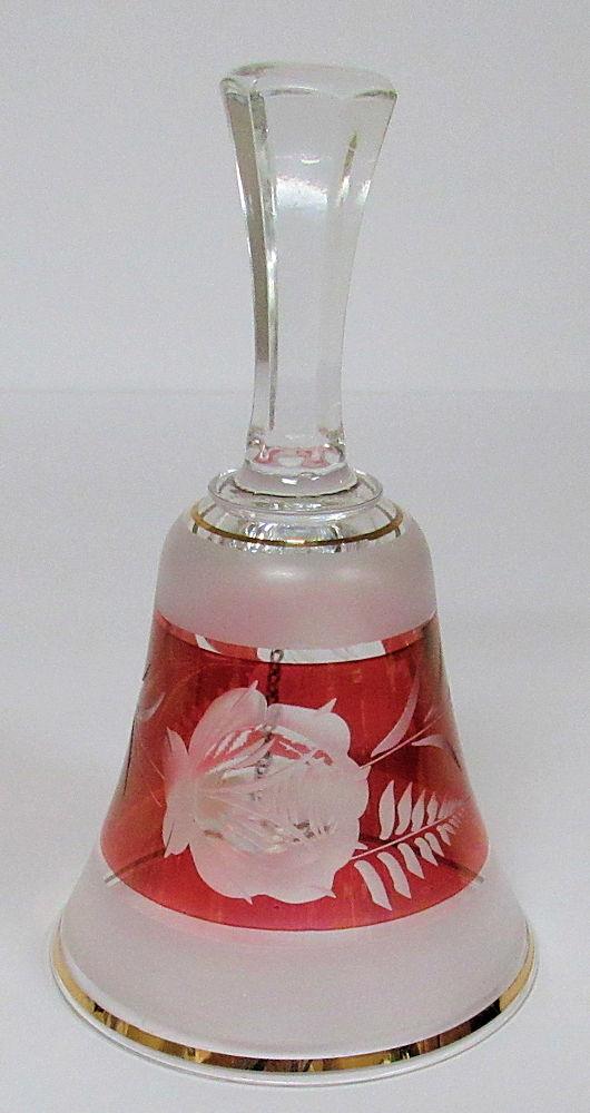 Vintage Bohemian Cut to Clear Red Glass Bell, Satin Finish, Rose Pattern