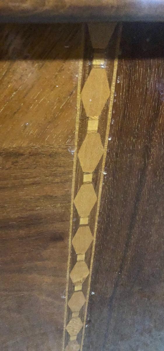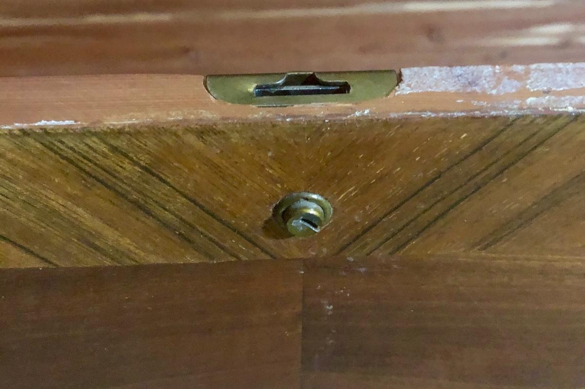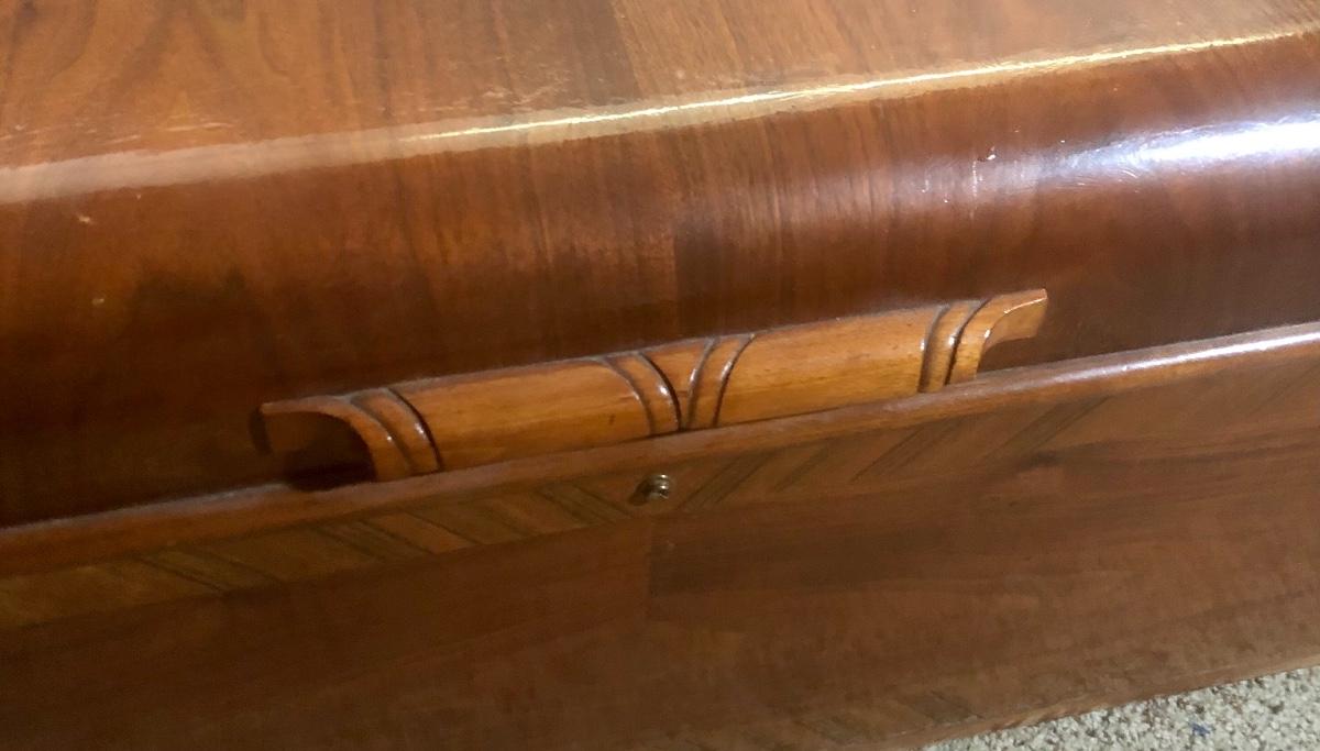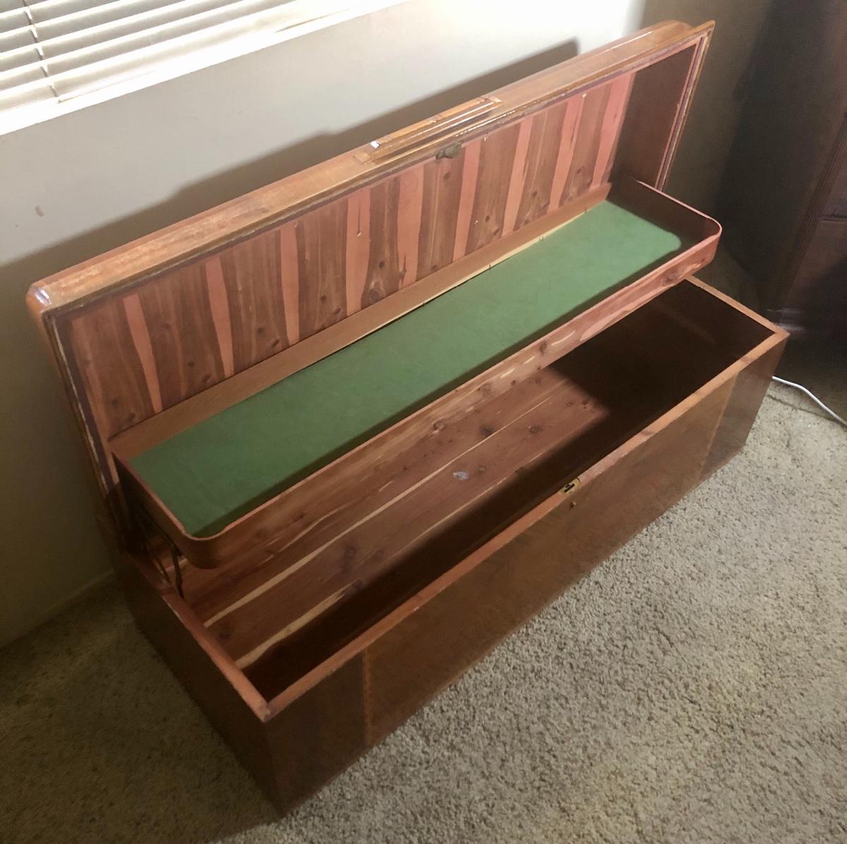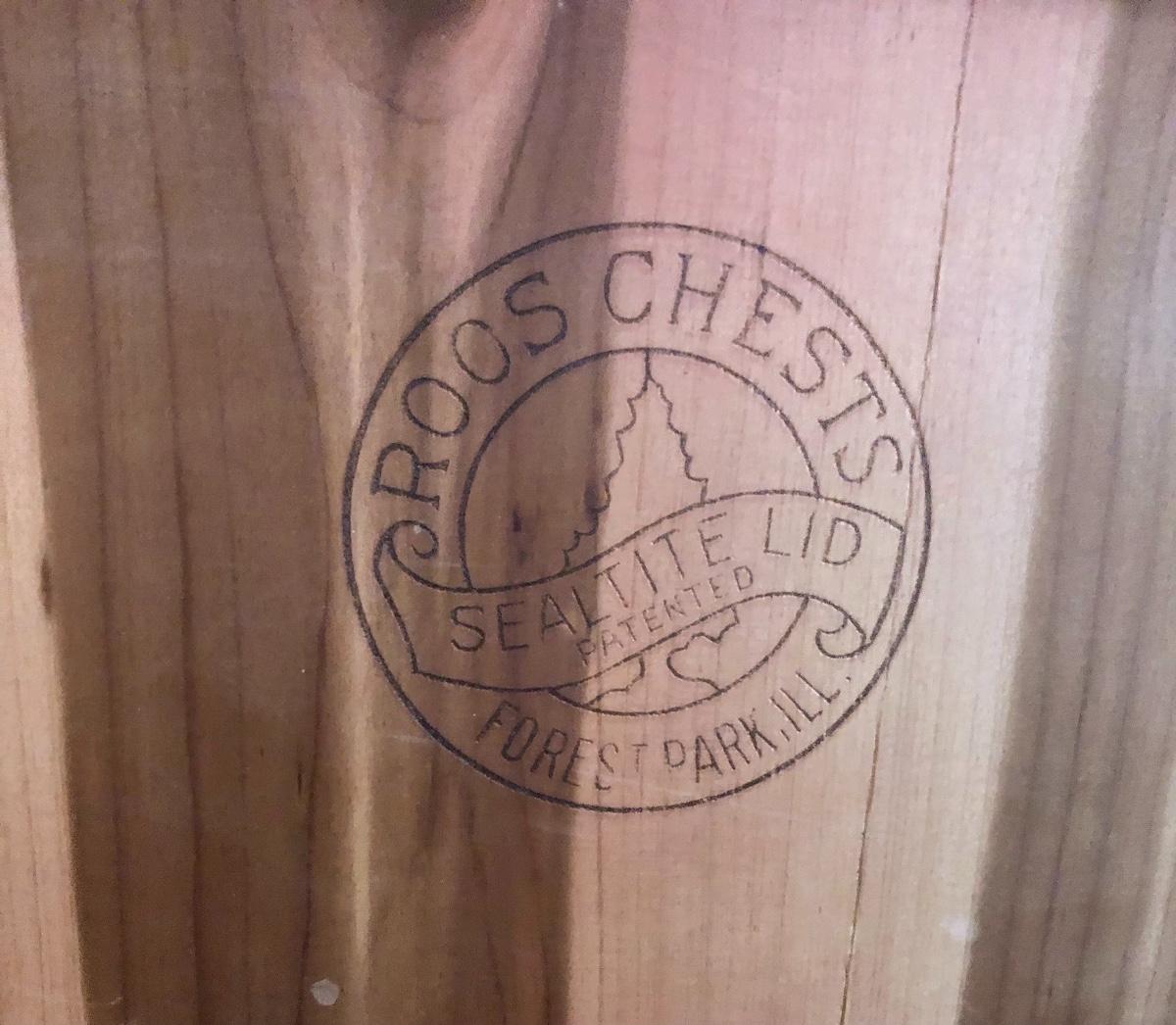 Vintage antique 1940’s Roos waterfall style cedar chest with inlaid details. Very good condition, single hinged upper tray/shelf. Original push-button latch, key is missing.