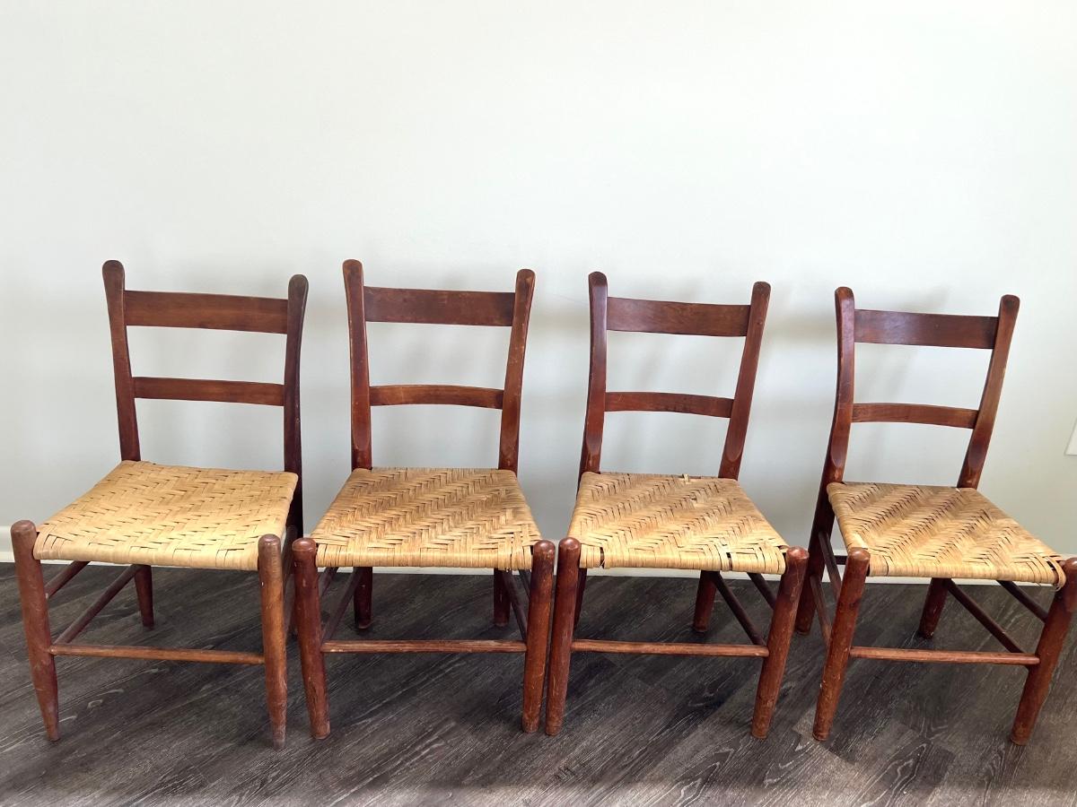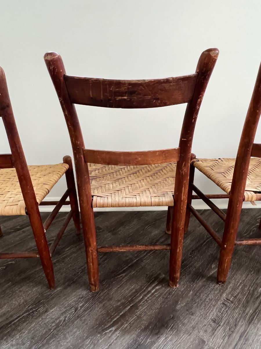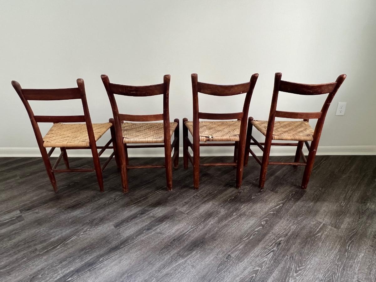 Nice Vintage Rope Chairs set of 4. One of the chair backs seems slightly shorter than the other 3 however the seats are the same level. See picture one. Chair on the left, end is slightly shorter and the seat appears slightly brighter than the other three. Three chairs that are the same measure 35 inches tall, 19 inches wide, 15 inches deep floor to seat 17 inches. The fourth chair measures at 34 inches tall and the other measurements are the same.