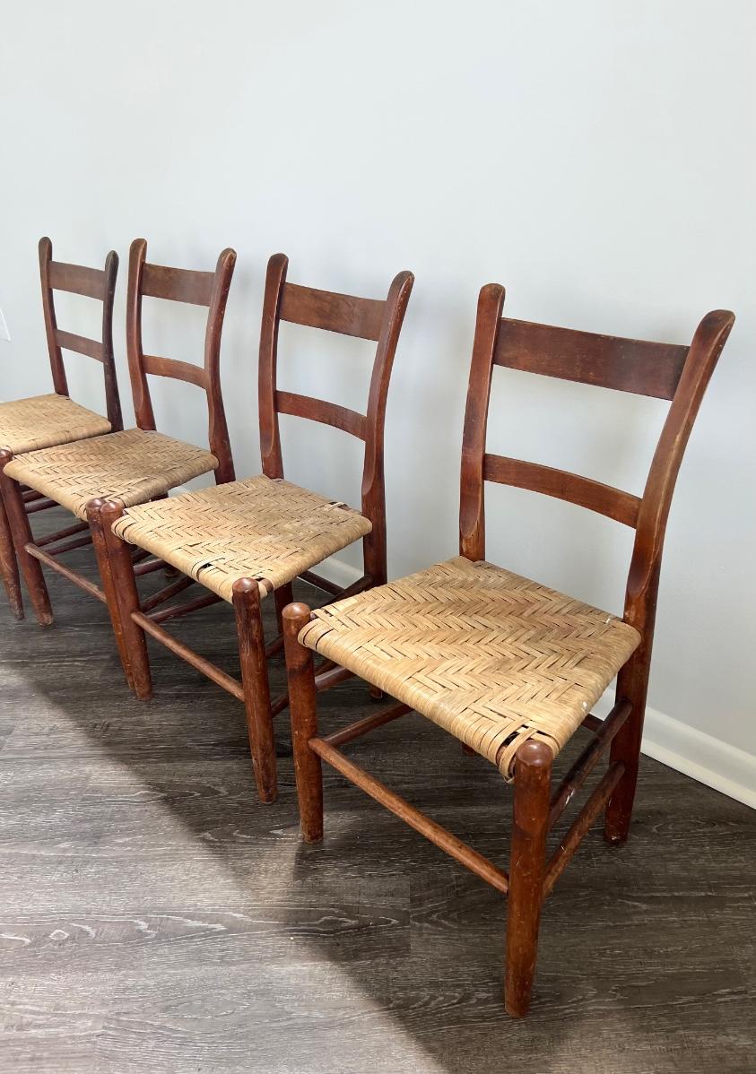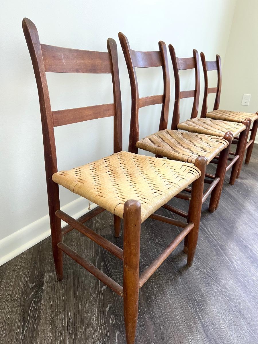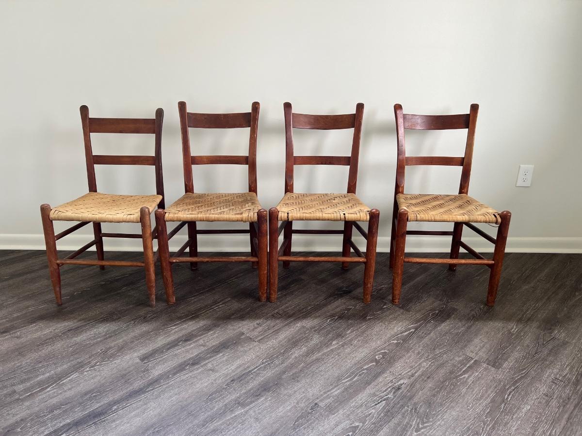 Nice Vintage Rope Chairs set of 4. One of the chair backs seems slightly shorter than the other 3 however the seats are the same level. See picture one. Chair on the left, end is slightly shorter and the seat appears slightly brighter than the other three. Three chairs that are the same measure 35 inches tall, 19 inches wide, 15 inches deep floor to seat 17 inches. The fourth chair measures at 34 inches tall and the other measurements are the same.
