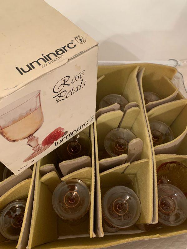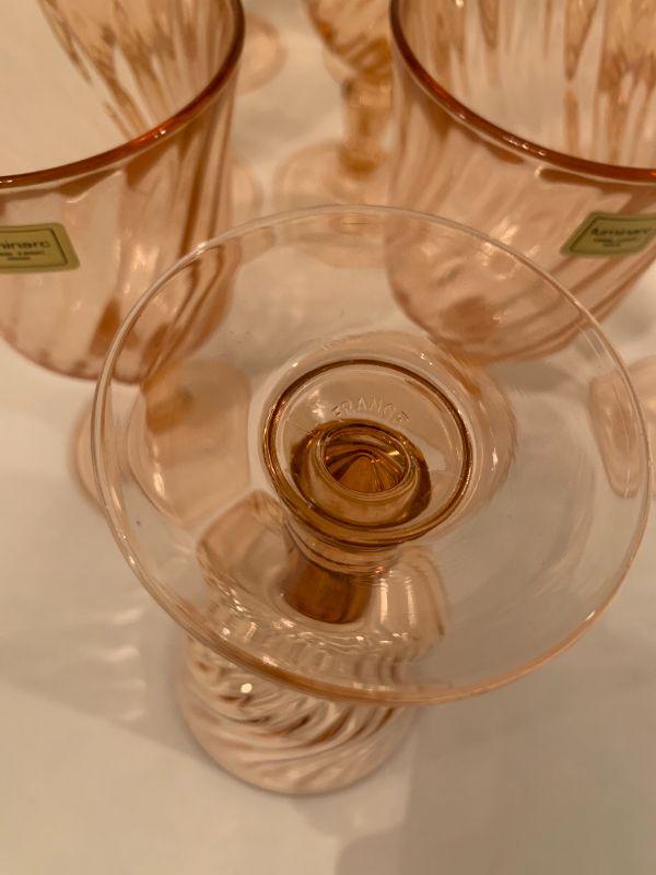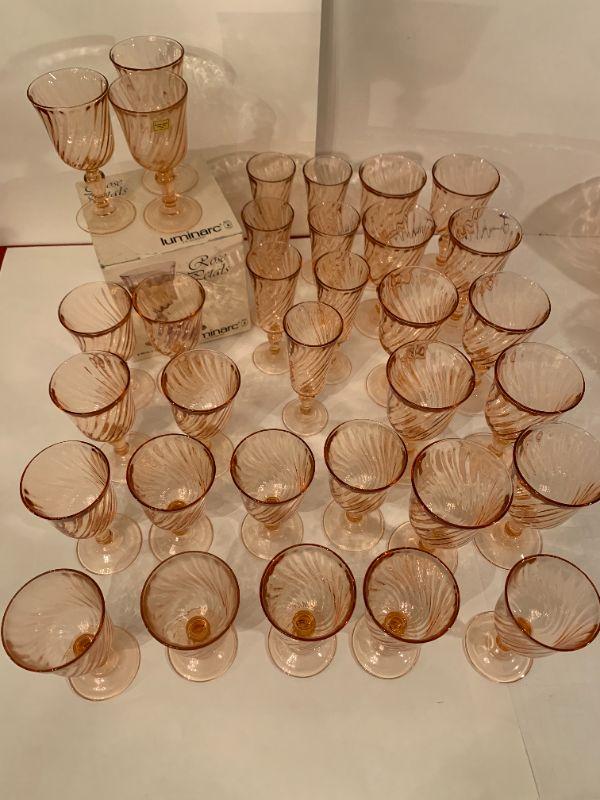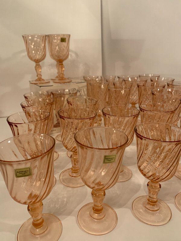 Vintage luminarc rose petal swirl pattern depression glass stemware. Lot includes
