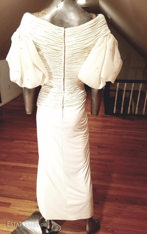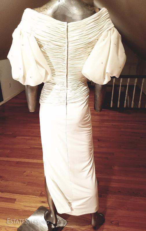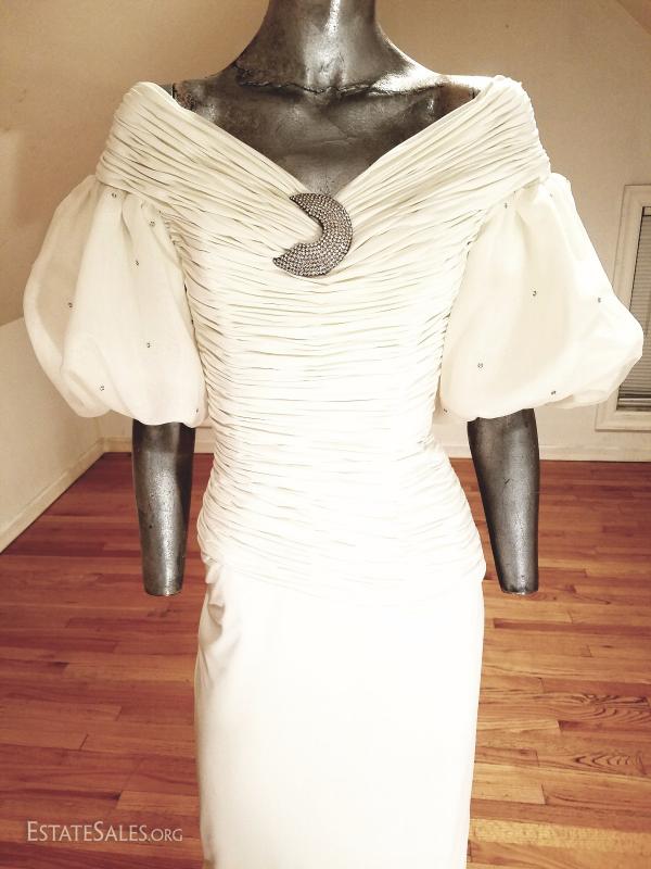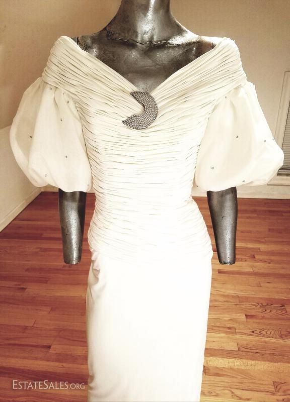 Stunning designer semi couture cocktail gown by famous Rose Taft Hollywood designer. The bodice is all shirred details with organza balloon sleeves that are adorned by rhinestones .The front top bodice has a magnificent all crystals half moon brooch. The side has a high slit and the gown is all lined. The fabric is very fluid I believe it is a combo of silk acetate and lycra. amazing details and is worn a bit off shoulders.In very good vintage condition.