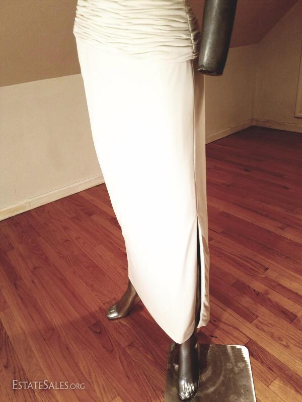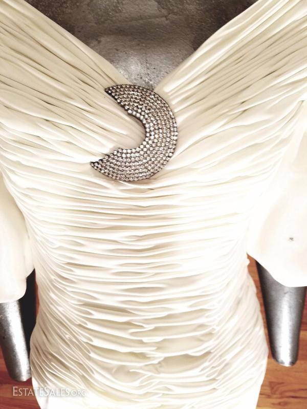 Stunning designer semi couture cocktail gown by famous Rose Taft Hollywood designer. The bodice is all shirred details with organza balloon sleeves that are adorned by rhinestones .The front top bodice has a magnificent all crystals half moon brooch. The side has a high slit and the gown is all lined. The fabric is very fluid I believe it is a combo of silk acetate and lycra. amazing details and is worn a bit off shoulders.In very good vintage condition.