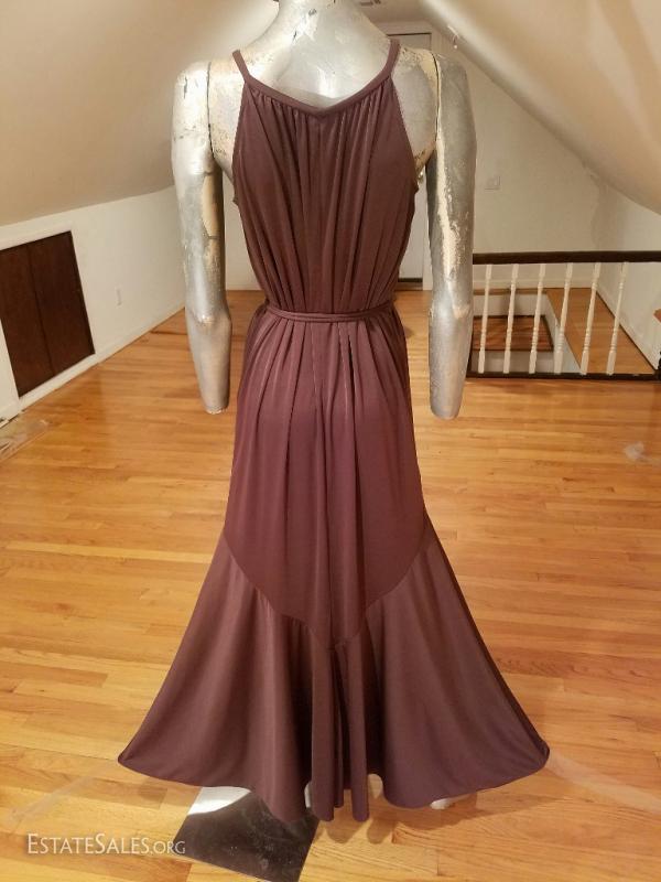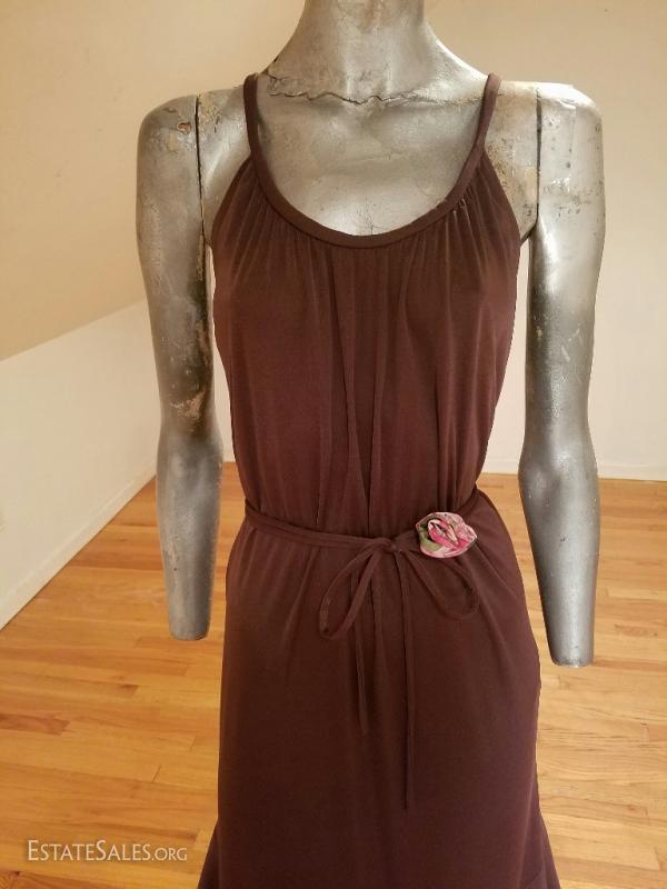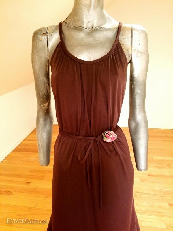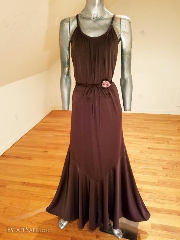 Beautiful Hobo Chic 1970's Ursula of Switzerland maxi gown in cocoa brown coloration and a flower piped belt. Bottom hem fluid petal. In very good vintage condition very collectible.