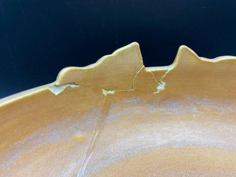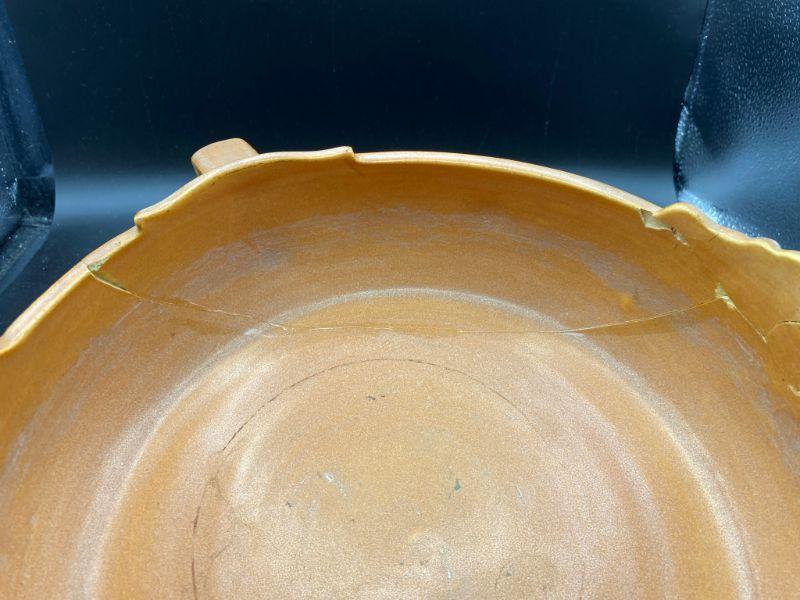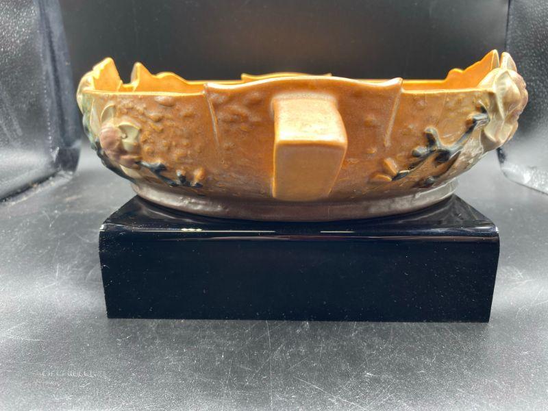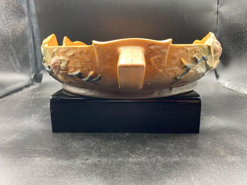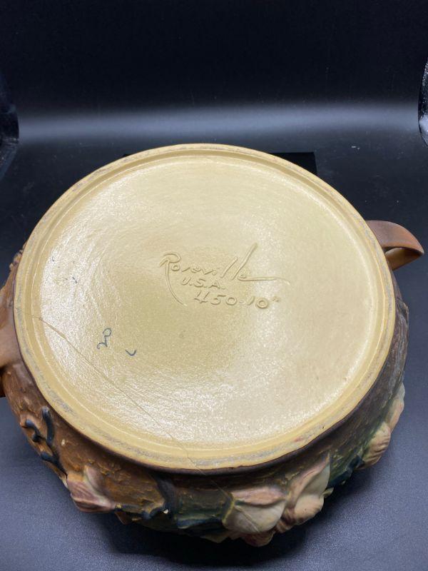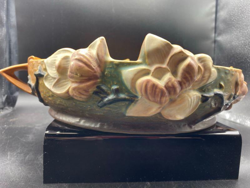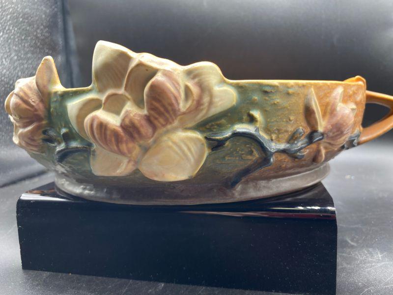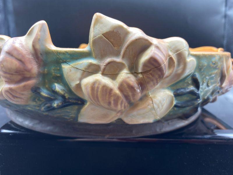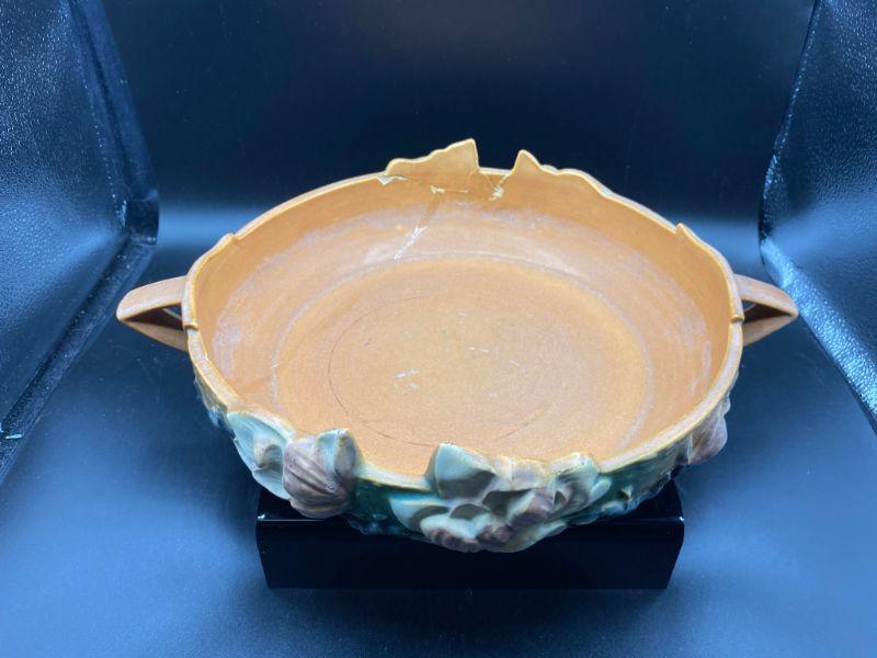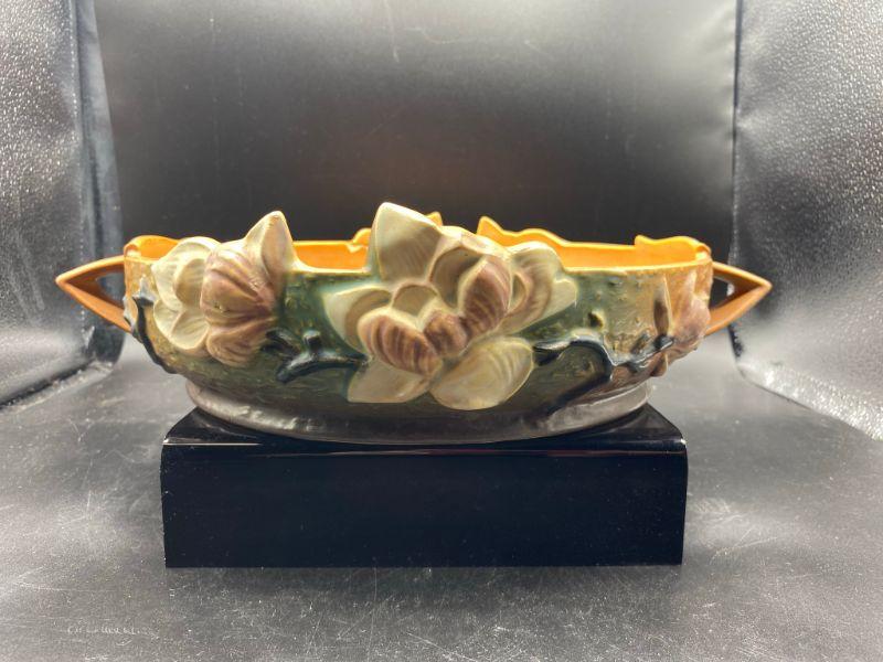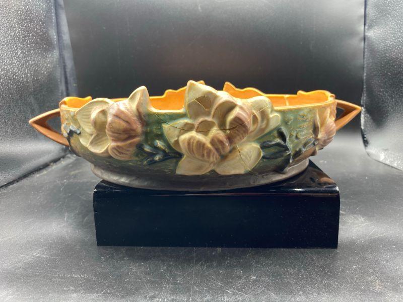 Vintage Roseville 10" shallow bowl. Magnolia flowers with handles on the side. Bowl has been repaired. Displays nicely from one side when at or above eye level. See photos.