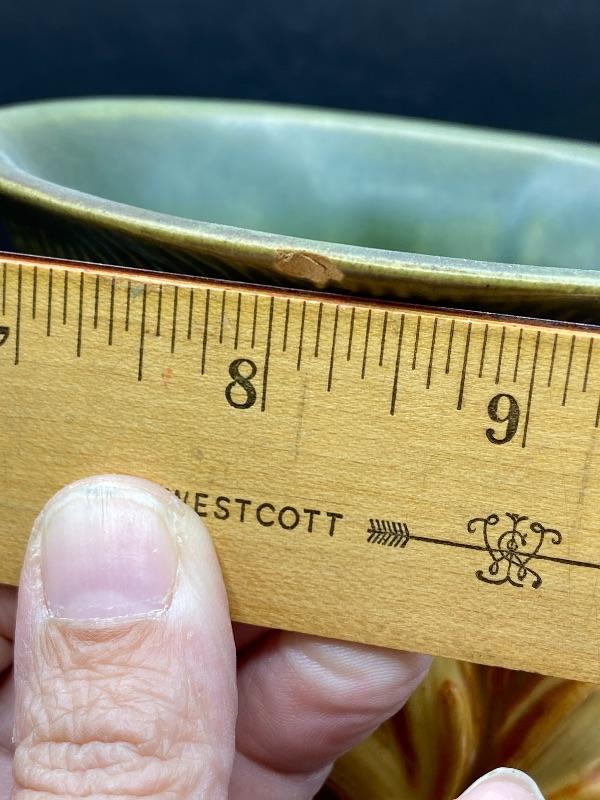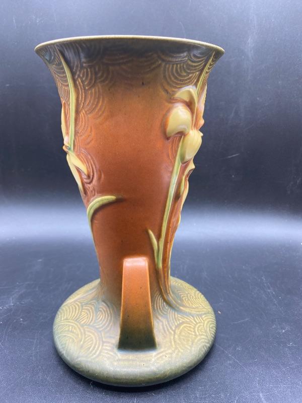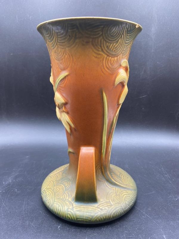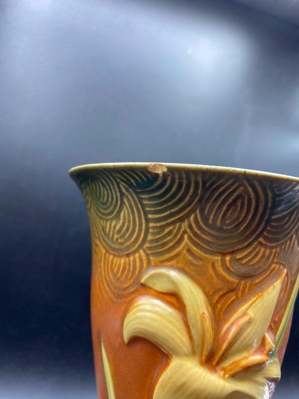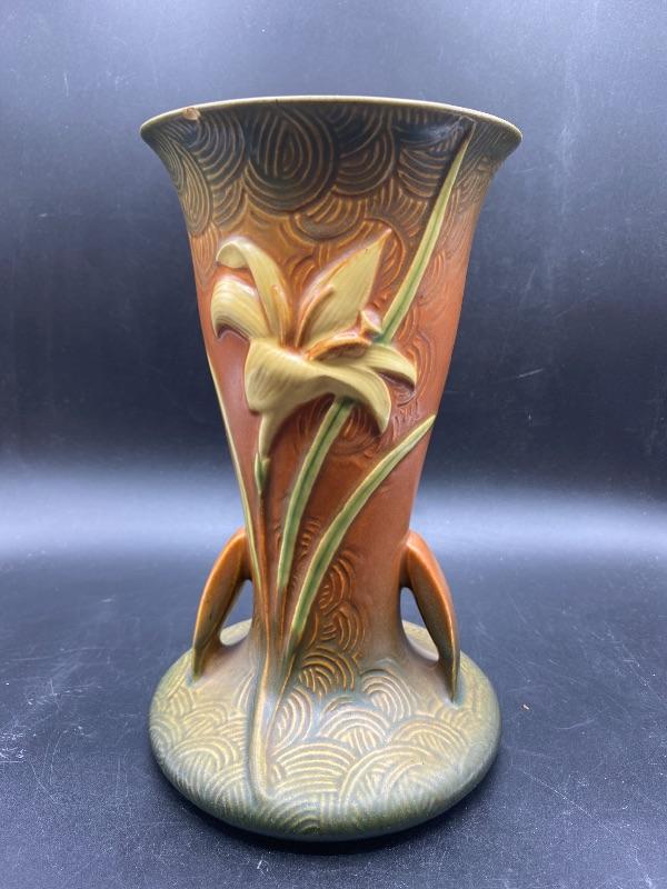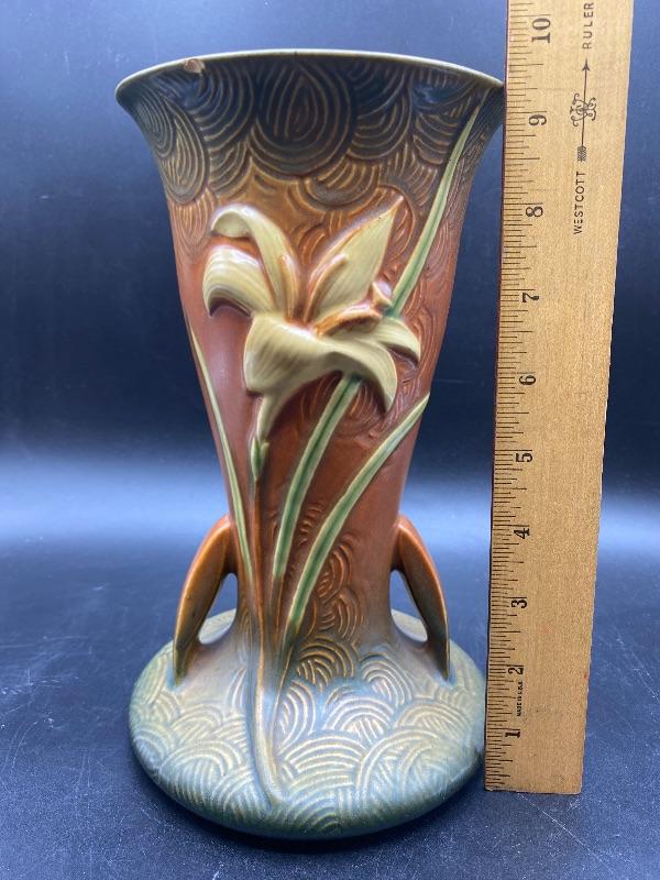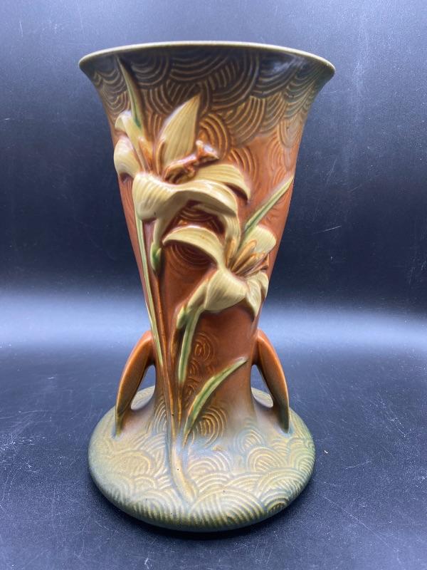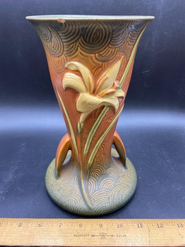 Beautiful vintage Roseville pottery vase. Green and brown ombre finish with zephyr lily flowers. Wide bottom. Stands a little over 9" tall. Does have a small chip along the edge on one side. Displays wonderfully.