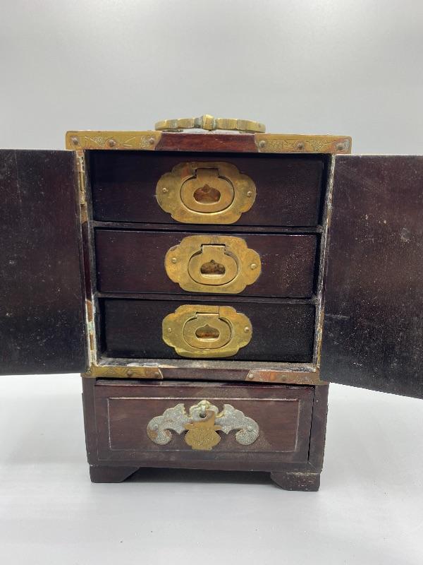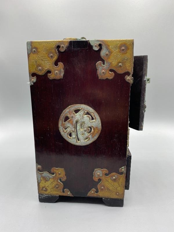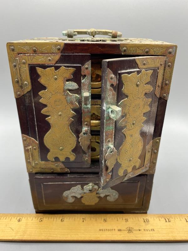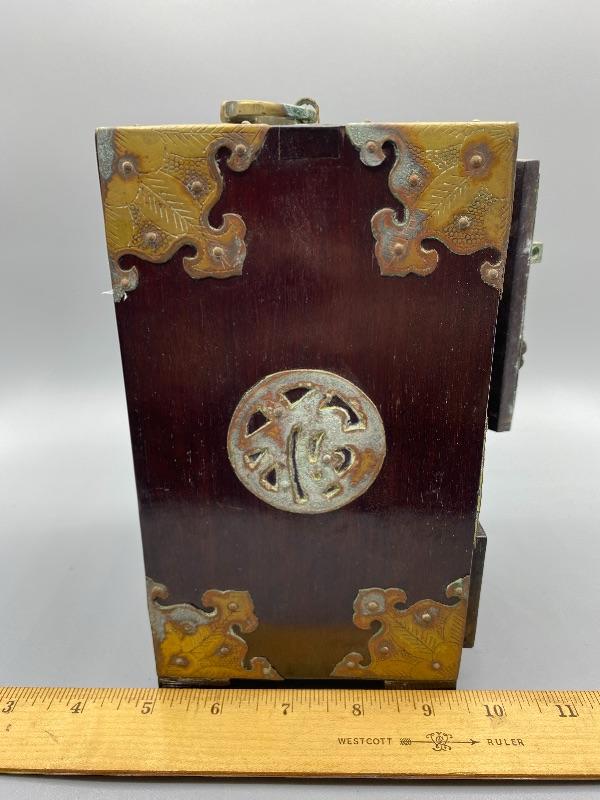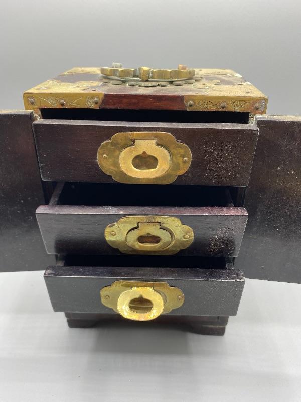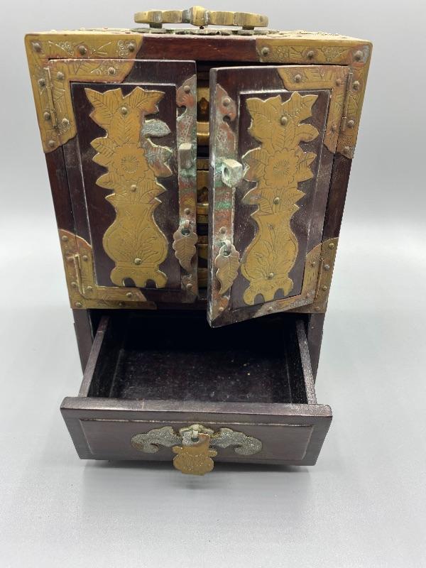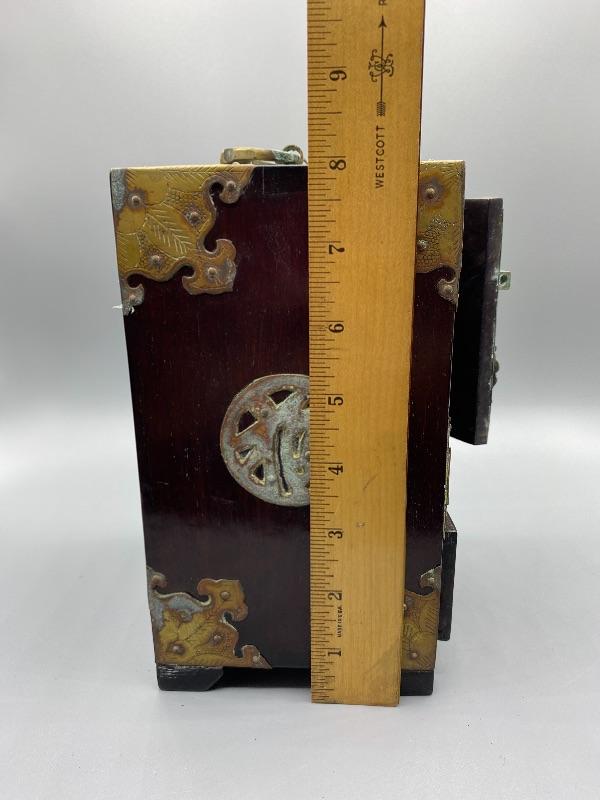 Vintage rosewood and brass jewelry chest. Has doors that open to 3 small drawers and one larger drawer on the bottom. Doors have loops for a lock. The brass has turned a bit, in need of a little TLC and cleaning. Door on left side sticks a little tight. Stands about 8" tall. Made in China.
