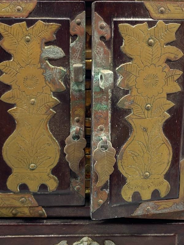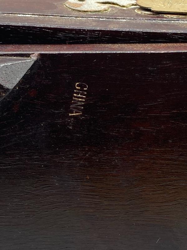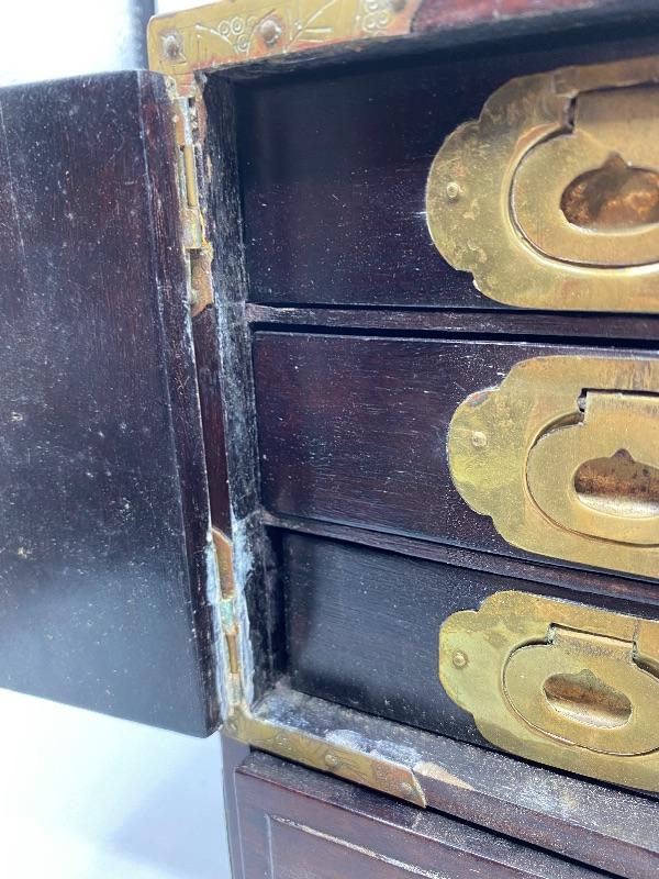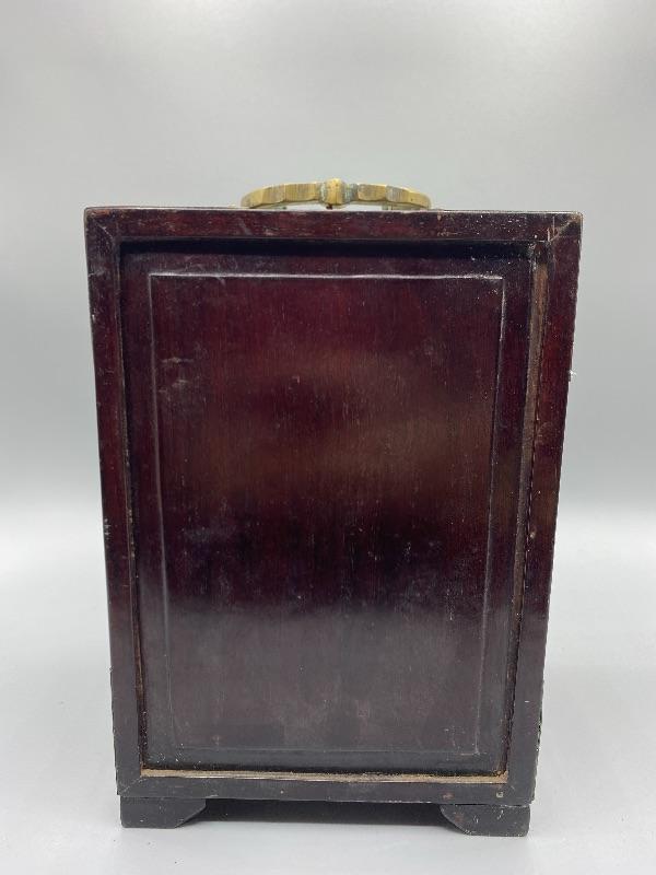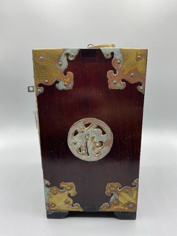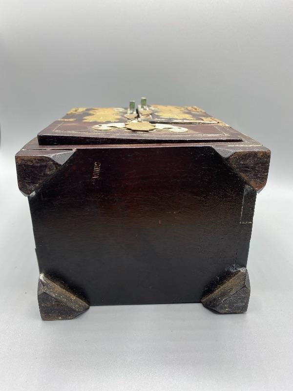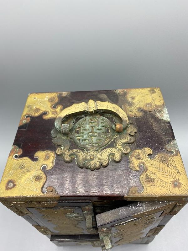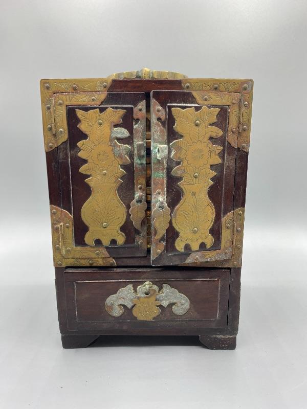Vintage rosewood and brass jewelry chest. Has doors that open to 3 small drawers and one larger drawer on the bottom. Doors have loops for a lock. The brass has turned a bit, in need of a little TLC and cleaning. Door on left side sticks a little tight. Stands about 8" tall. Made in China.