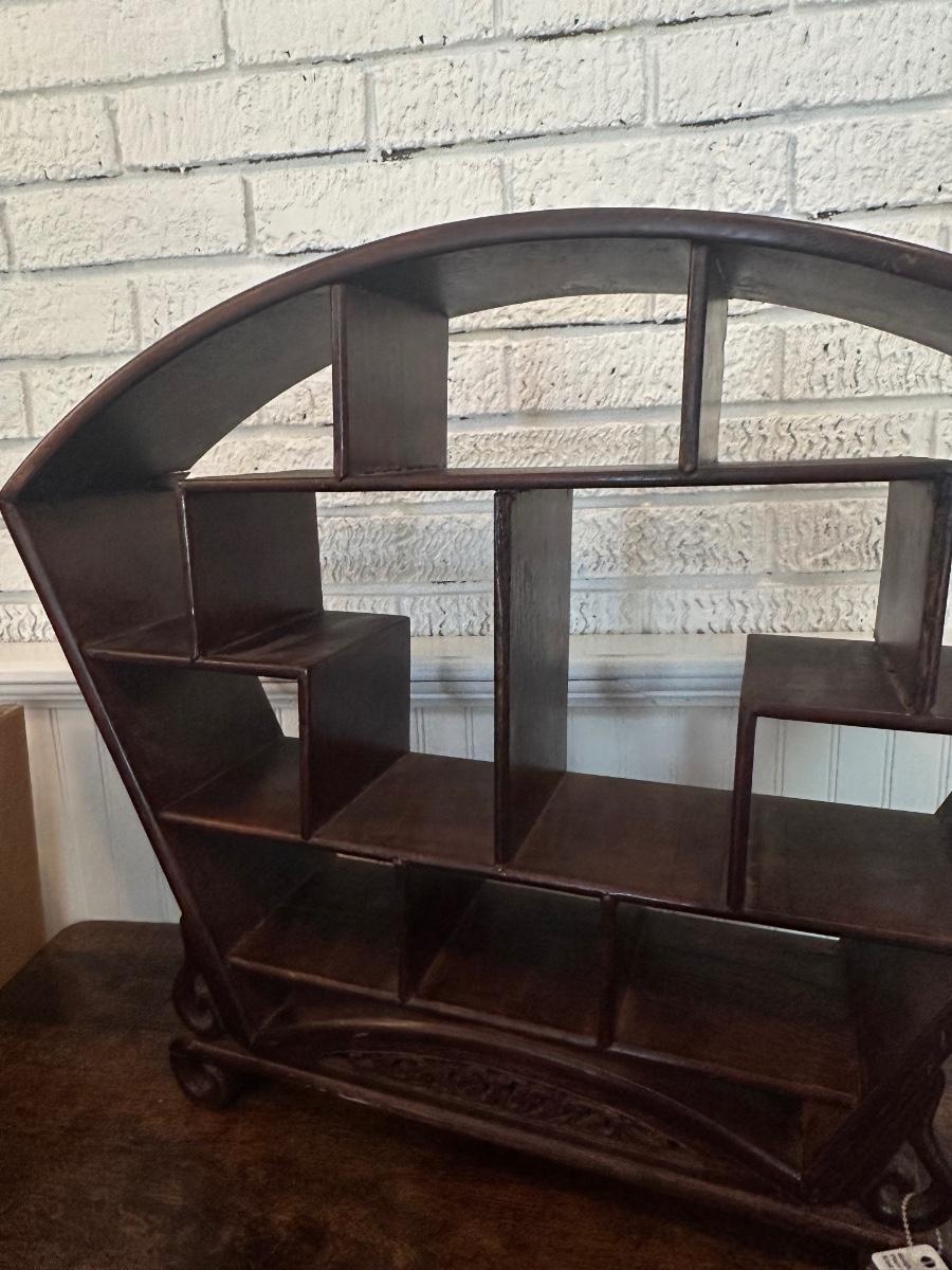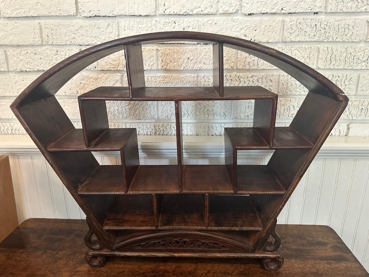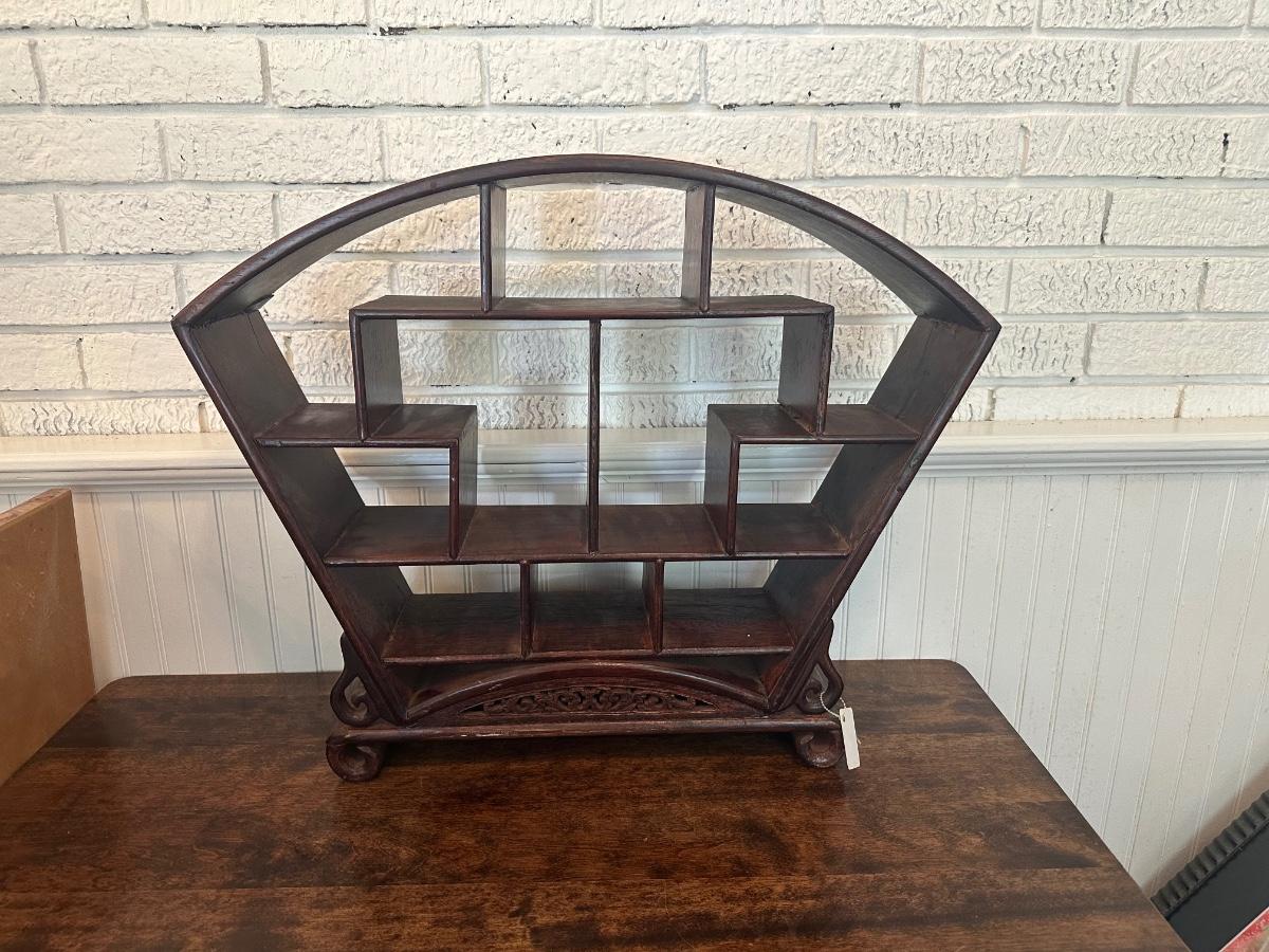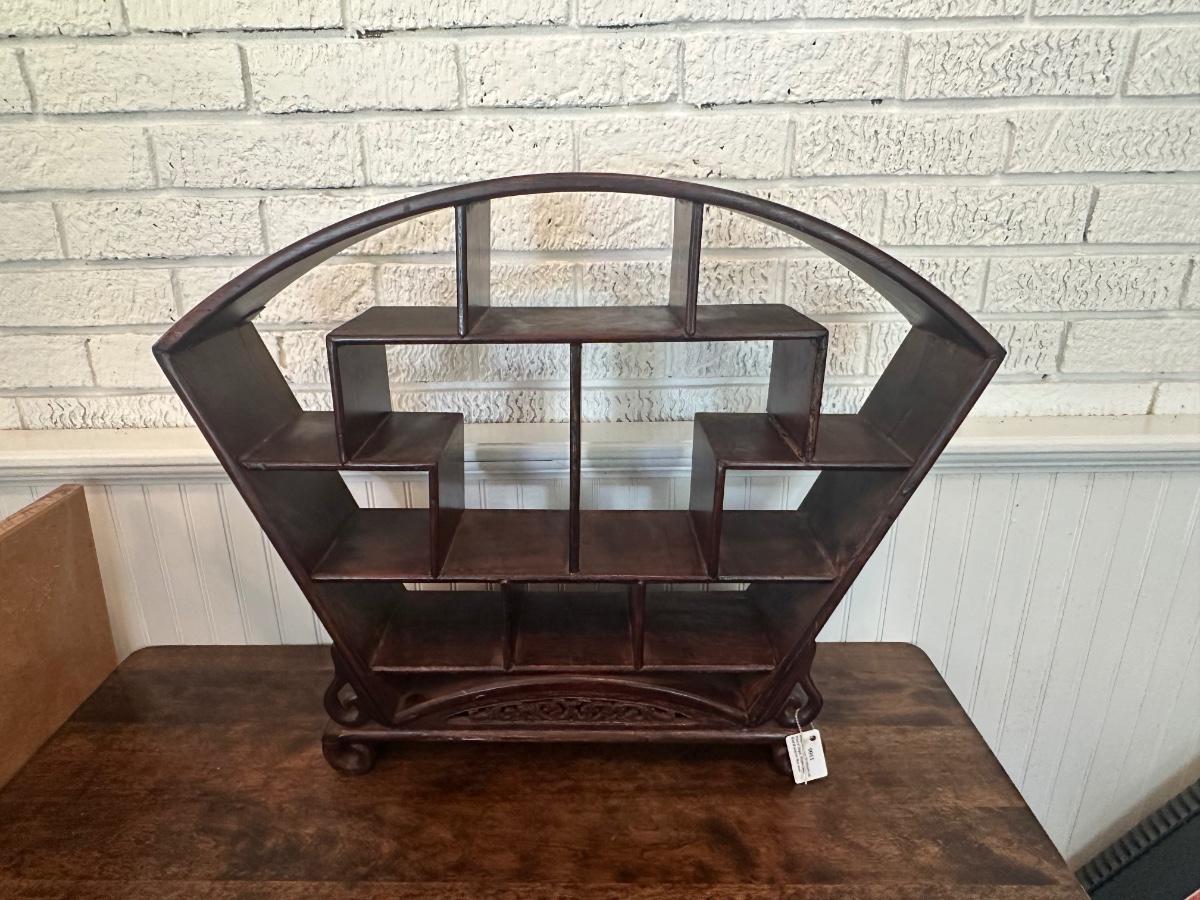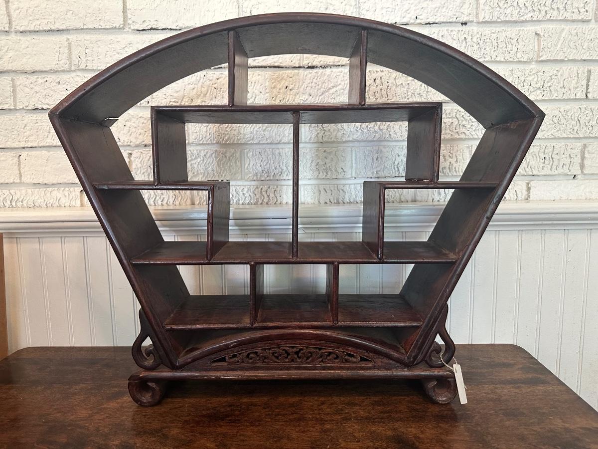 Fan-shaped Asian-style display shelf with open compartments and carved base. Tag indicates rosewood. Notable cracking and separation at top joints and surface wear.