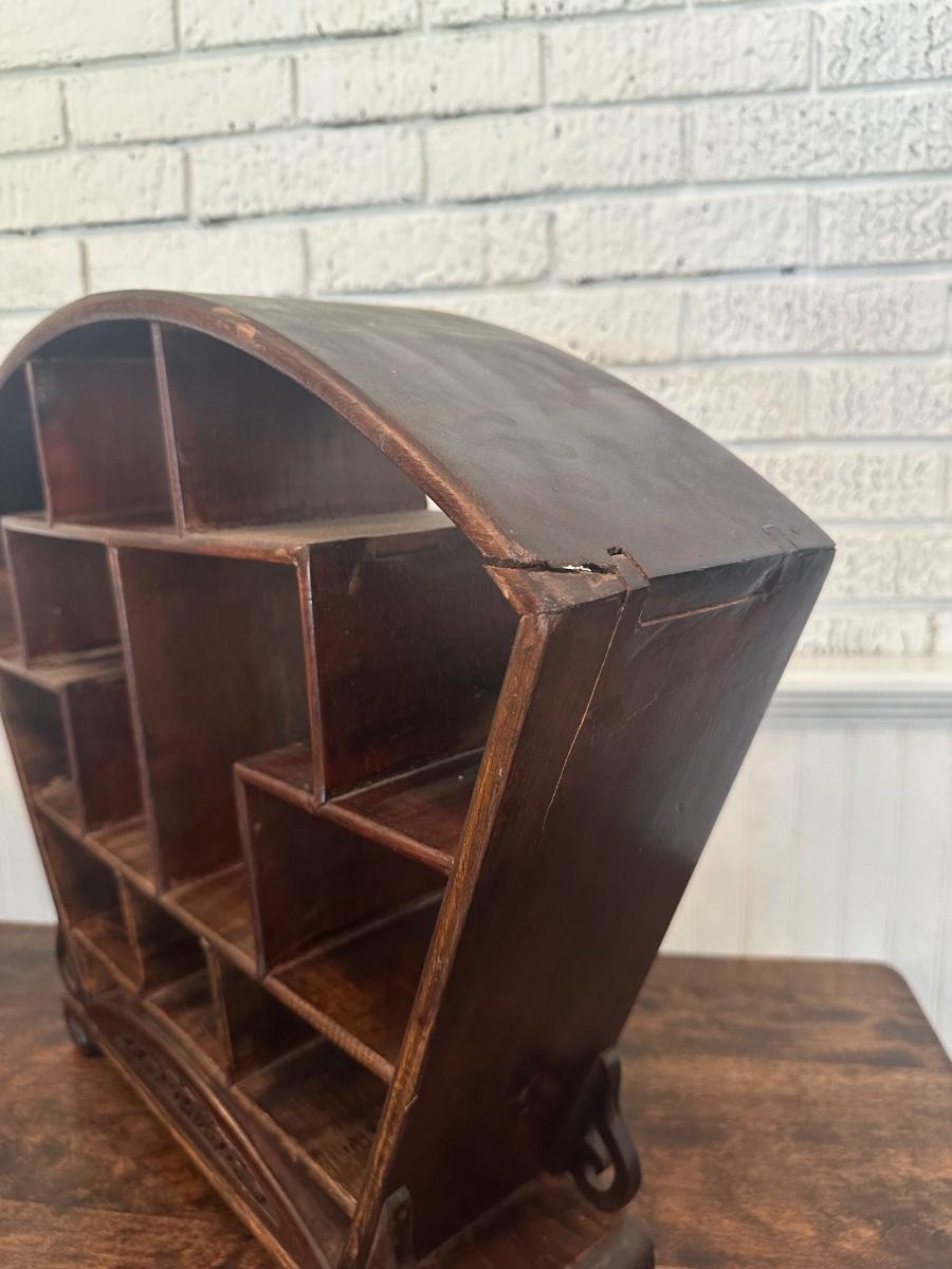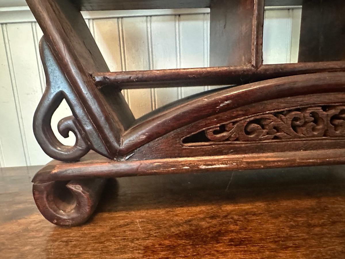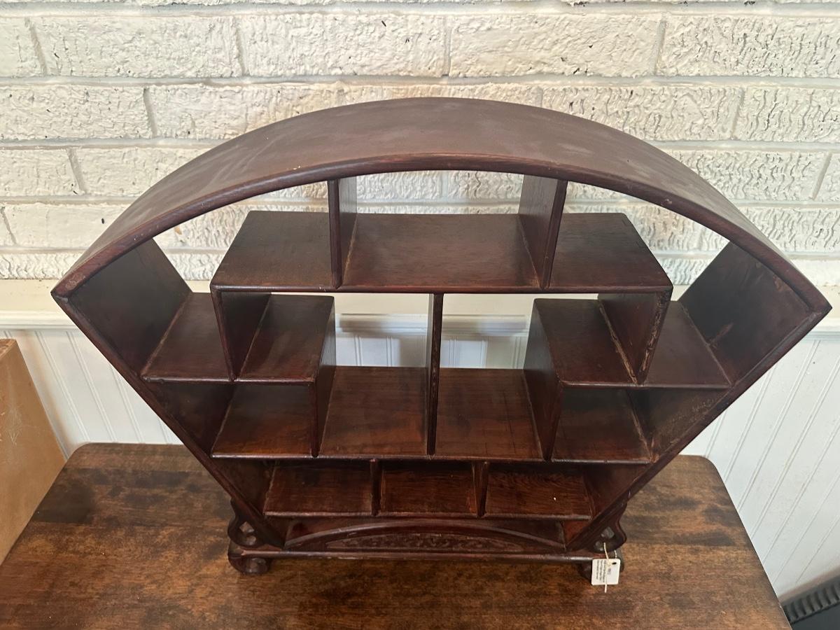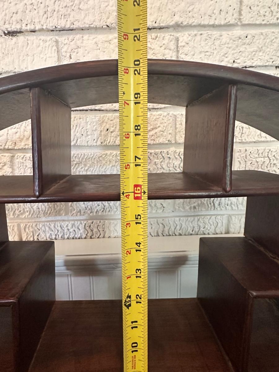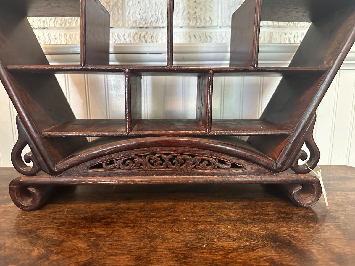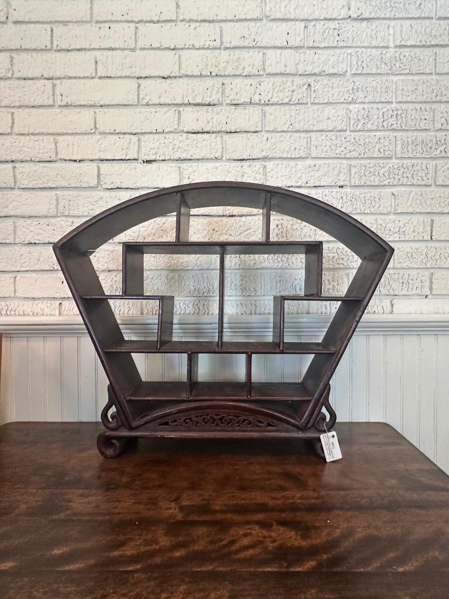 Fan-shaped Asian-style display shelf with open compartments and carved base. Tag indicates rosewood. Notable cracking and separation at top joints and surface wear.