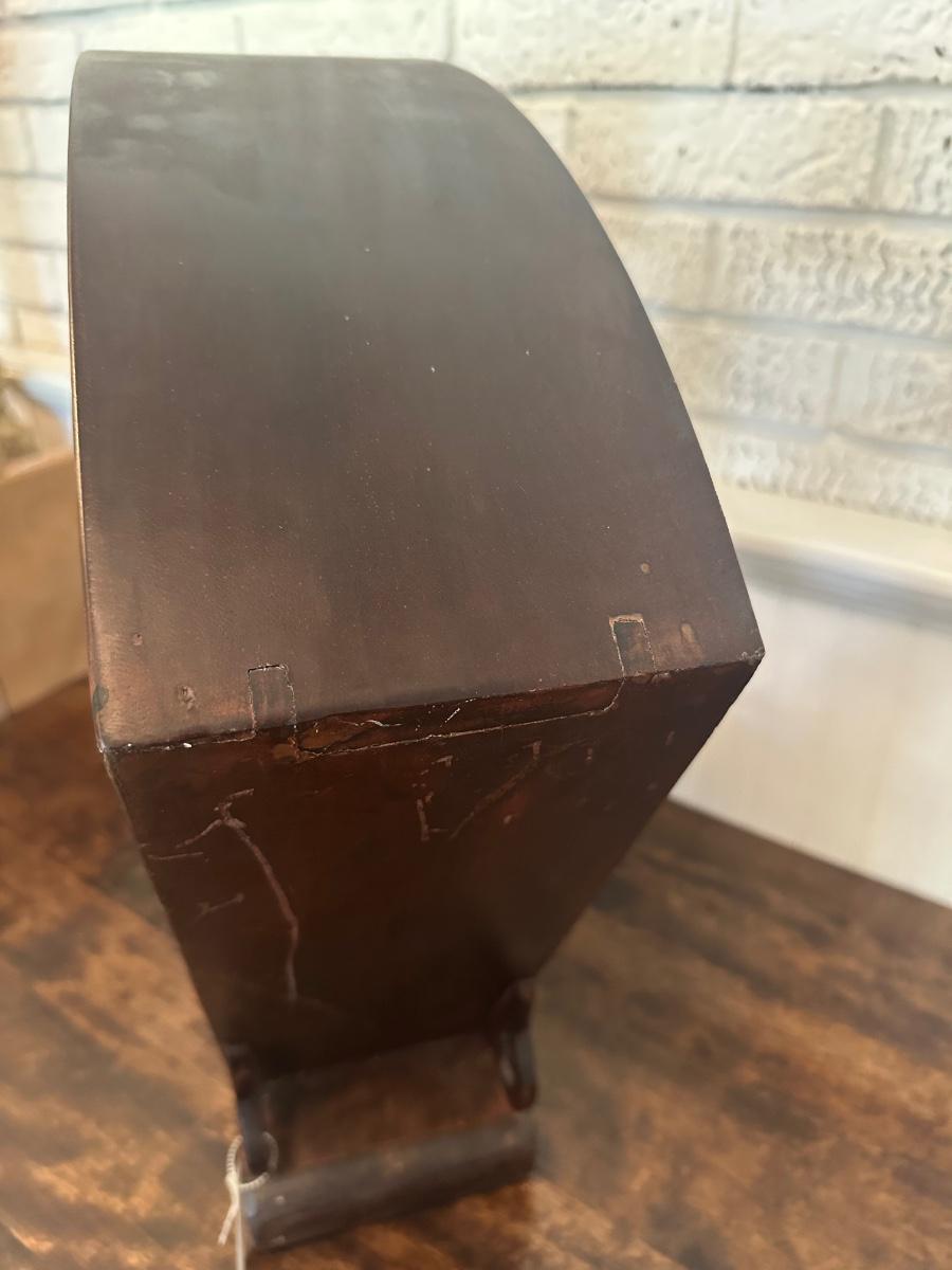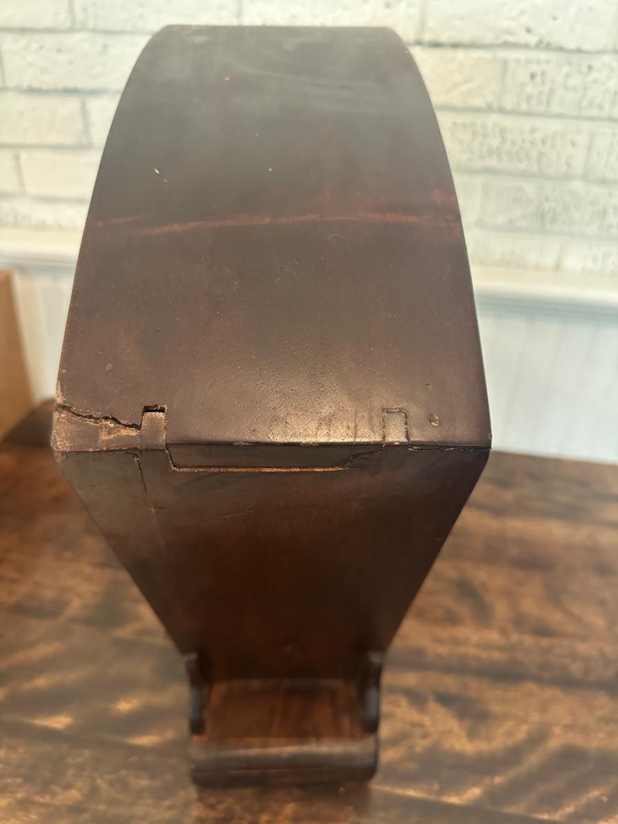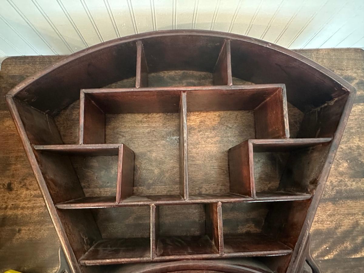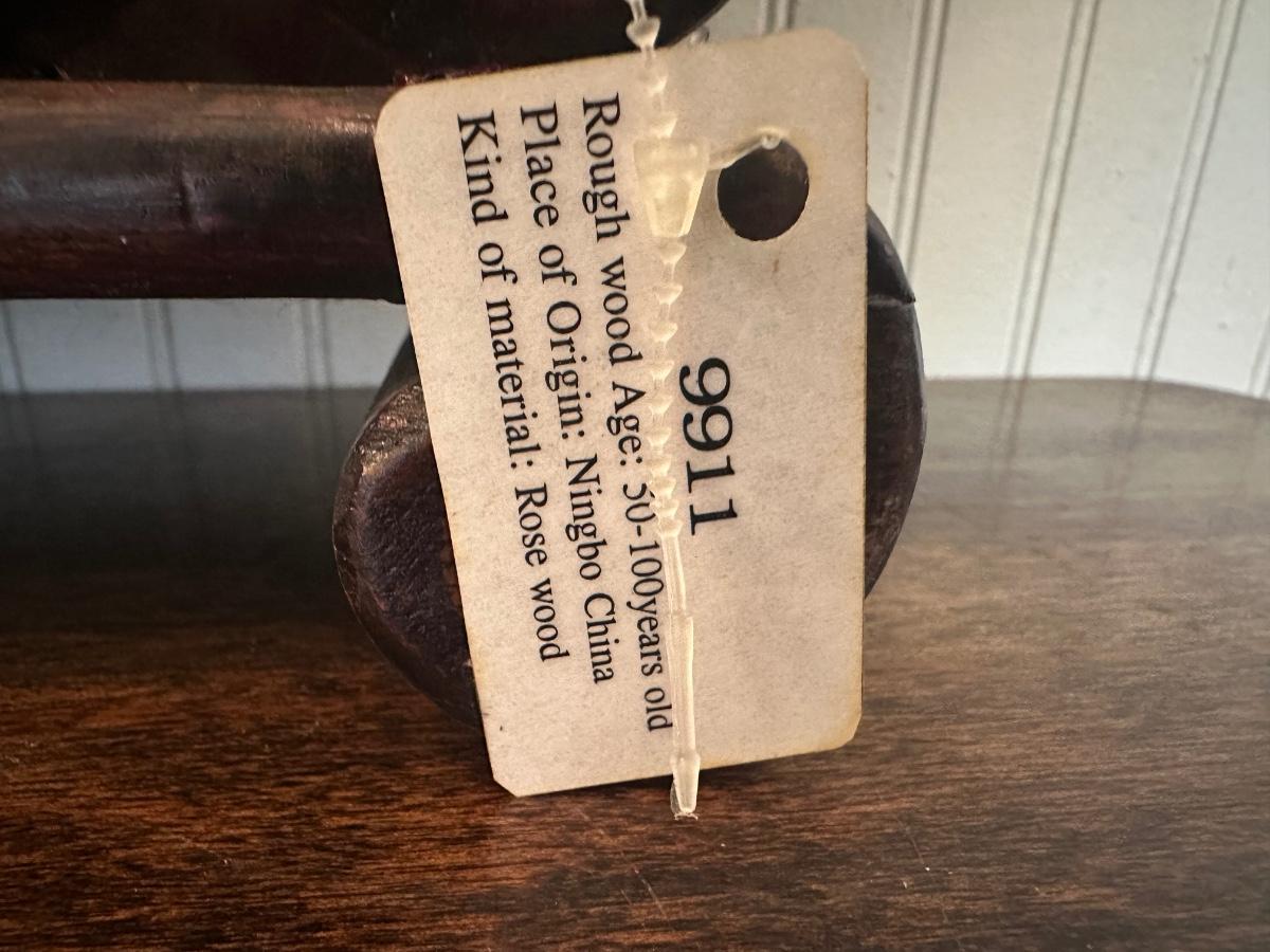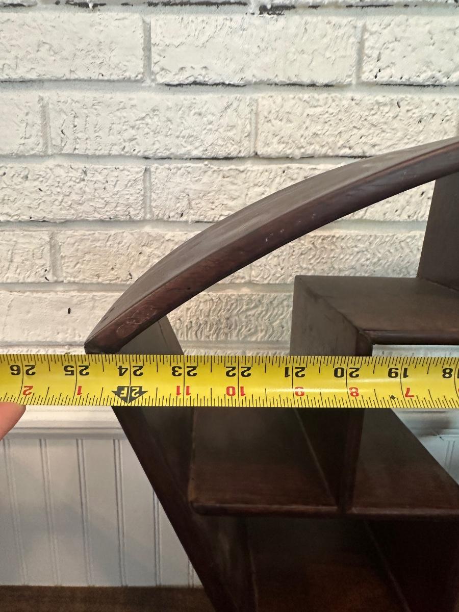 Fan-shaped Asian-style display shelf with open compartments and carved base. Tag indicates rosewood. Notable cracking and separation at top joints and surface wear.