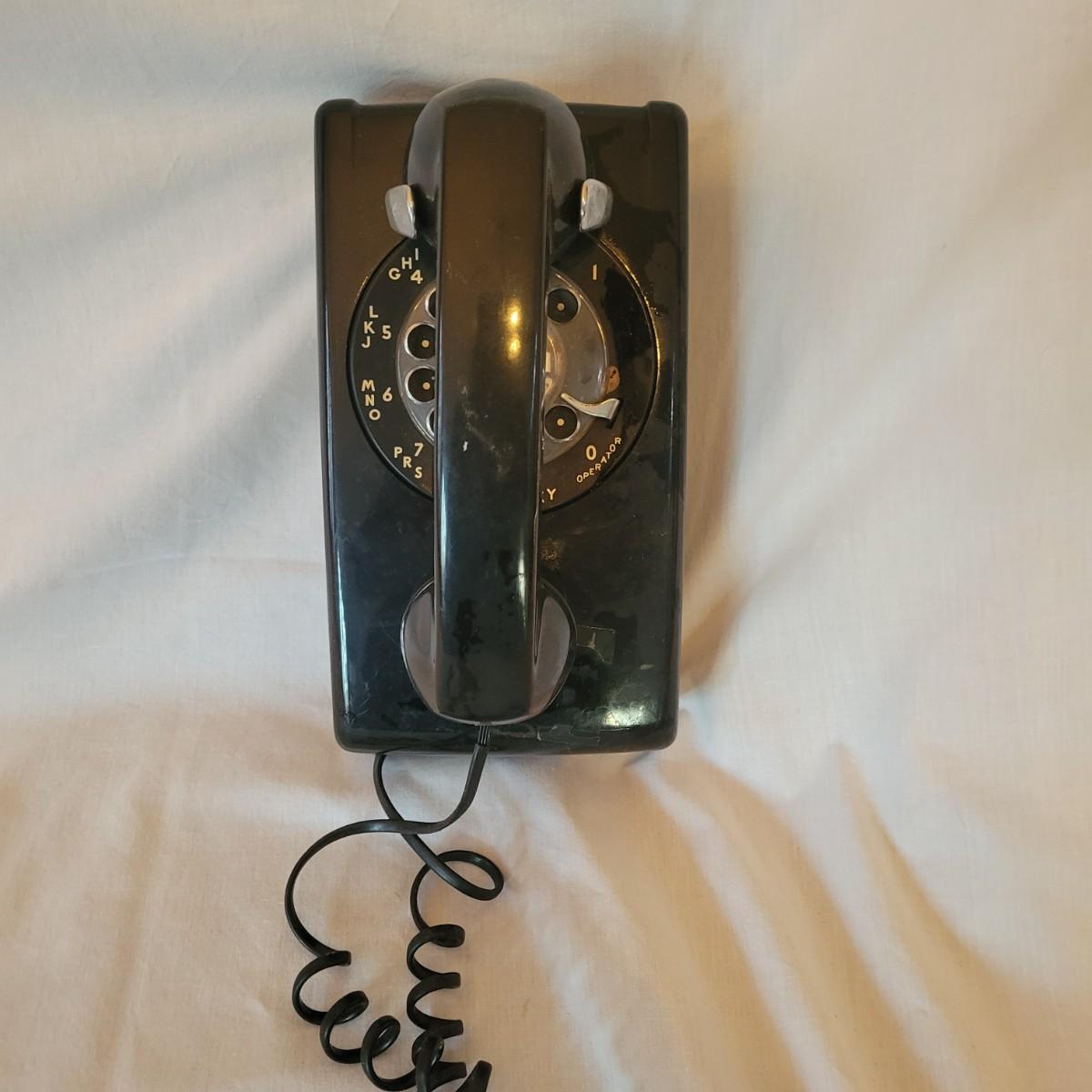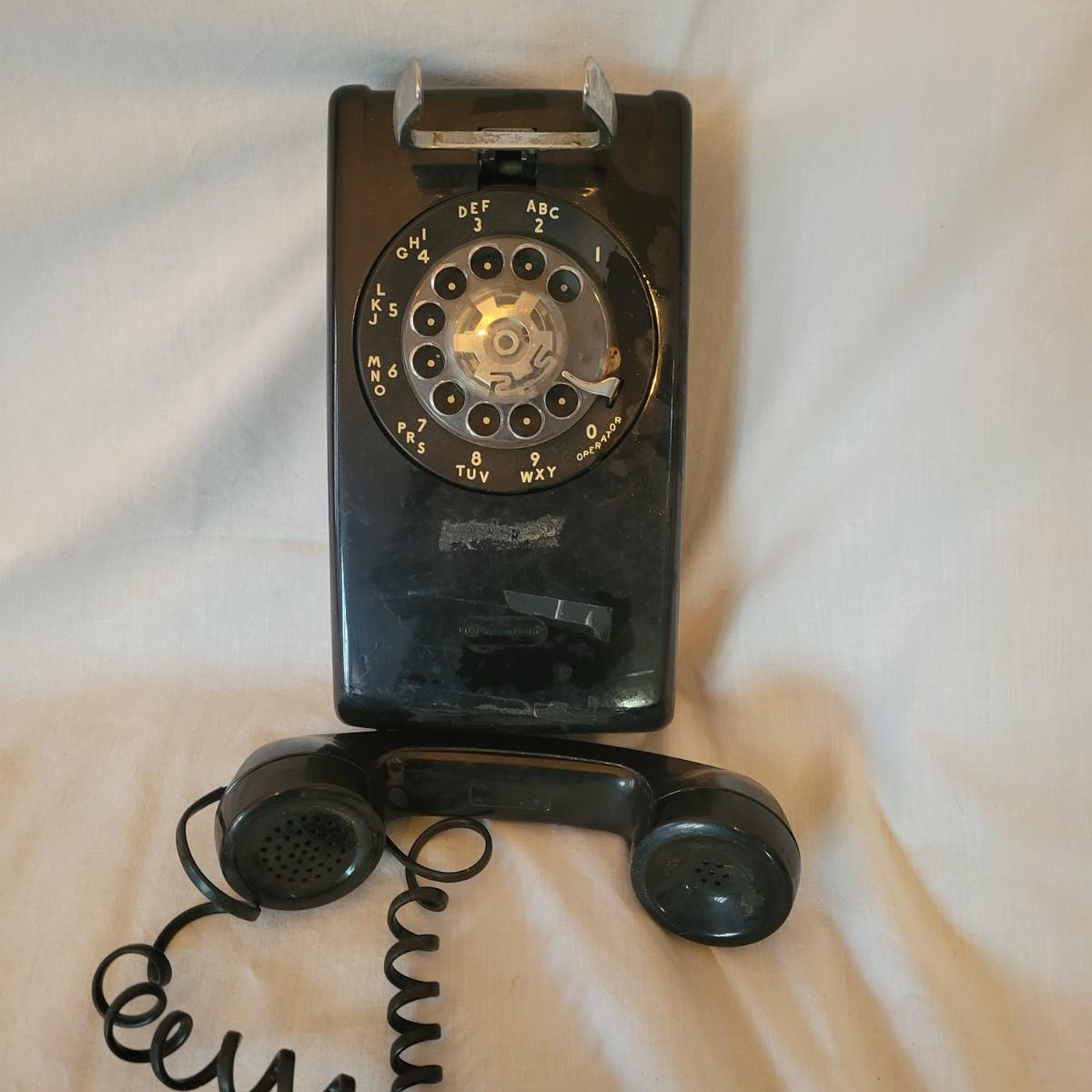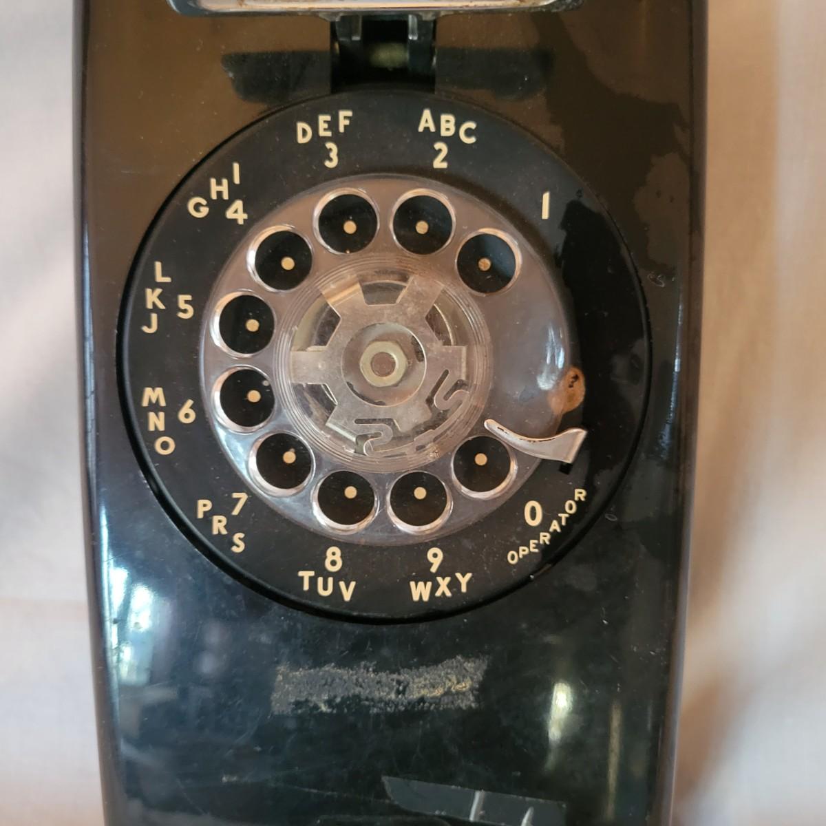 A vintage rotary dial phone. Item could not be plugged in to test. Measures approximately 5.5" x 5.5" x 9.5"H. Shipping available