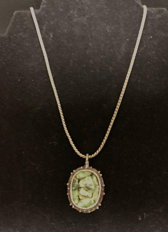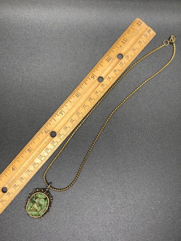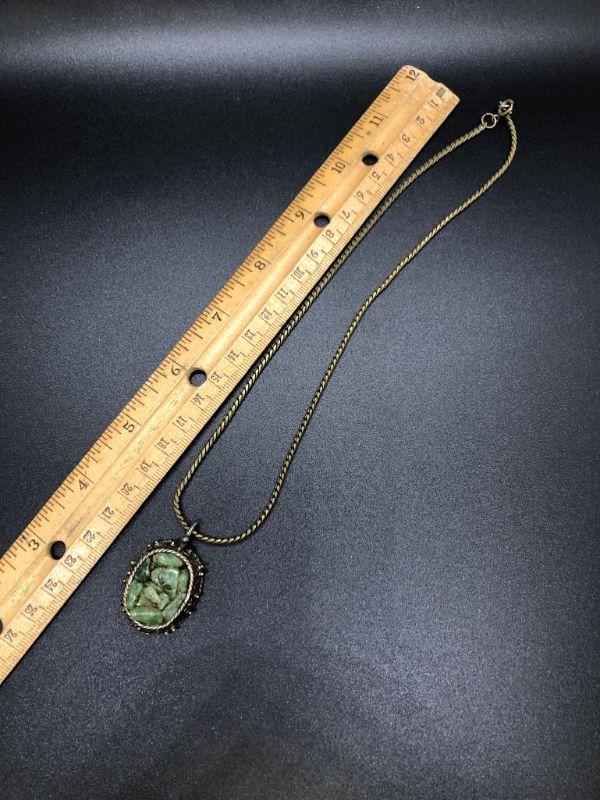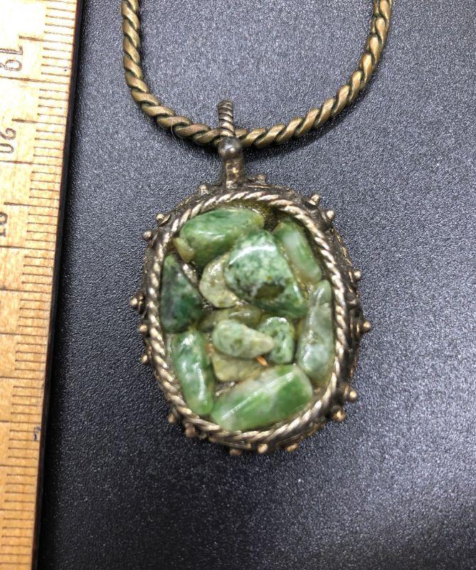 Vintage rough polish stone cluster pendant on chain. Gold tone metal. Green stone has a green turquoise or aventurine look to it. Needs to be cleaned a little. About 9" total length.
