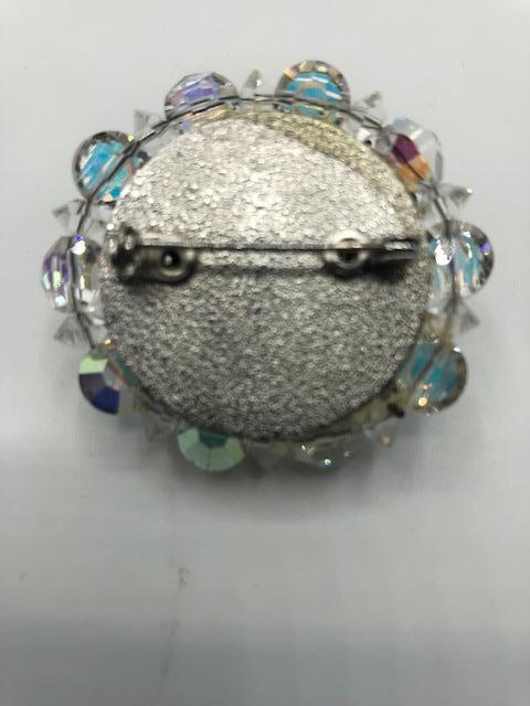 Vintage stle beaded brooch. AB crystal beads. Round shape is about 1.75" across. Great colorful sparkle at all angles.