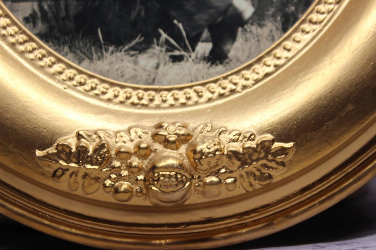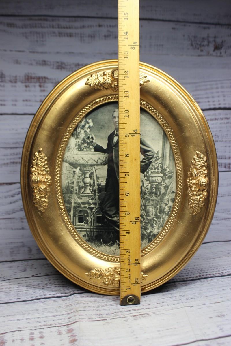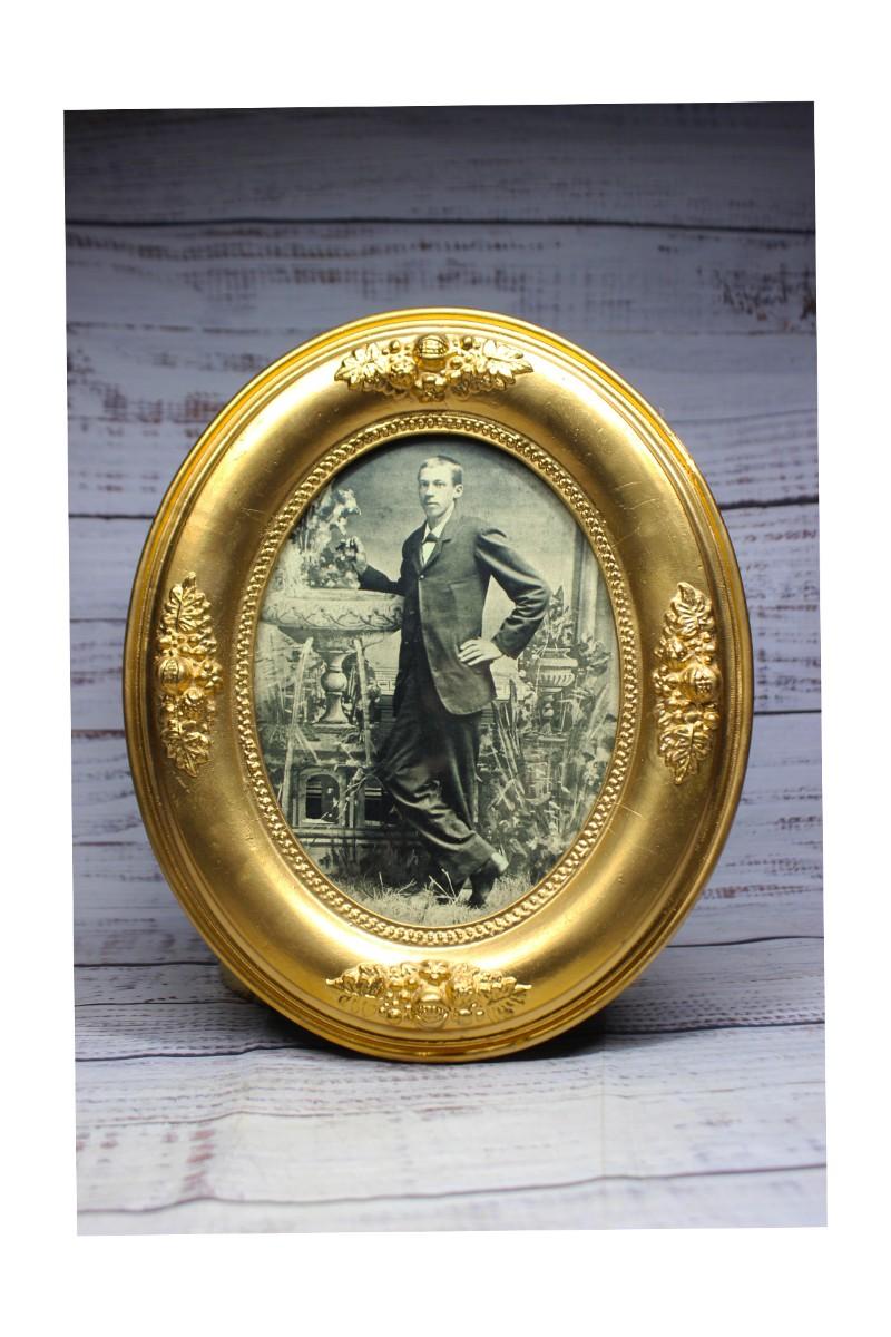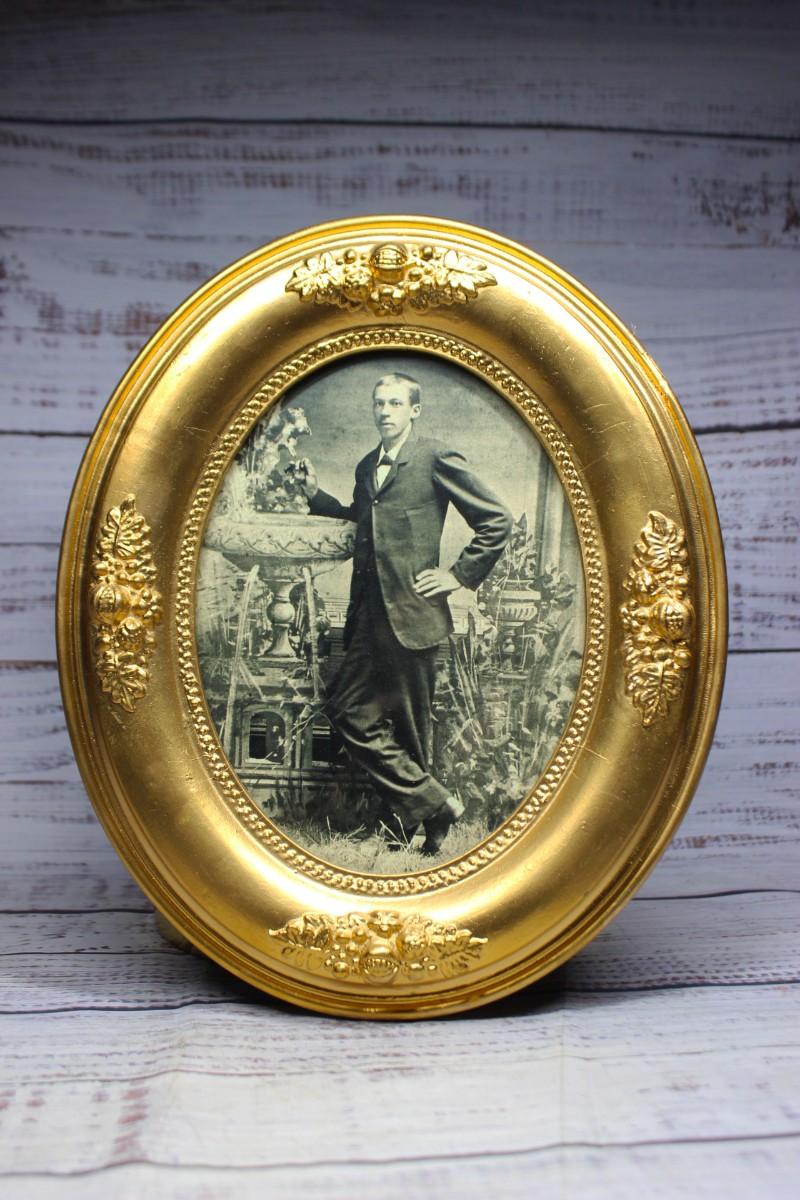 Vintage Round Gold Framed Print of an Edwardian Gentleman, there are no cracks or chips to the frame and protective glass and is in good vintage condition. The photograph is a printed reproduction of a photo, check pictures for more details and for sizing.