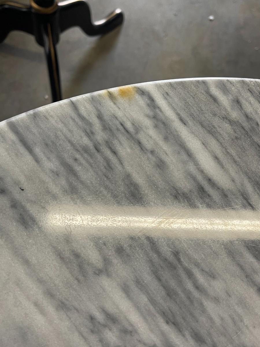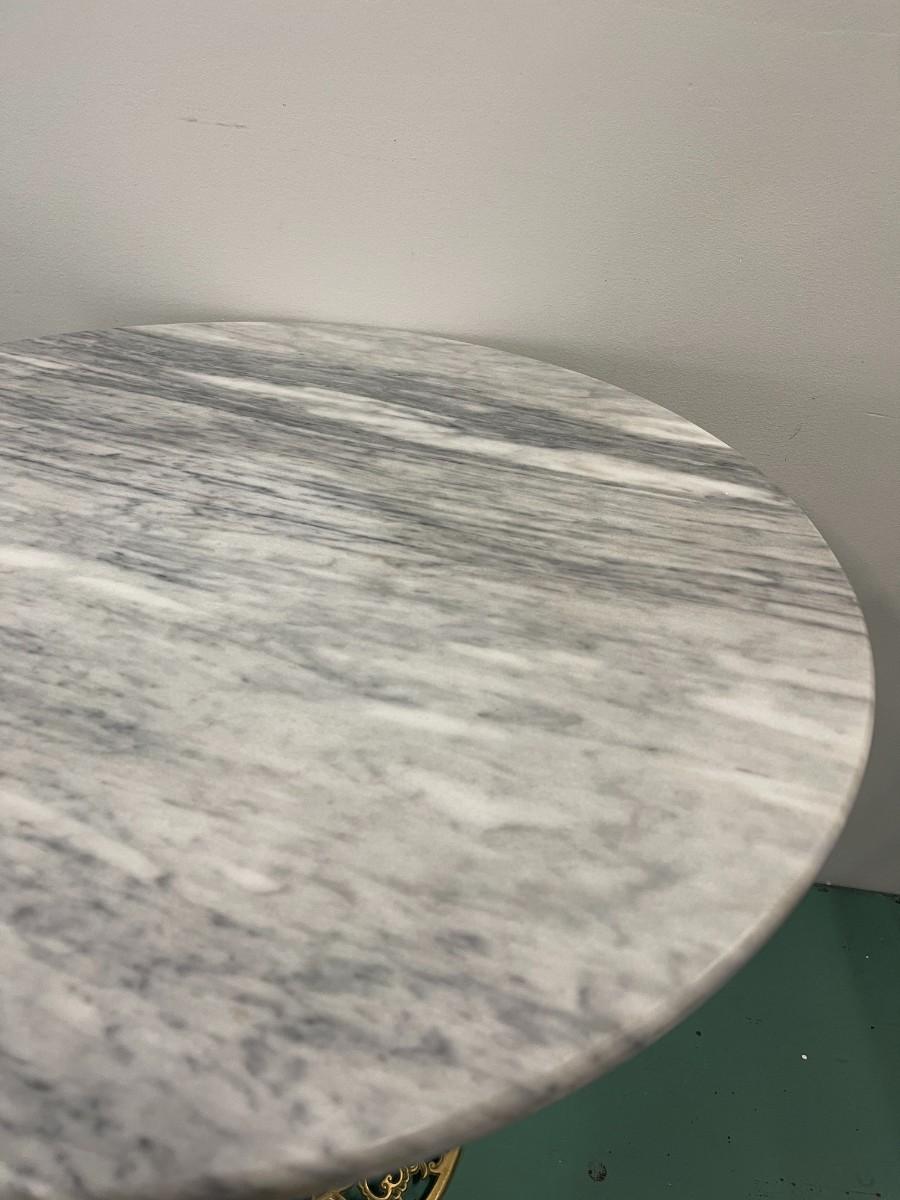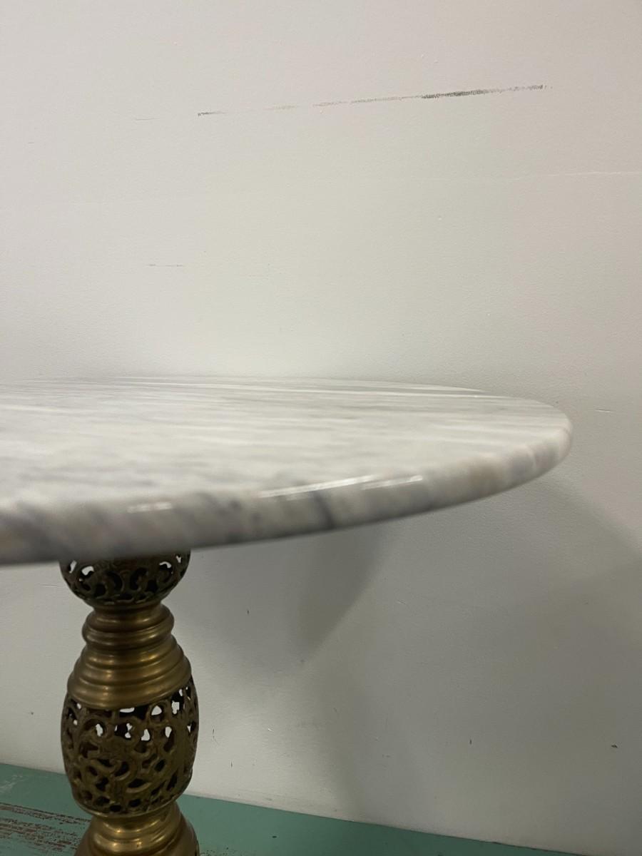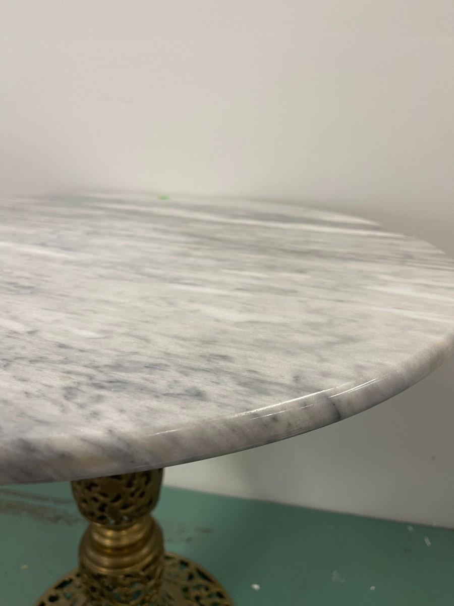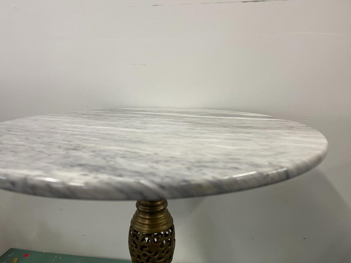 Vintage round marble accent table with pierced brass base. Excellent condition. 24" diameter x 21 1/4" high. Please examine photos for condition, there appears to be a small stain on the marble but no chips or cracks.