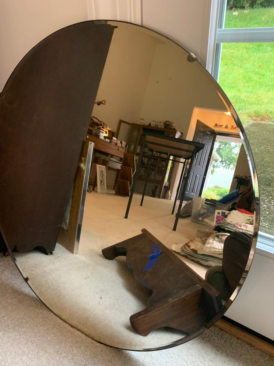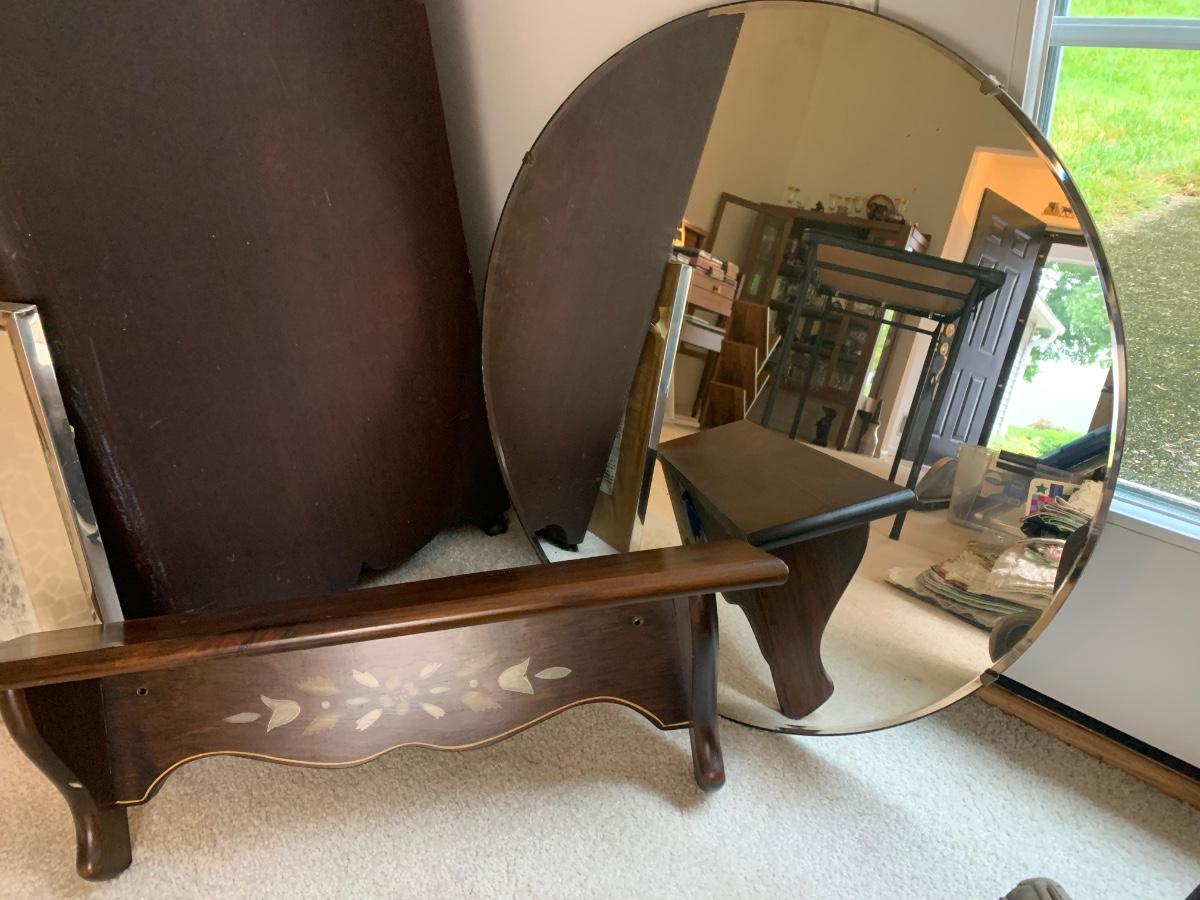 Vintage Round Mirror & Wood Wall Shelf