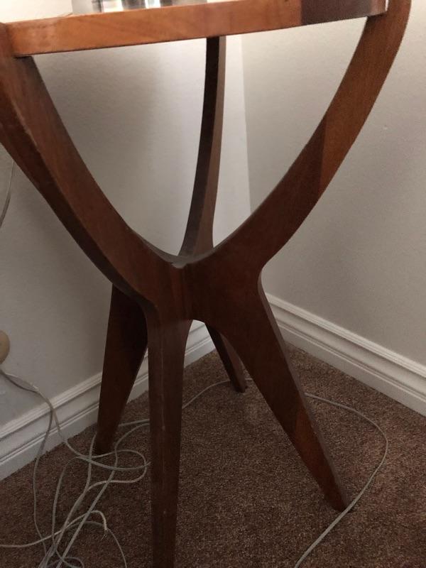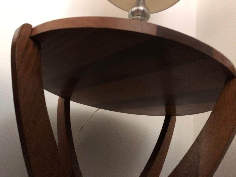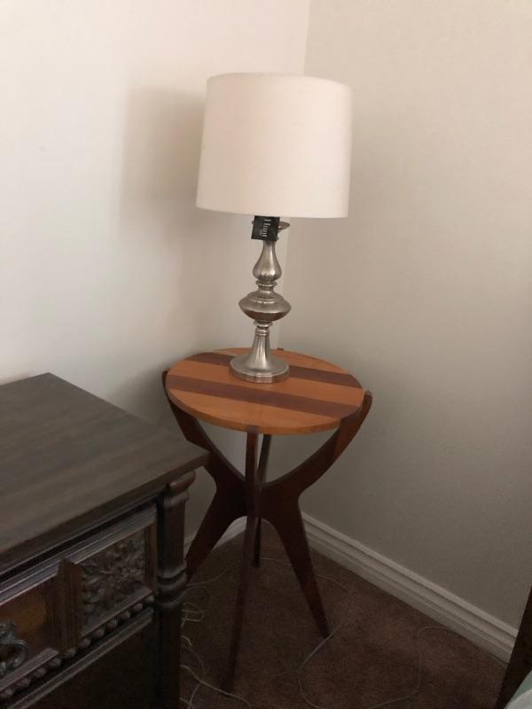 Vintage round wood side table. Has a MidCentury Atomic look to it. No makers mark or label. The top is two toned and is removeable. Measures about 20" across and 29" tall.