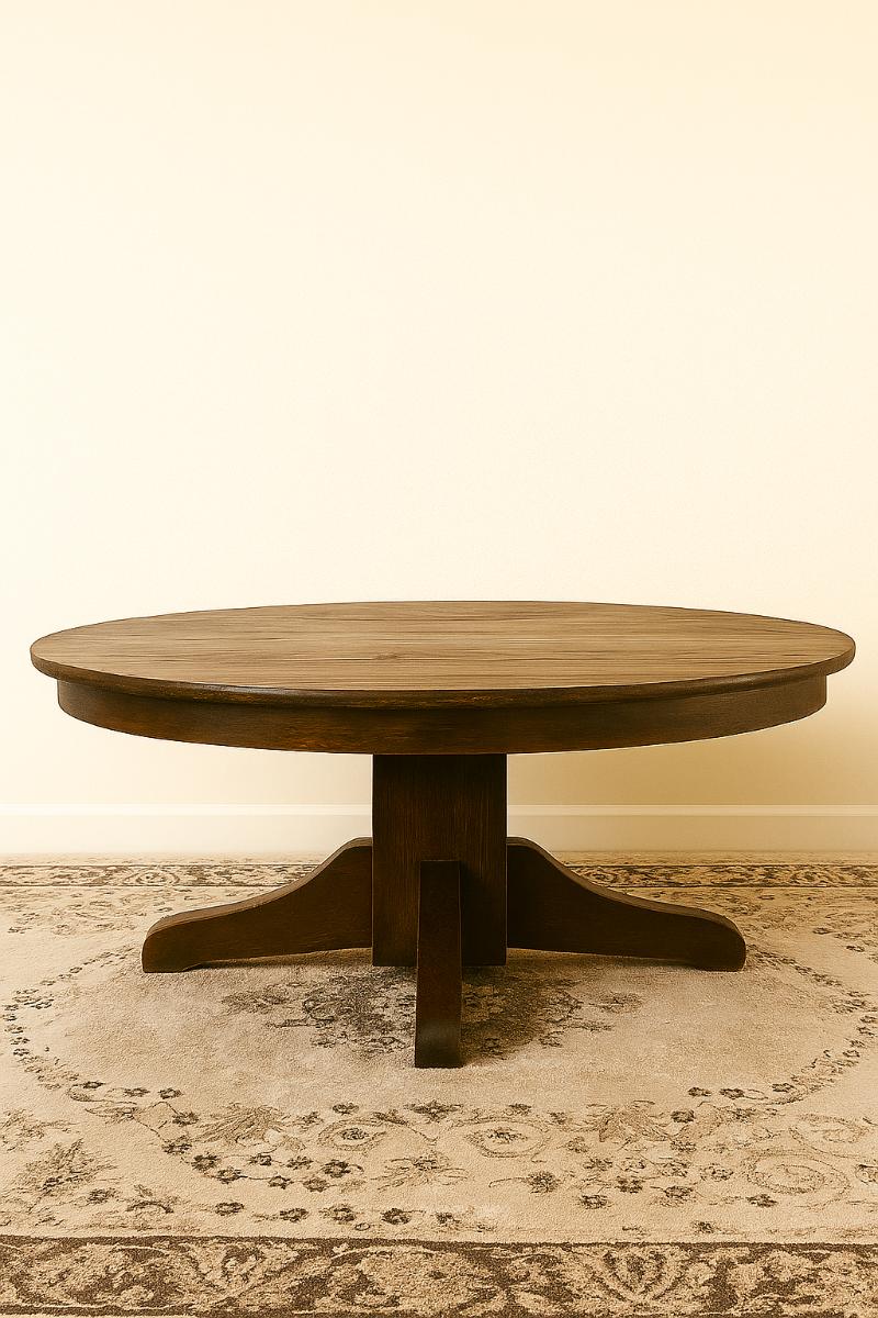 This classic round coffee table features a rich dark wood finish and a solid pedestal base with curved feet for added stability and charm. Its timeless silhouette pairs well with both traditional and transitional décor styles. Whether used as a central piece in your living room or a cozy nook accent, it offers both function and rustic elegance.