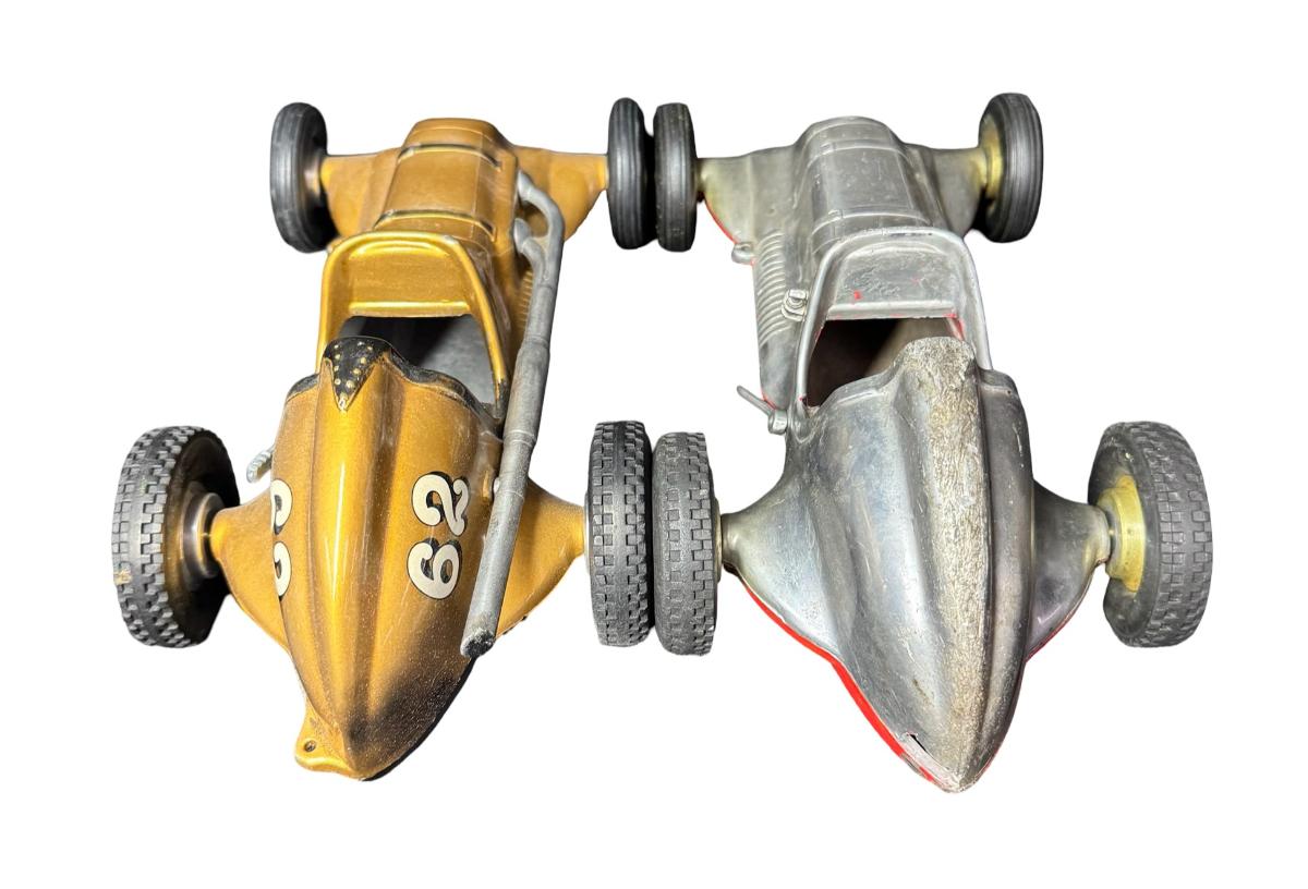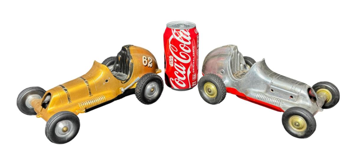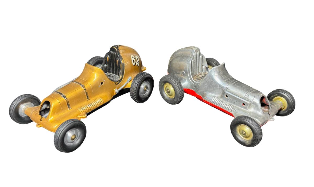Includes two tether cars from the 1940s to 1950s. There is use-related wear, including some missing parts. These may or may not have been repainted. Measurement: 8”L (approximate, each). Pre-auction estimate: $250-$450. [JL]