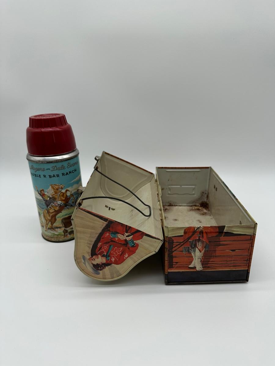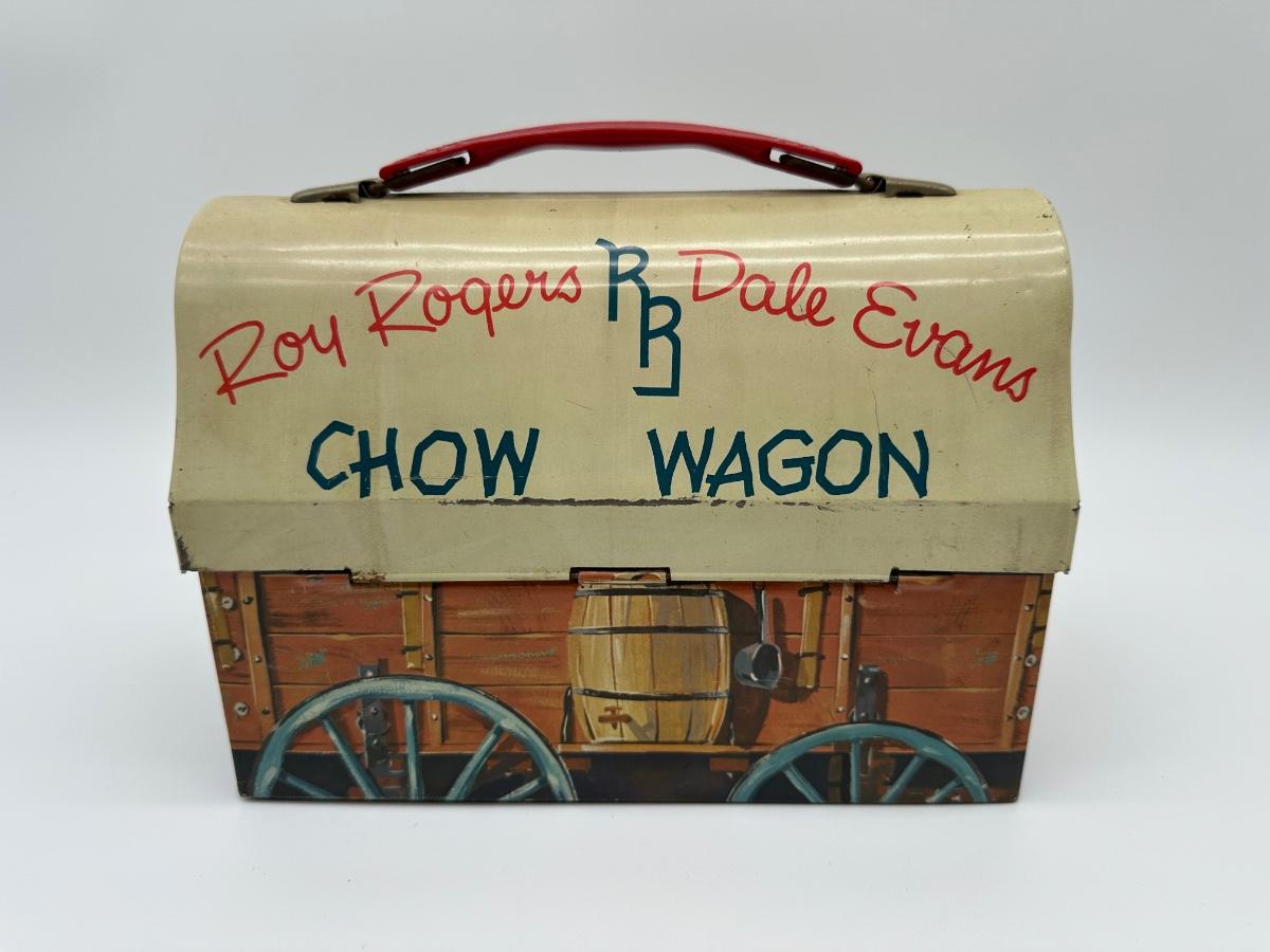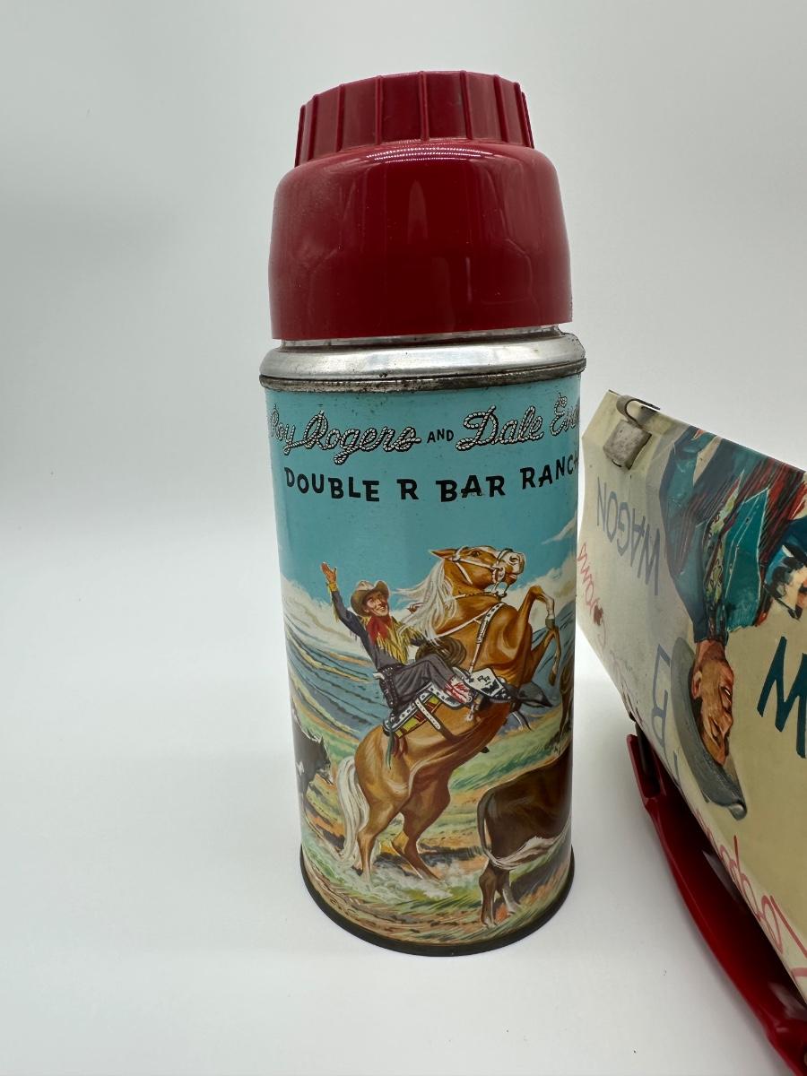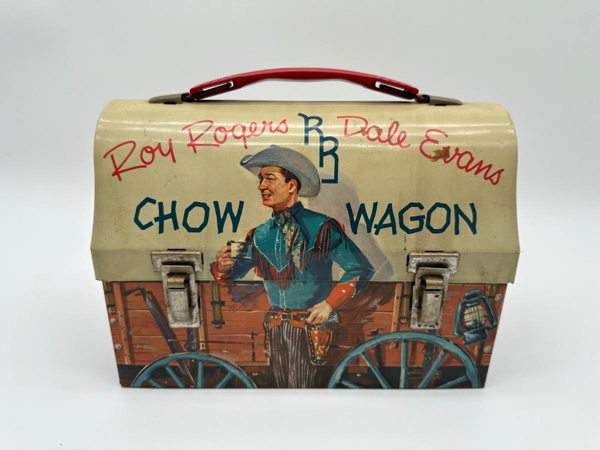 Original vintage Roy Rogers and Dale Evans Chow Wagon metal lunchbox with matching thermos. Classic western artwork featuring Roy Rogers and ranch imagery. Complete set with lid, latches, handle, and original thermos.